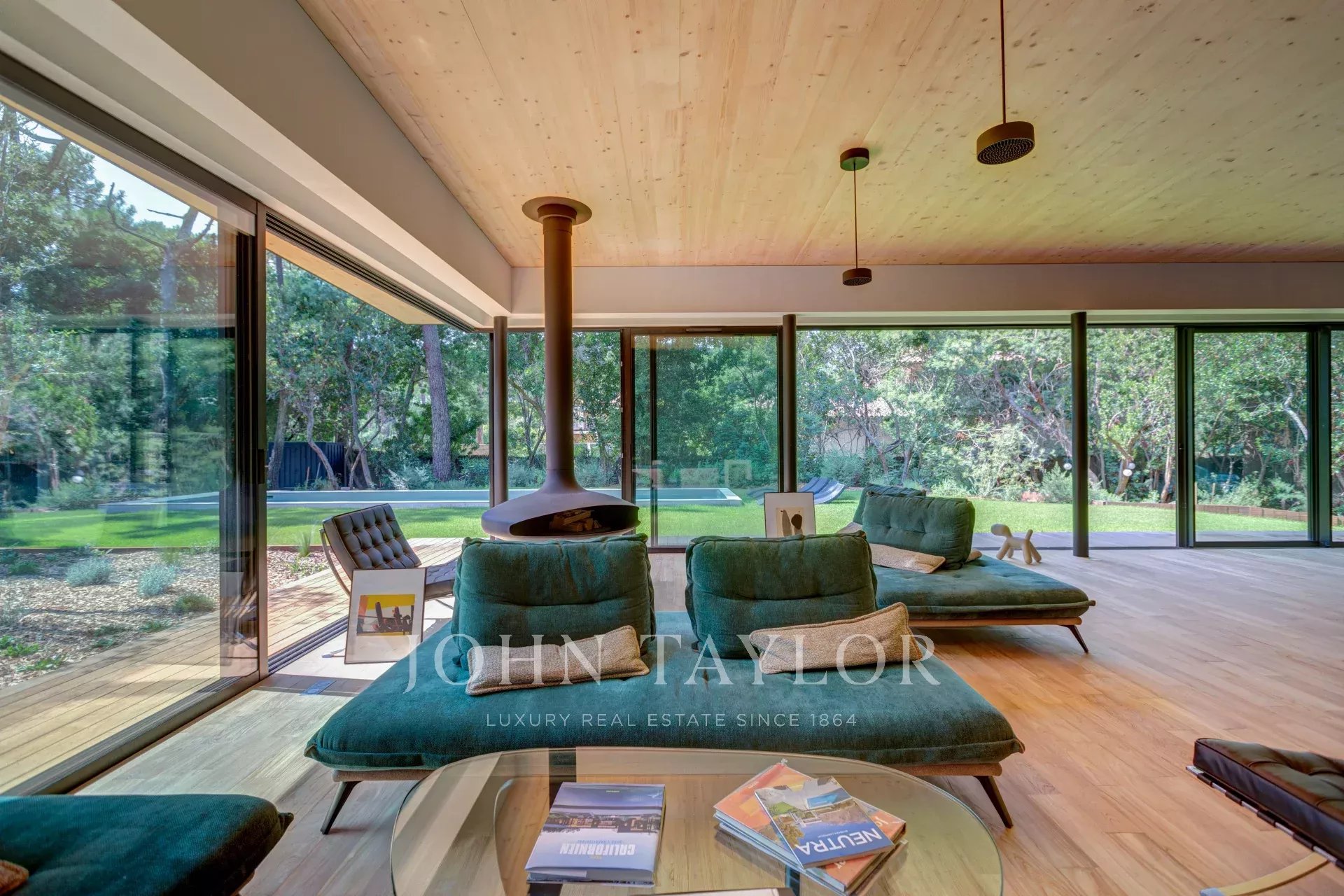 Interamente su un unico livello, la villa offre un ampio spazio abitativo inondato di luce naturale grazie alle sue grandi vetrate. Godetevi il suo comfort in ogni stagione: accoccolatevi accanto al camino nelle fresche serate autunnali o rilassatevi al sole estivo a bordo piscina.