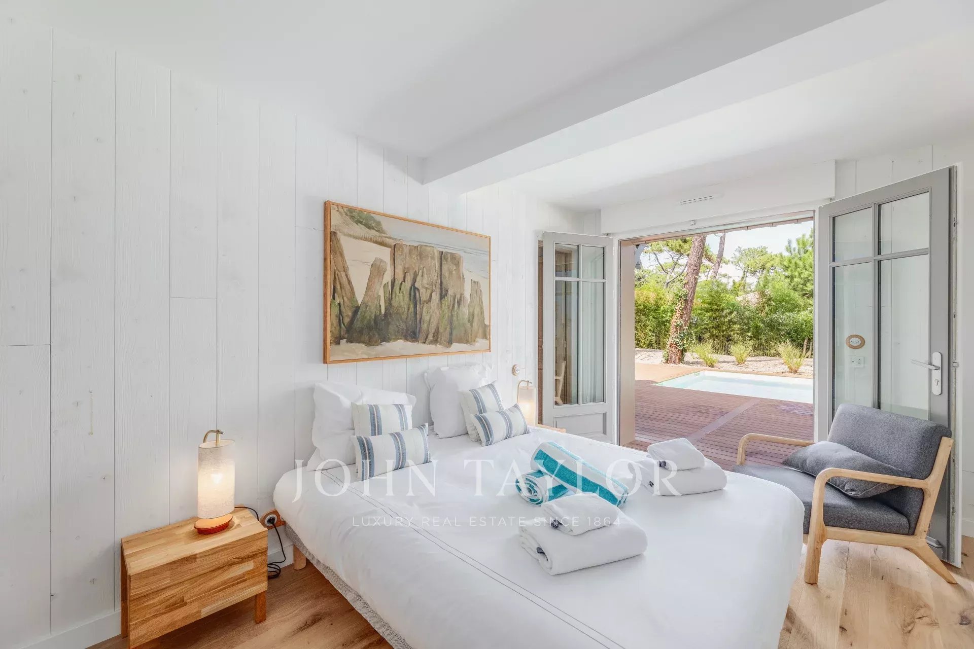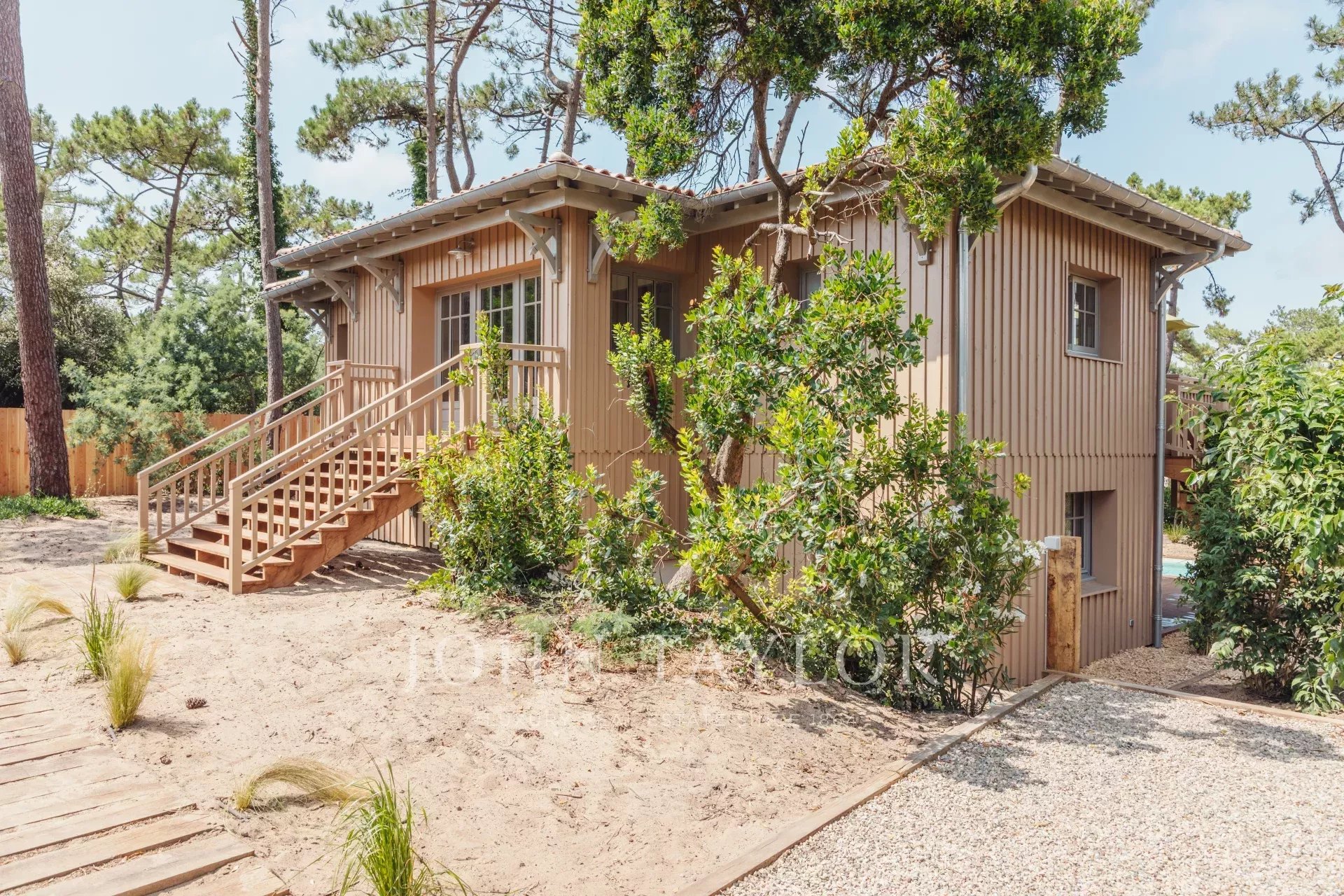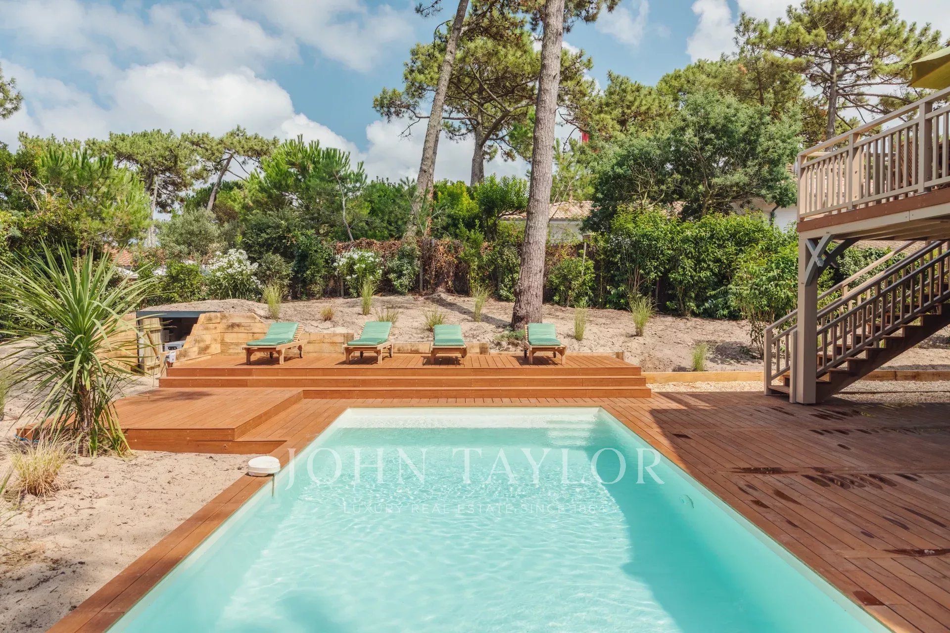 All'esterno, il giardino, tipico di Cap Ferret, è un vero angolo di verde dove si mescolano piante mediterranee e alberi locali. Al centro, una piscina riscaldata e soleggiata, circondata da lettini e salottini da giardino, crea lo spazio perfetto per godersi le calde giornate estive.