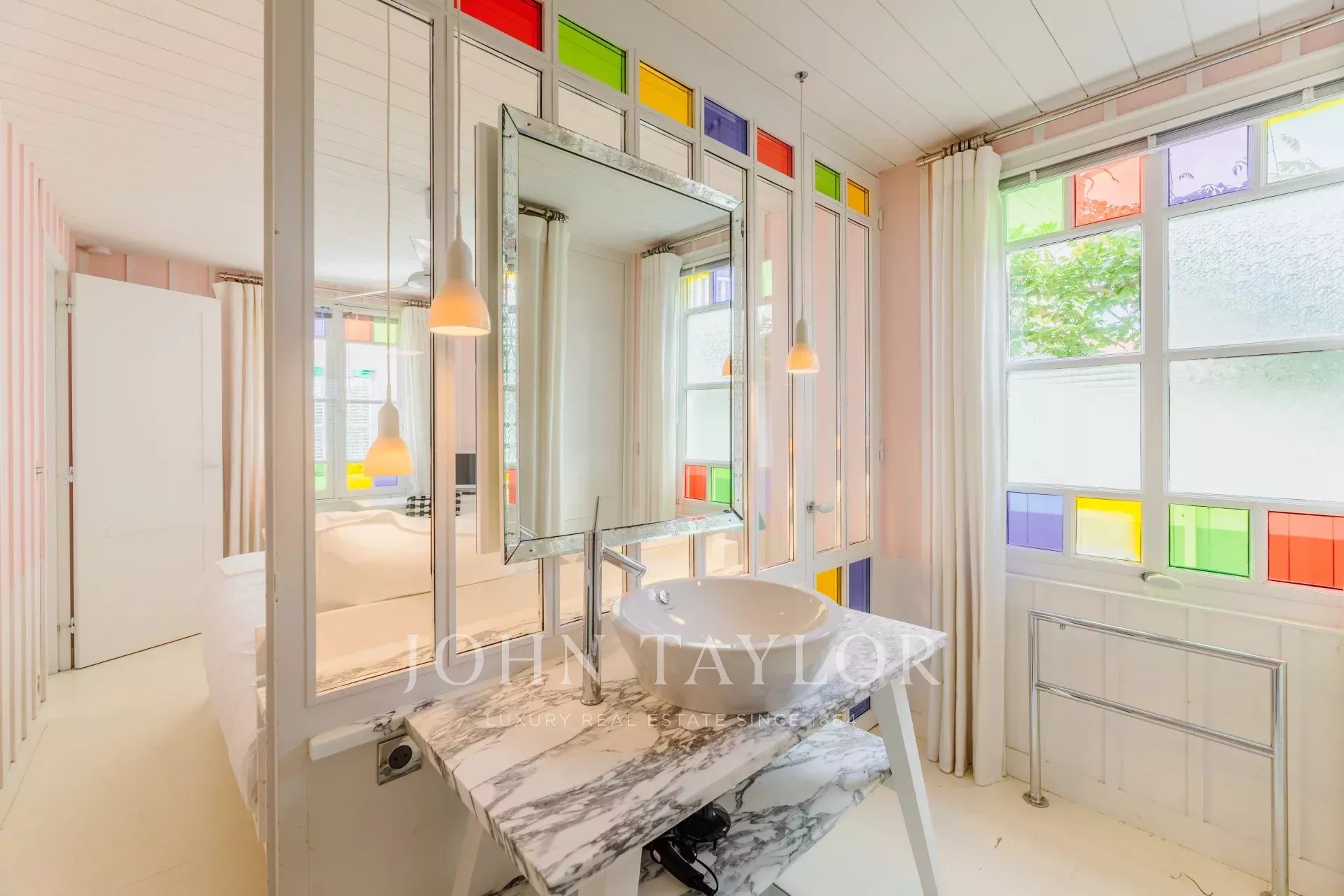 Erliegen Sie dem Charme dieser lebhaften Villa, die Pastelltöne mit Pop-Art-Inspiration verbindet, ein wahres Meisterwerk, entworfen von einem international renommierten Architekten.