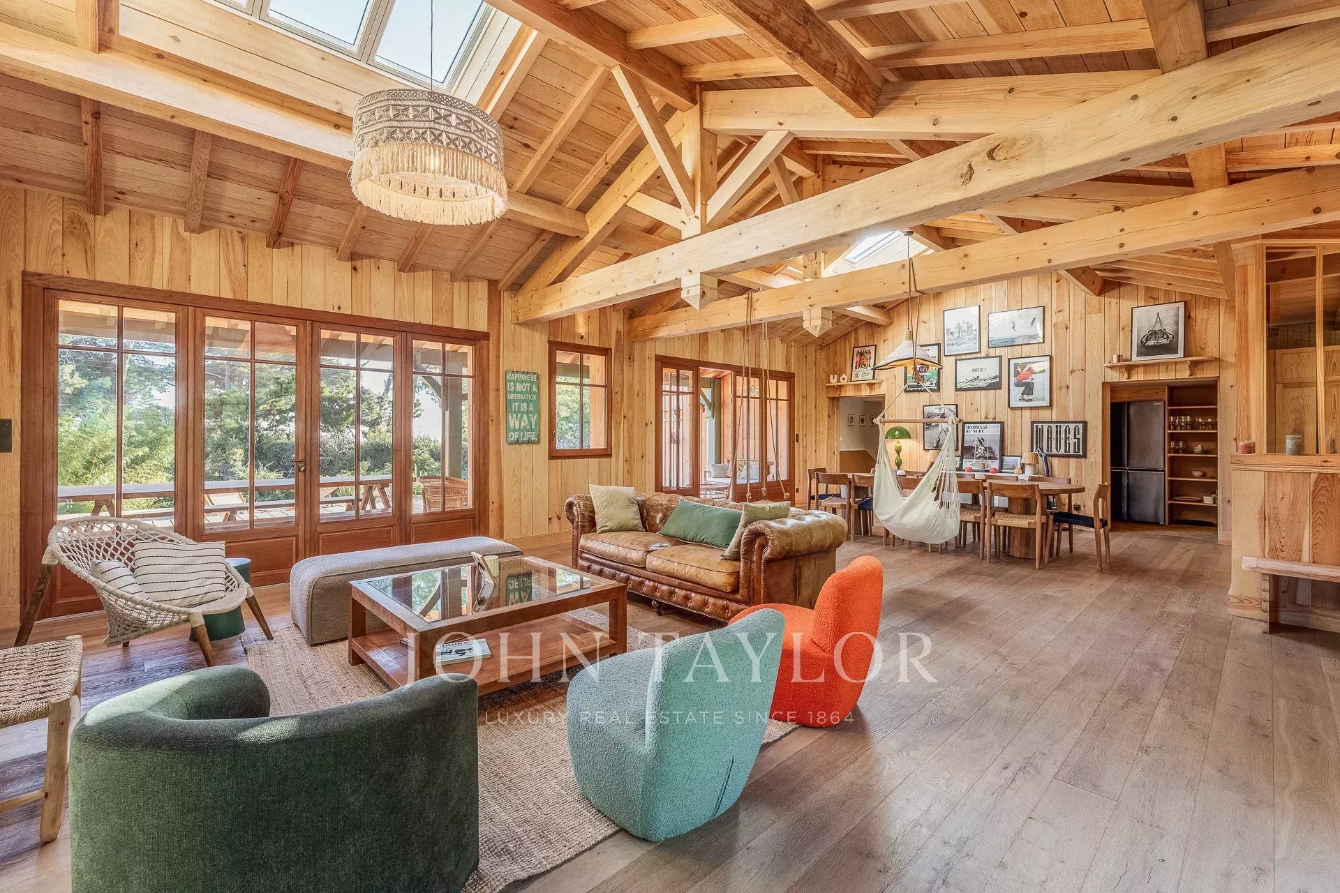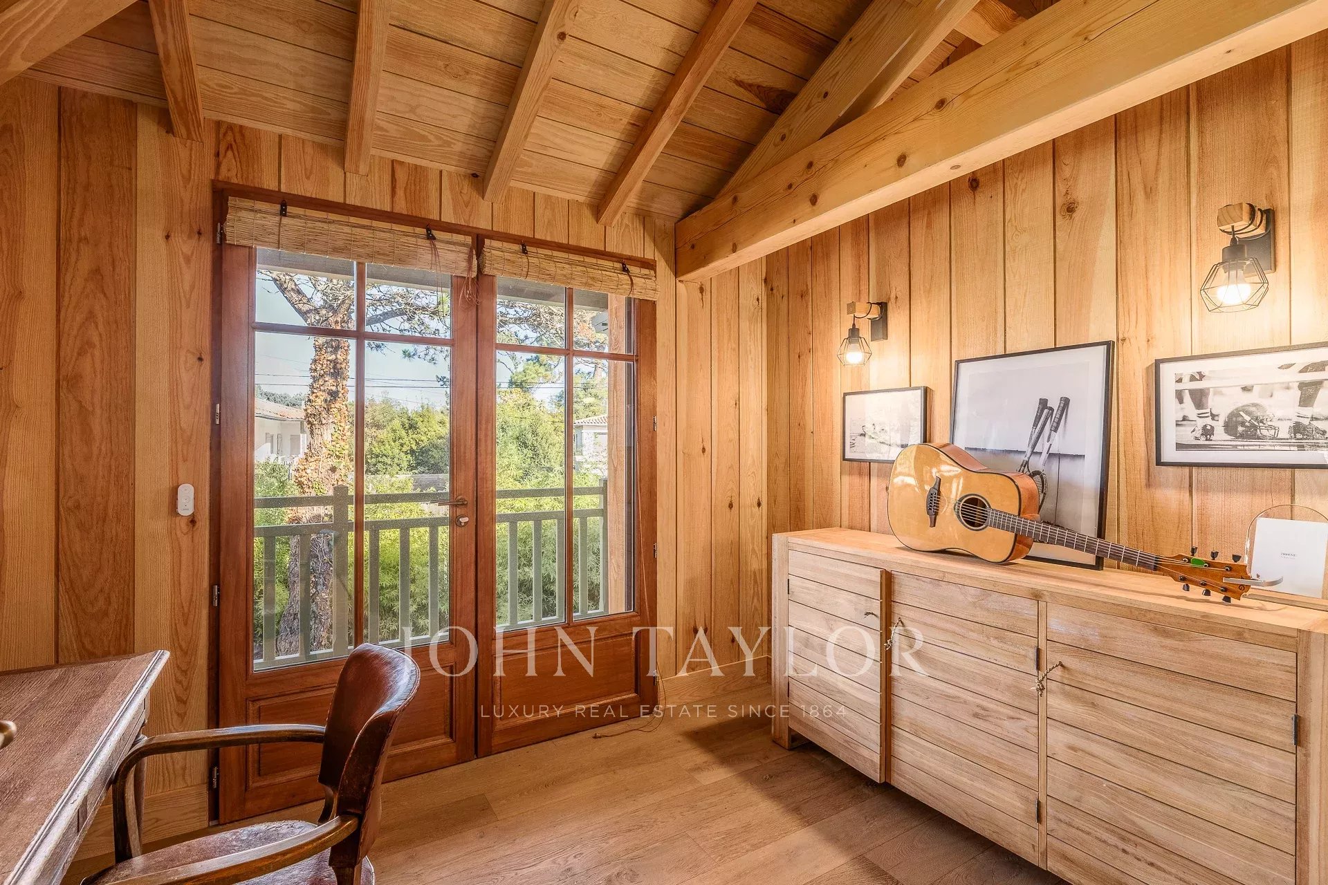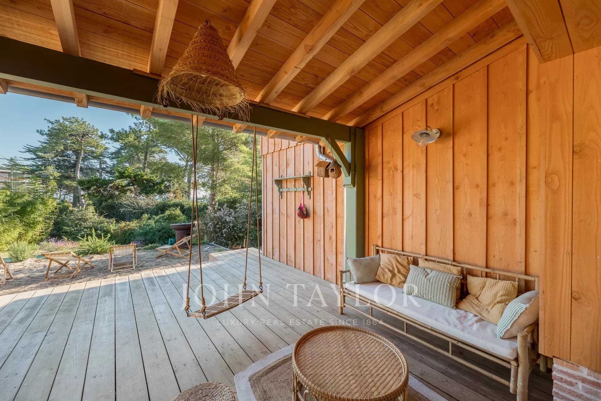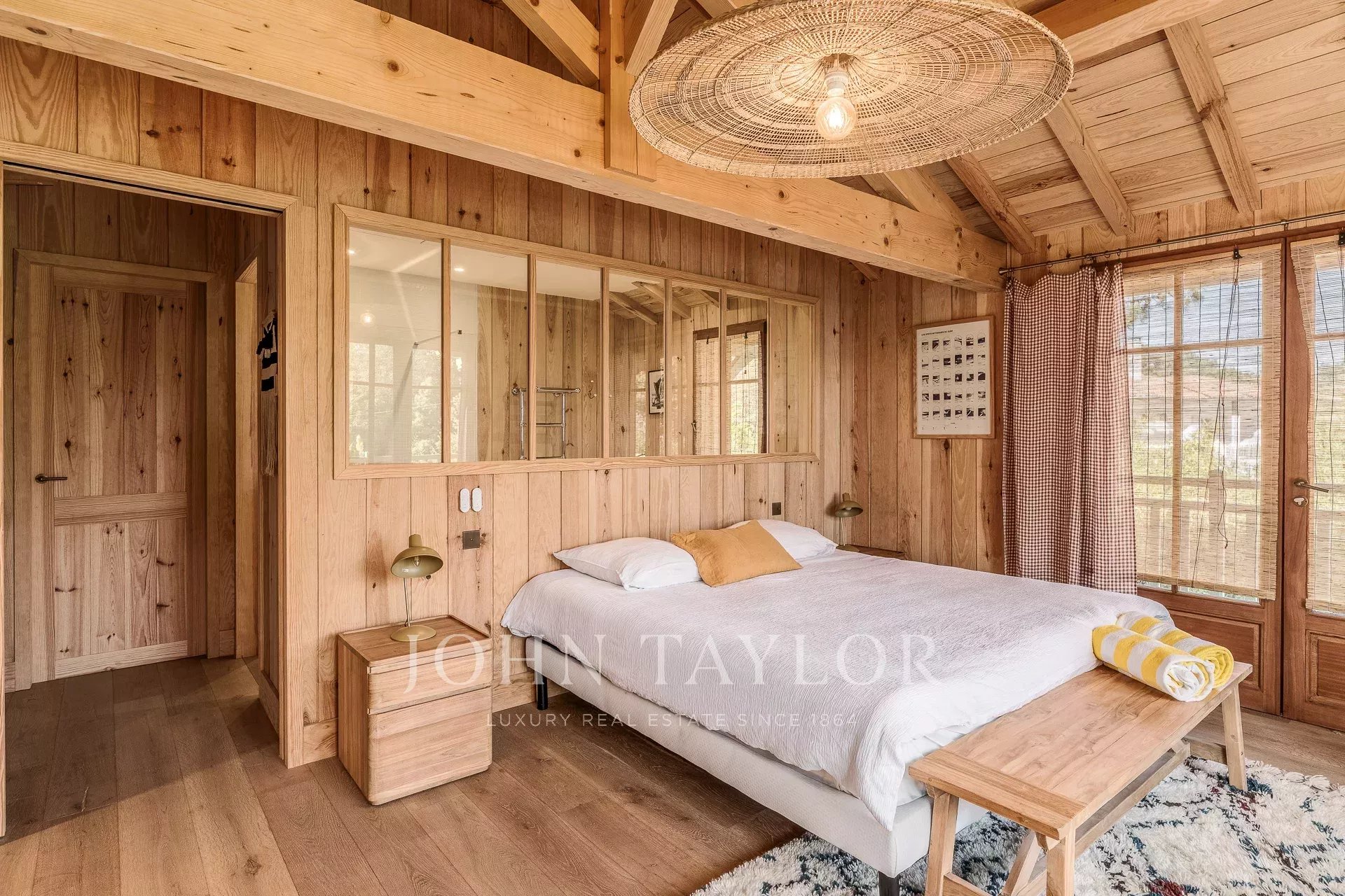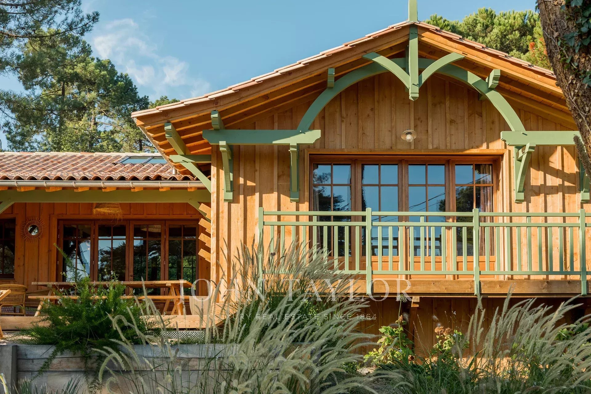 Benvenuti a Villa Émeraude, un'elegante villa in legno dal fascino di Ferret-Capien, situata a pochi passi da Plage de l'Herbe e con una splendida vista sulla baia.