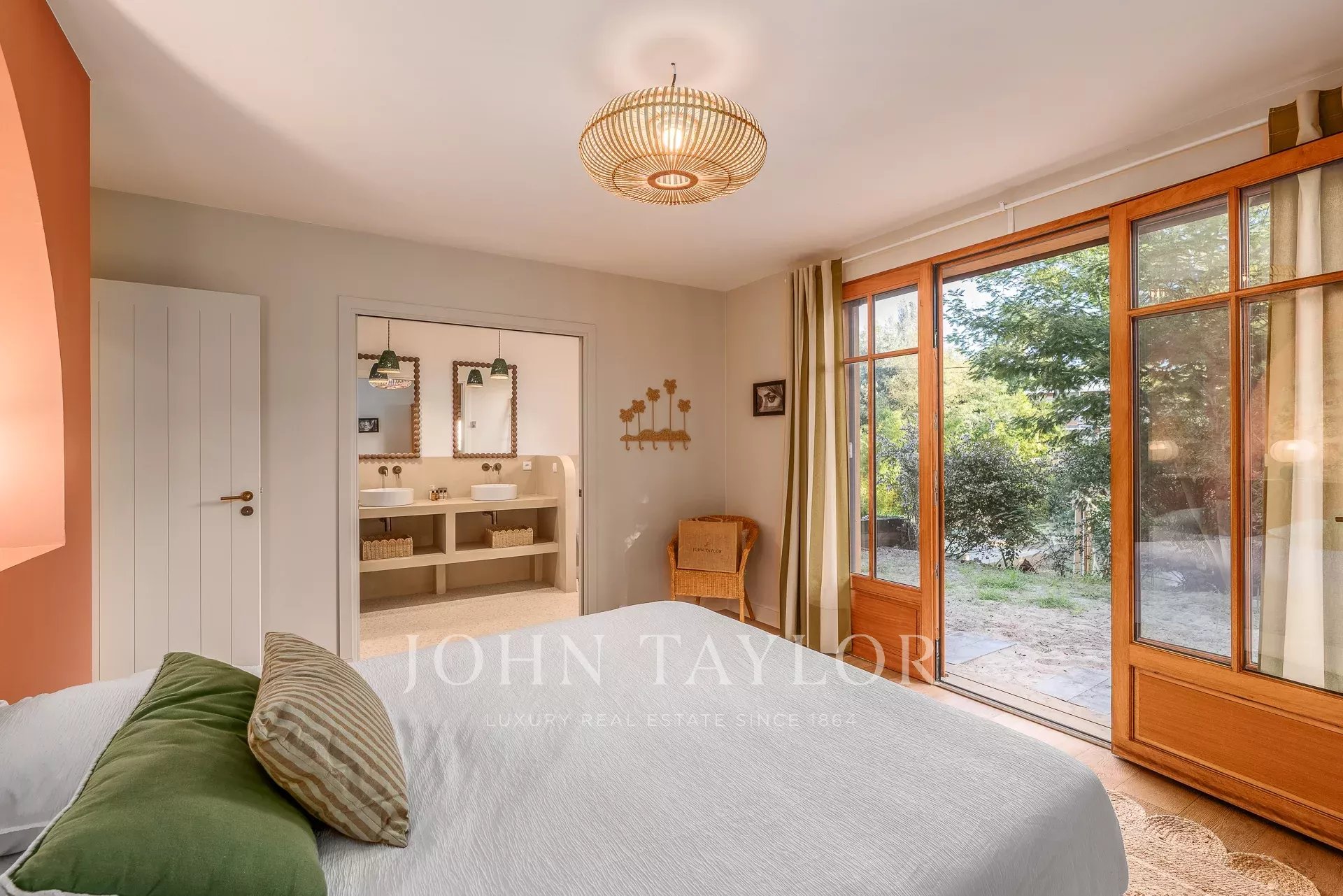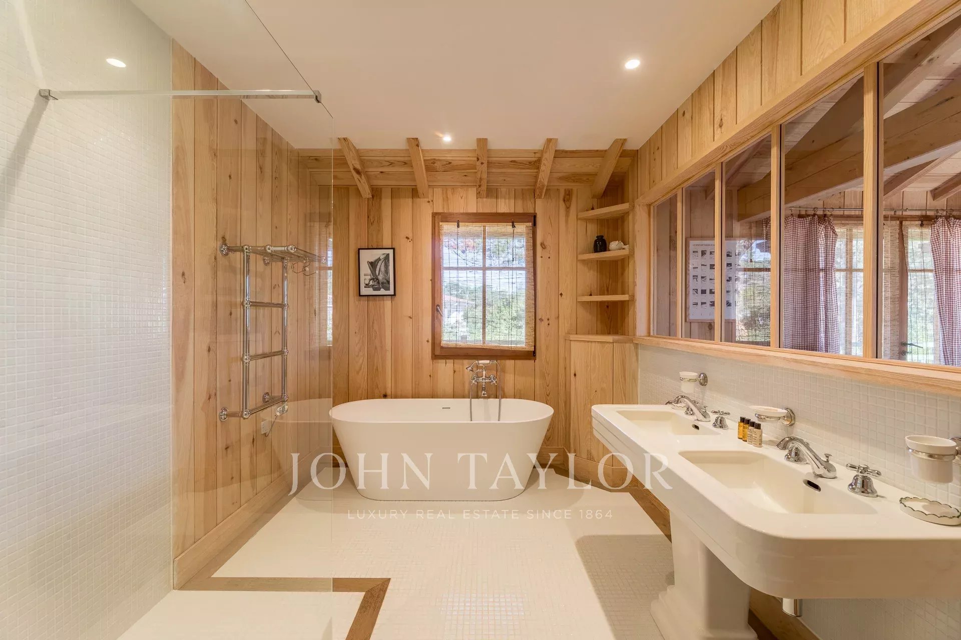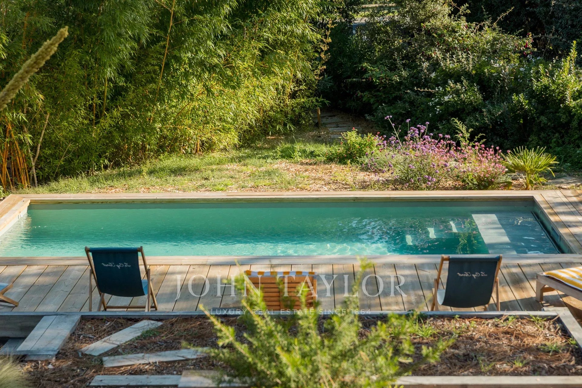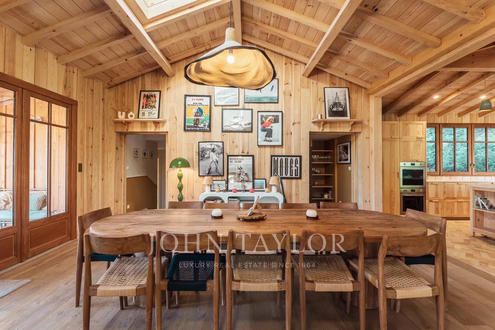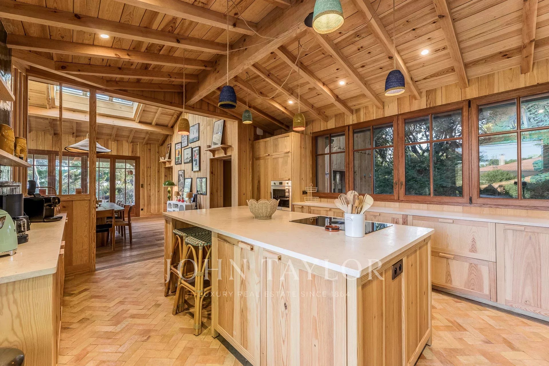 Benvenuti a Villa Émeraude, un'elegante villa in legno dal fascino di Ferret-Capien, situata a pochi passi da Plage de l'Herbe e con una splendida vista sulla baia.