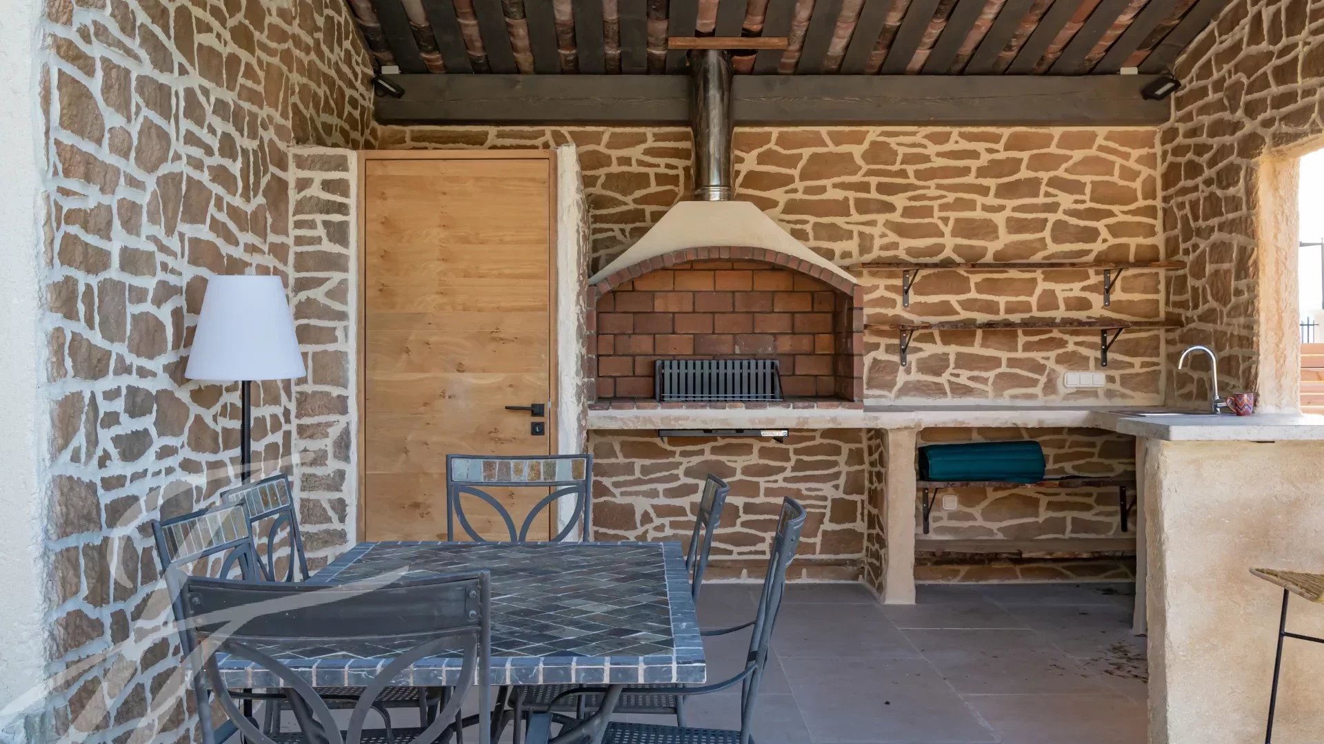Piscina, sedie a sdraio, poolhouse attrezzata, barbecue, tavolo da pranzo all'aperto.