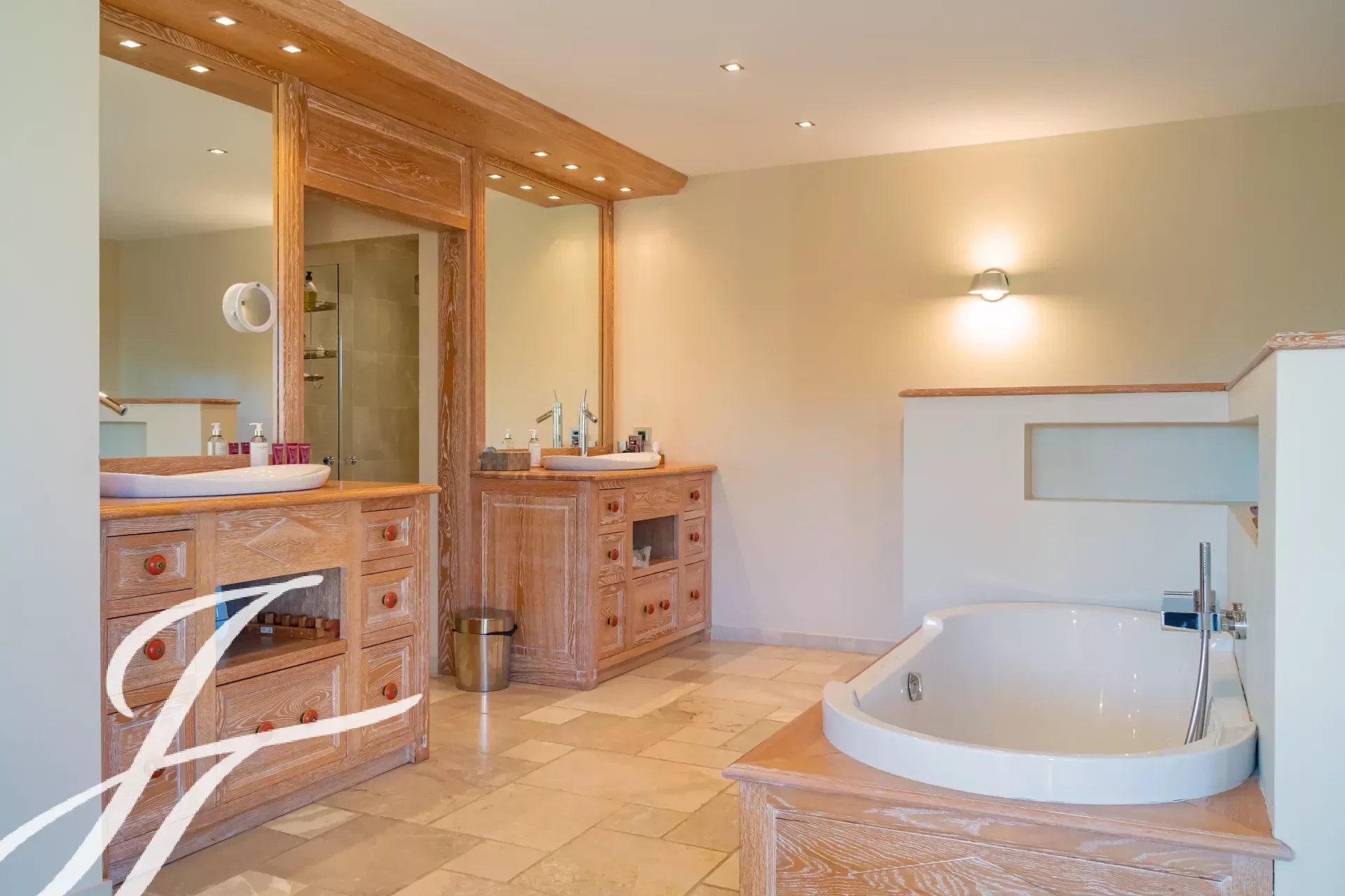Spaziosa suite padronale con bagno privato comprendente vasca, doppio lavabo, due docce e WC separato