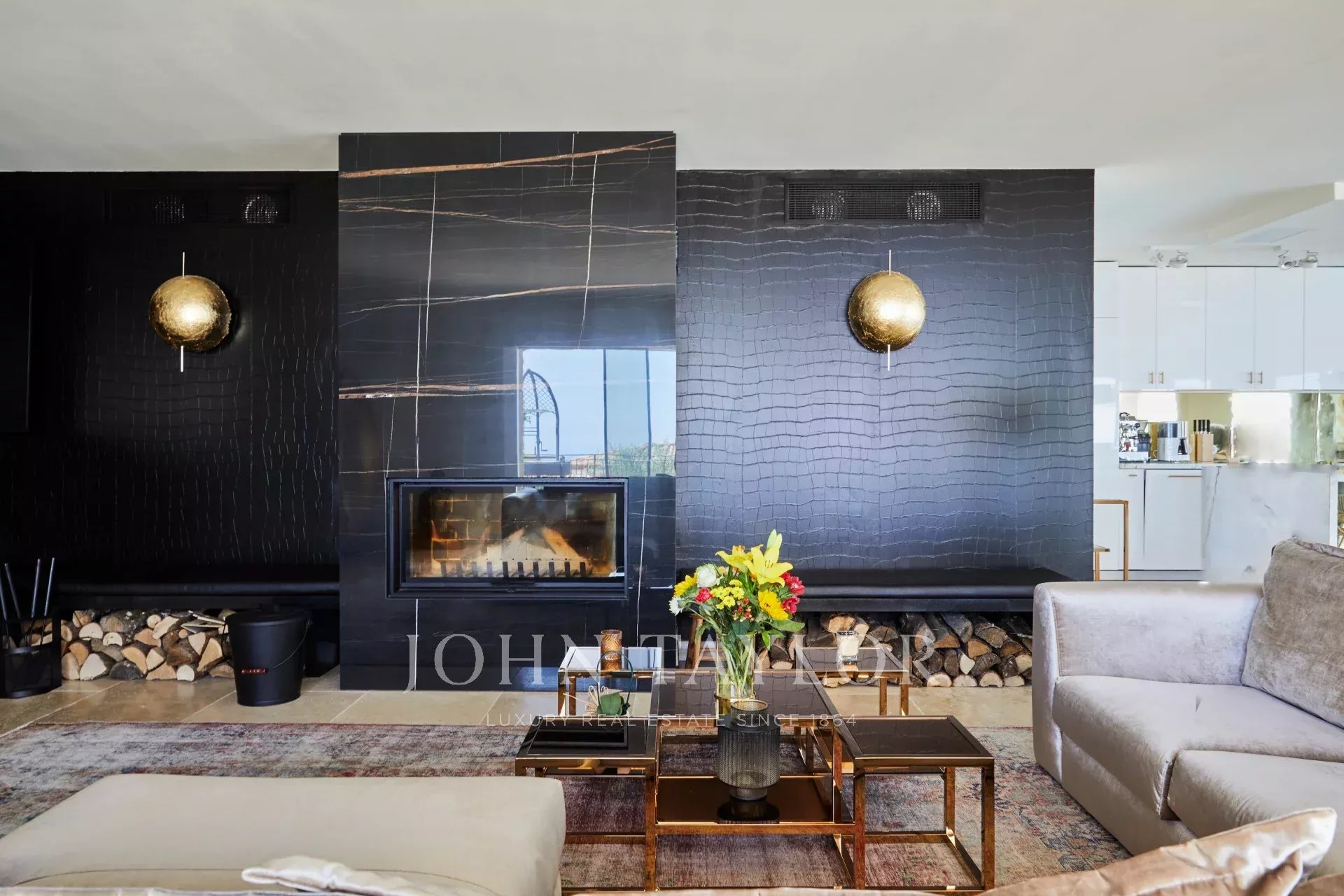 Al piano terra, uno spazio soggiorno con salotto dotato di televisione, sistema audio Sonos, camino a legna. La zona giorno è illuminata da una grande vetrata, prolungamento della cucina completamente attrezzata con isola centrale.
