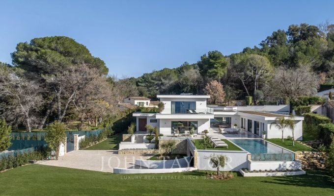 Situata sulla collina di Mandelieu, questa villa in stile contemporaneo vanta una vista ...