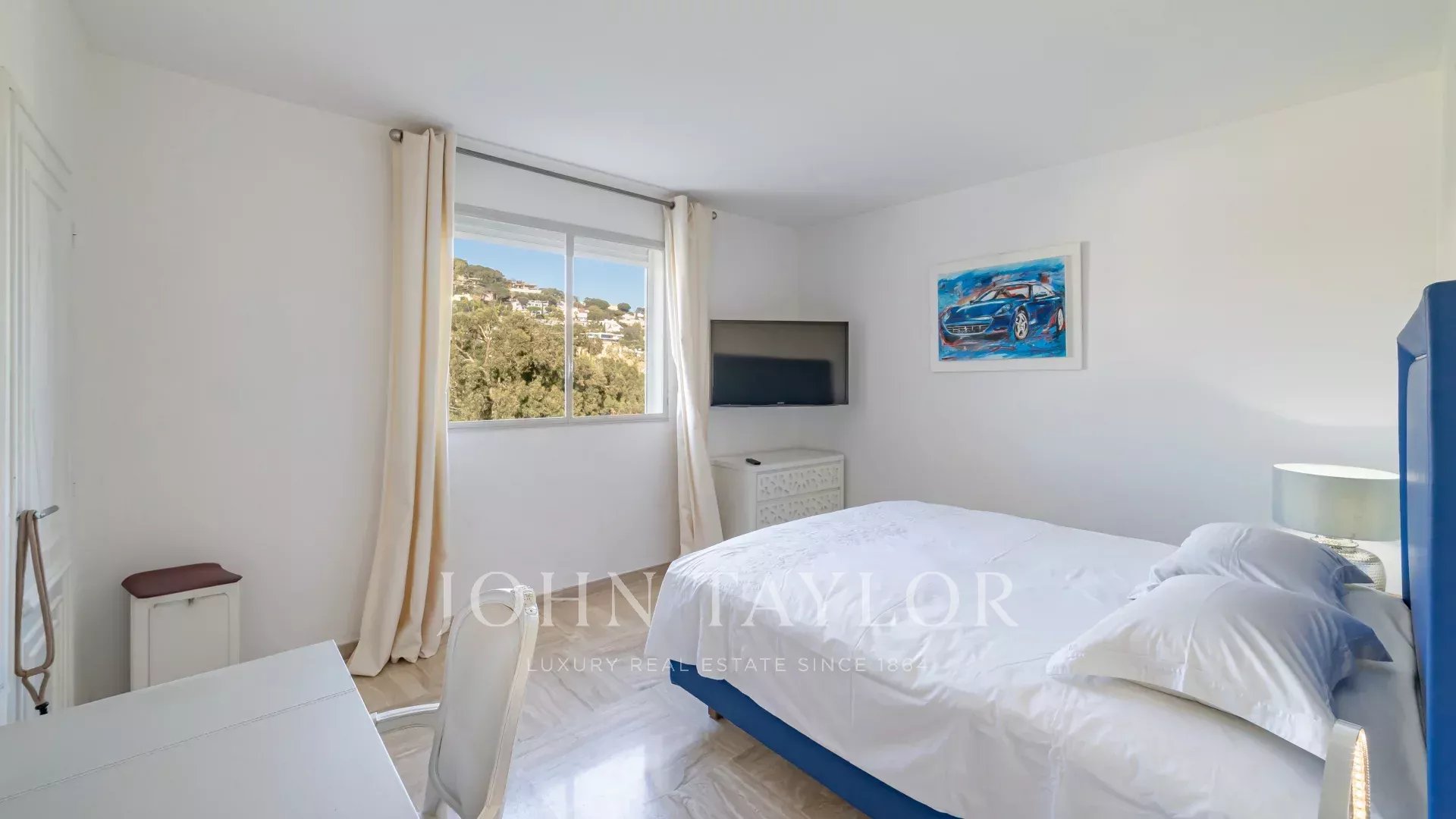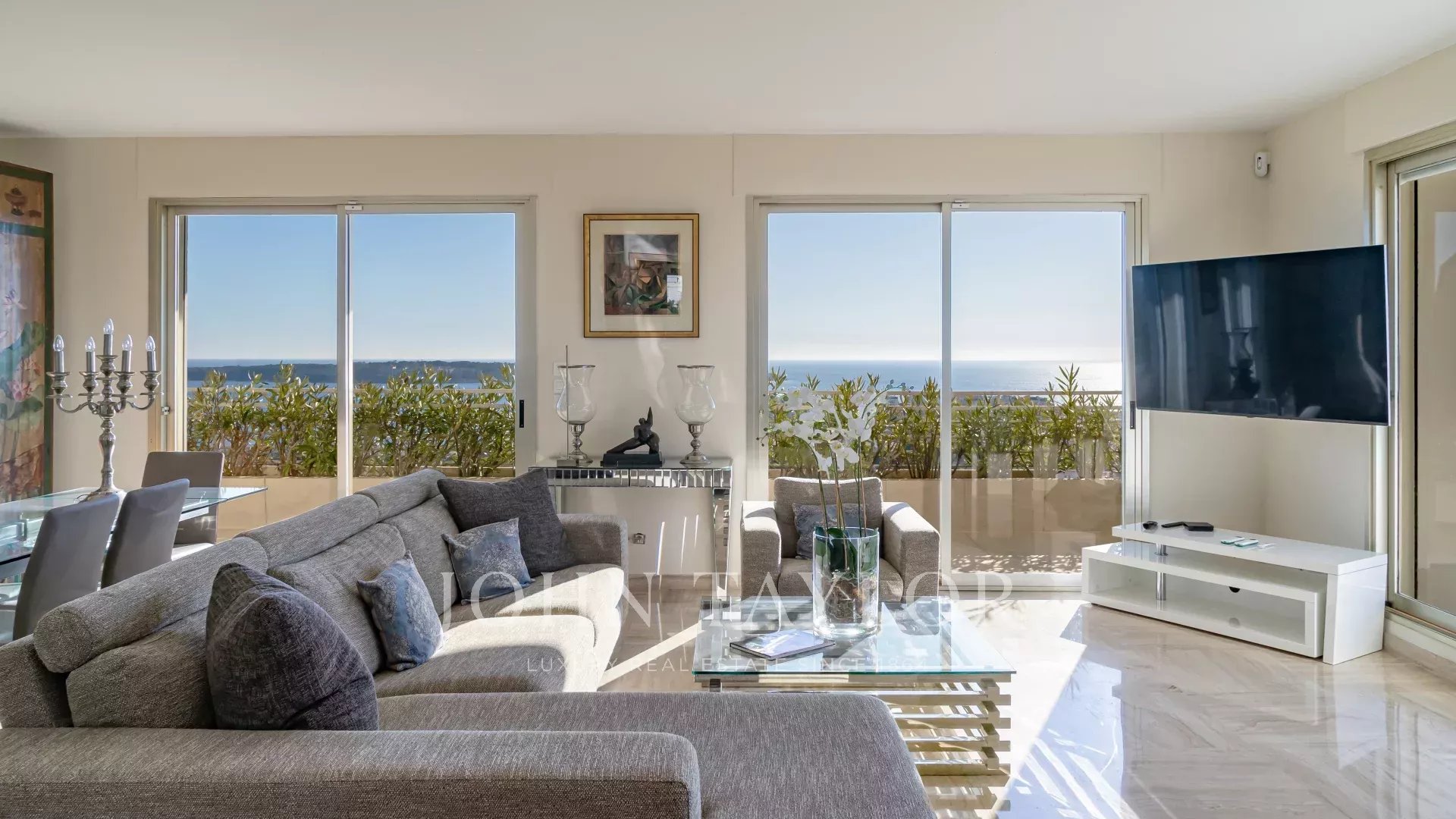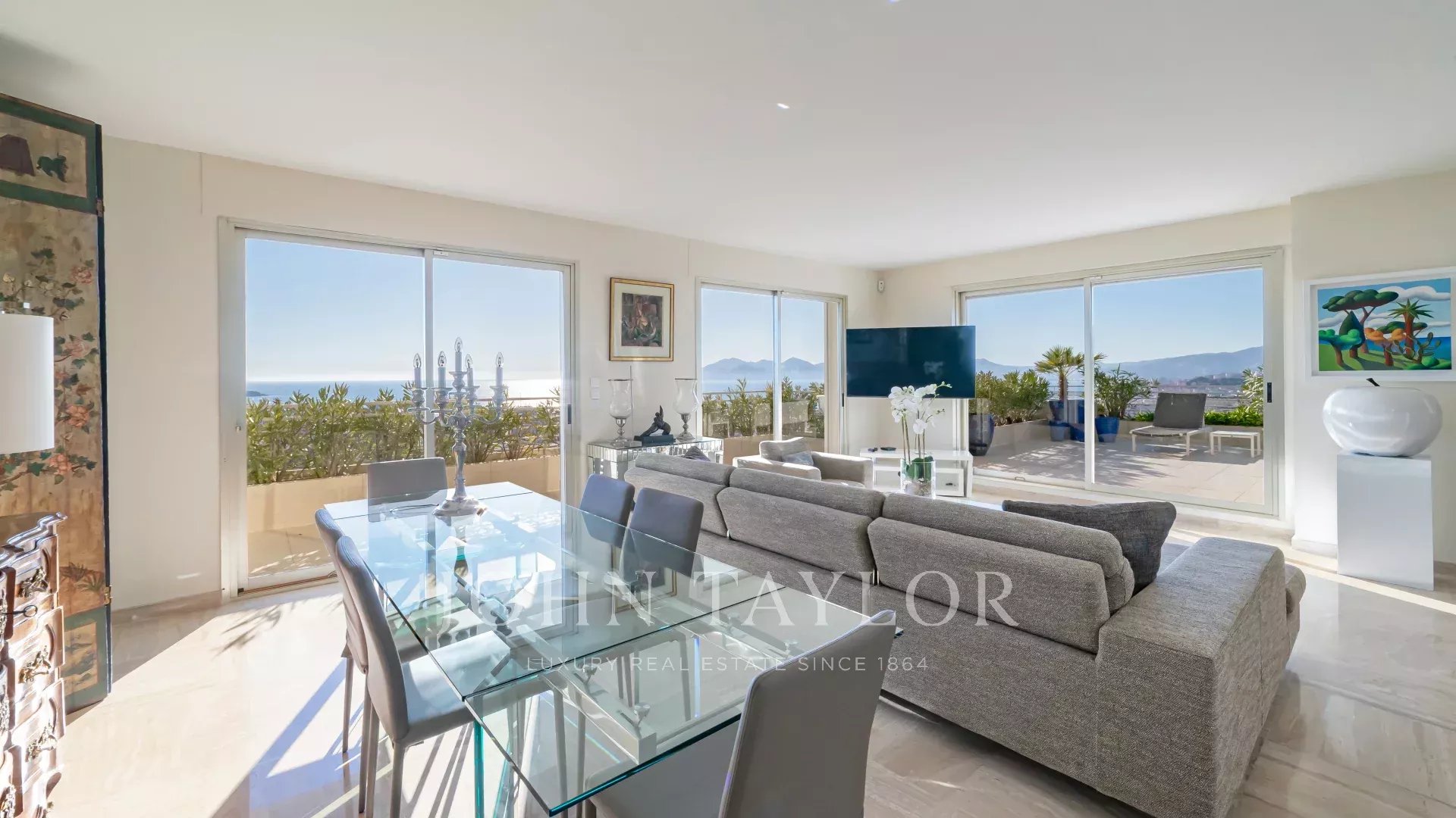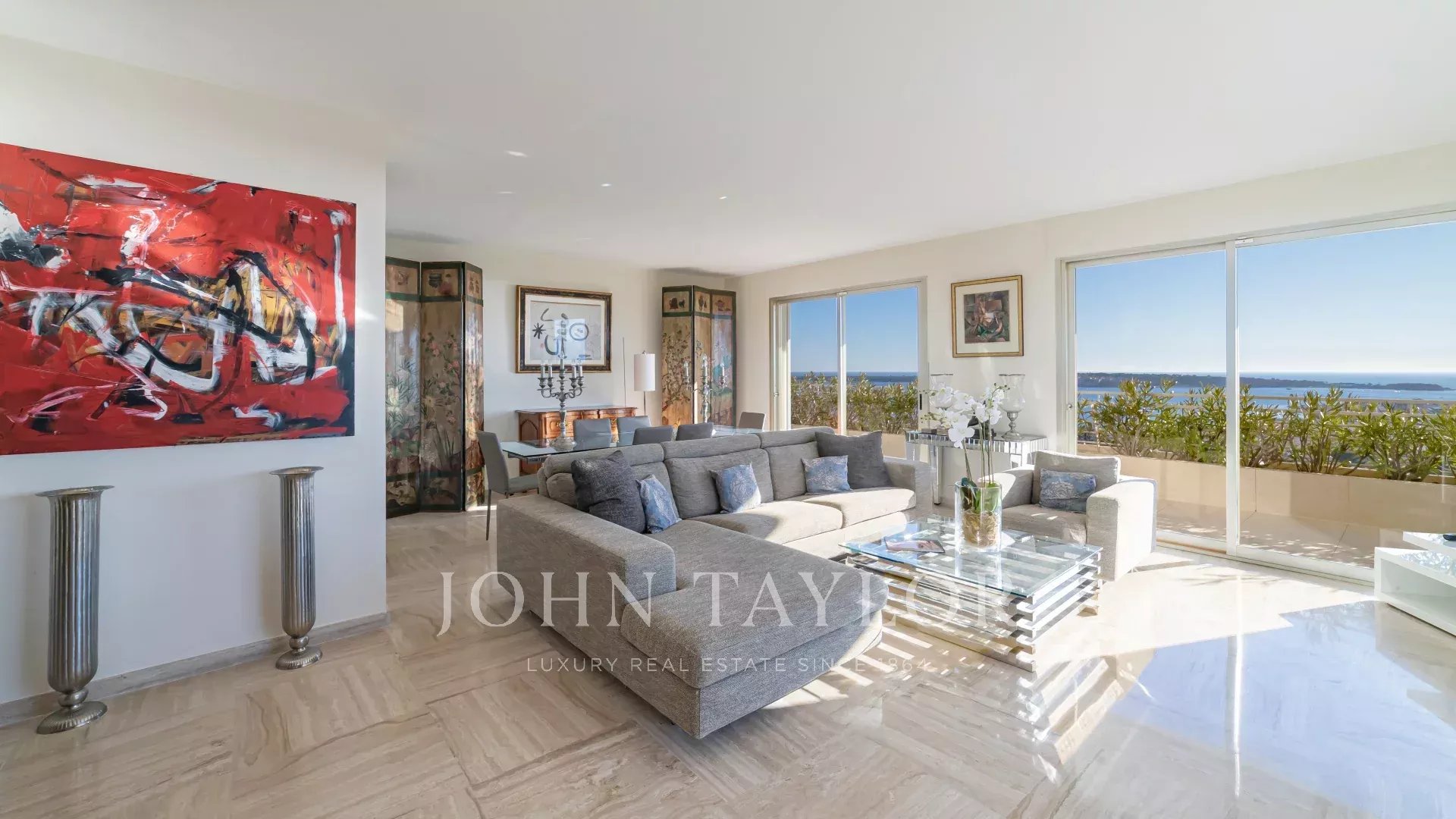 In una residenza di lusso a Basse Californie, questo magnifico appartamento d'angolo vanta un'ampia terrazza con vista ininterrotta sul mare, sulle isole Lérins, sulla baia di Cannes e sulle montagne dell'Esterel.