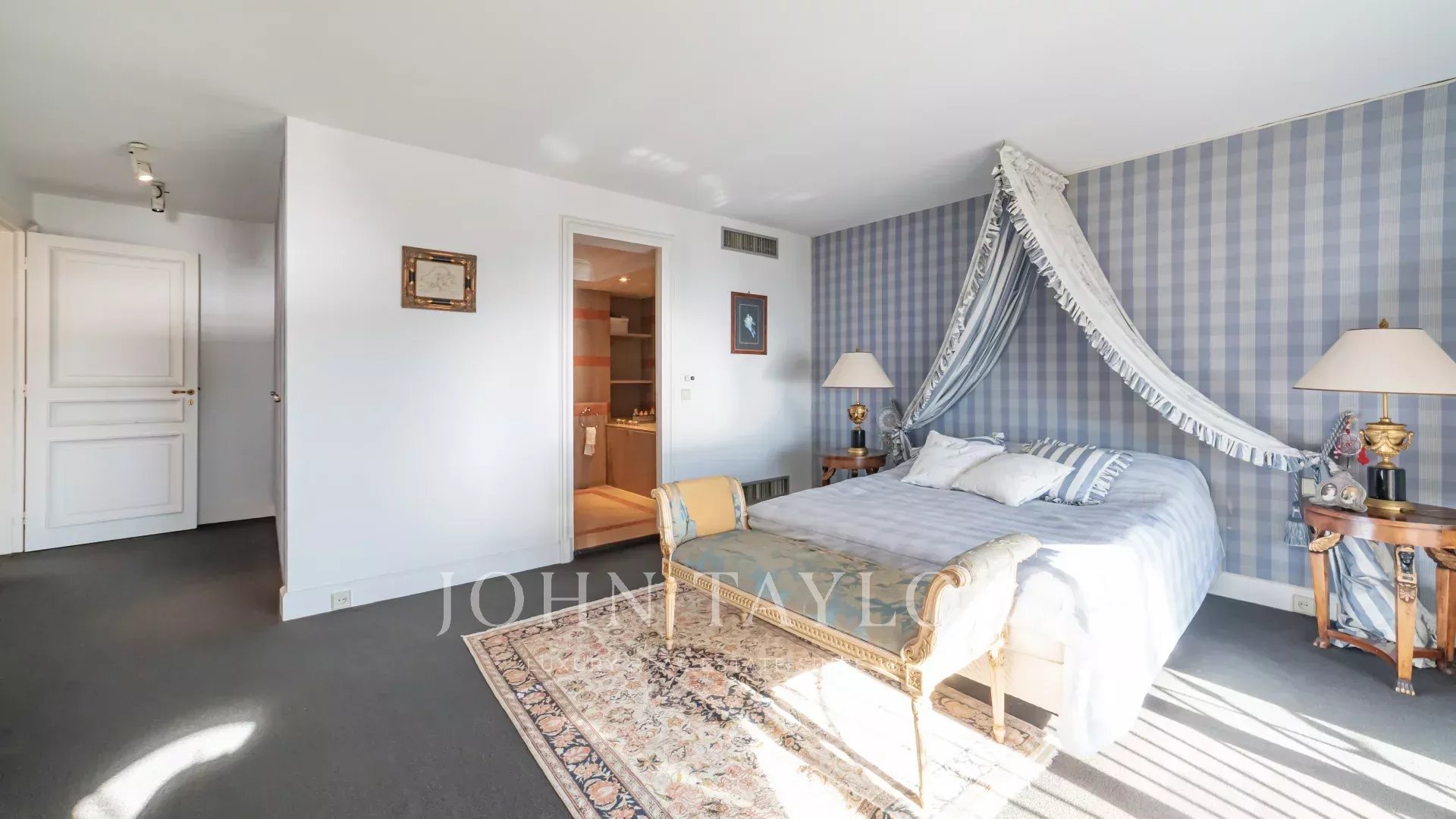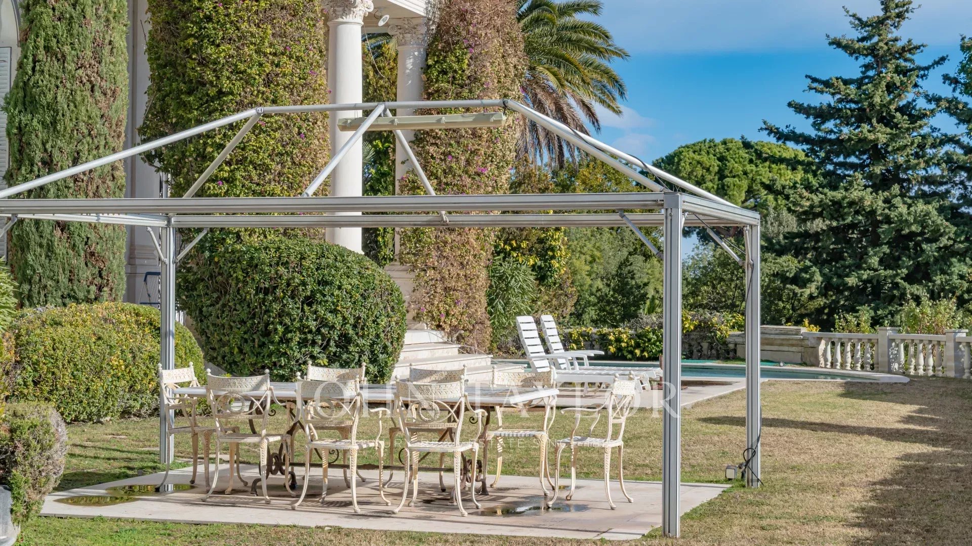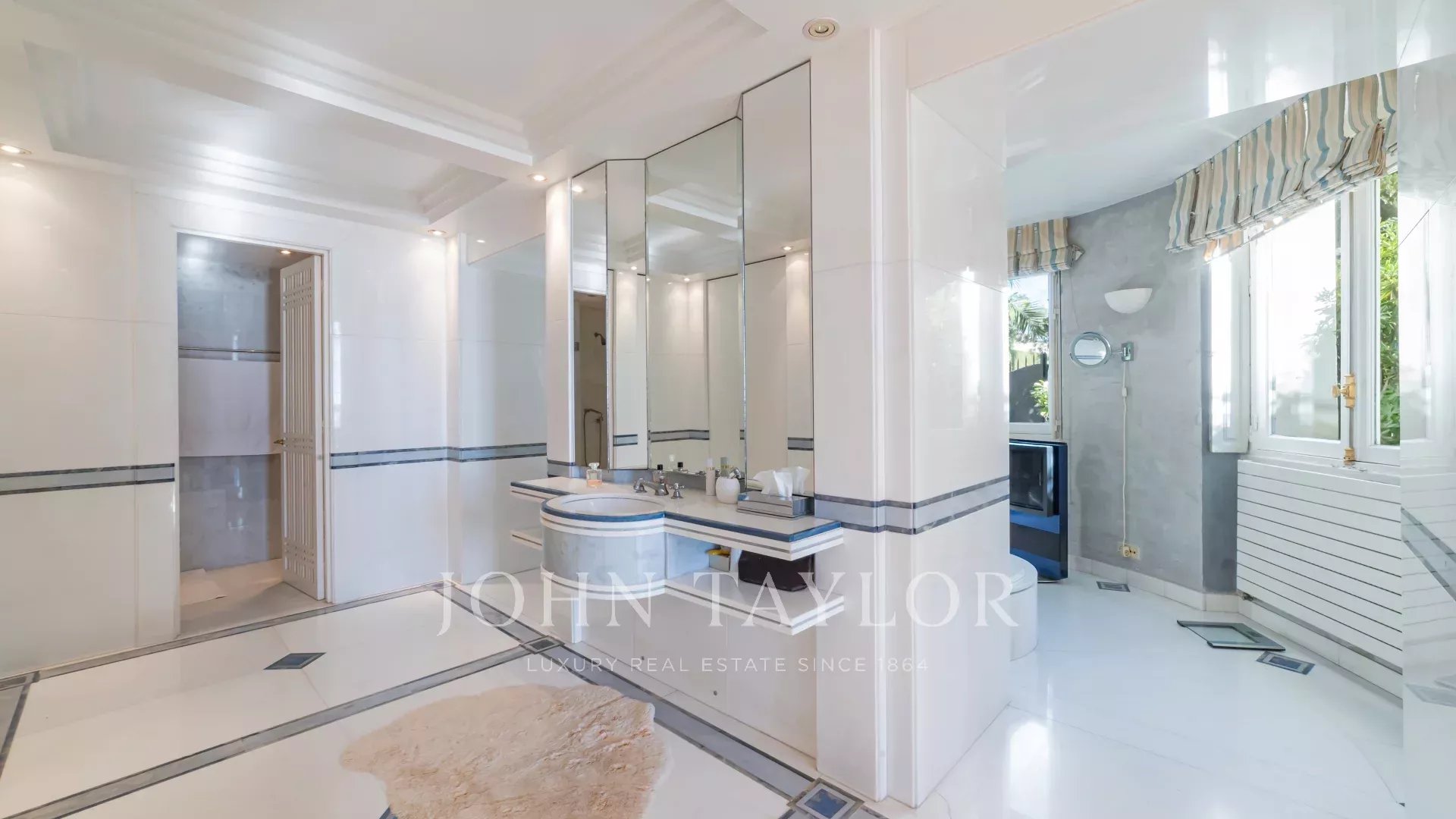 Questo superbo appartamento a livello del giardino vanta circa 450 m² di spazio abitativo. Come la maestosa e luminosa sala di ricevimento con vista sul mare e sull'isola di Sainte Marguerite, la maggior parte delle stanze ha grandi finestre che collegano la casa alla campagna circostante. L'appartamento dispone di 4 camere da letto con bagno, tra cui una bellissima camera da letto principale e uno studio di servizio.
