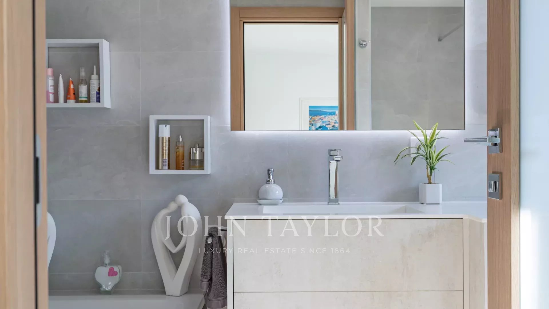 Con 76 m² di superficie abitabile, beneficia di tre sistemi di climatizzazione indipendenti e integrati. Si compone di un ingresso con ampio spazio di archiviazione, un soggiorno con cucina a vista attrezzata che si apre sulla terrazza, un bagno per gli ospiti, una camera da letto con bagno, un'ulteriore camera da letto con bagno e doccia e una zona studio.