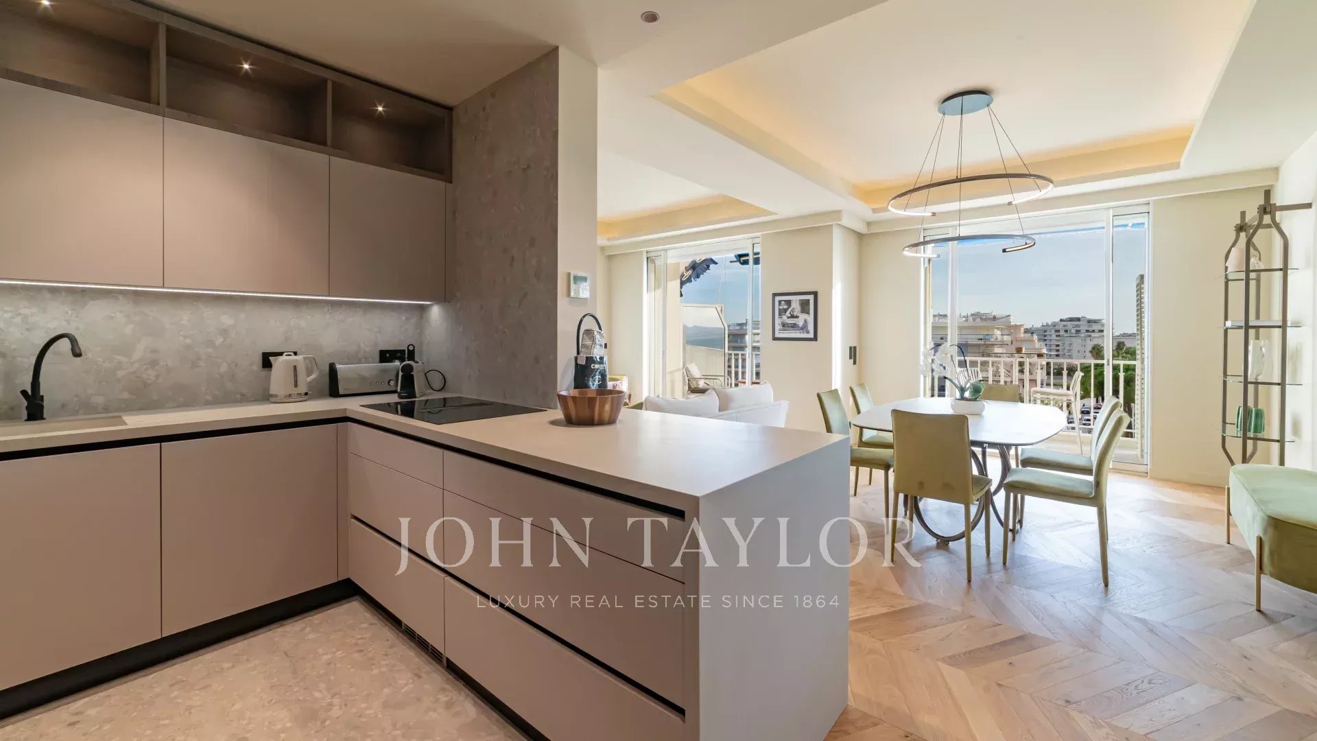 Situato all'ultimo piano di una residenza di lusso sulla Croisette, questo appartamento vanta una splendida vista sul mare, su Port Canto e sul massiccio dell'Esterel.