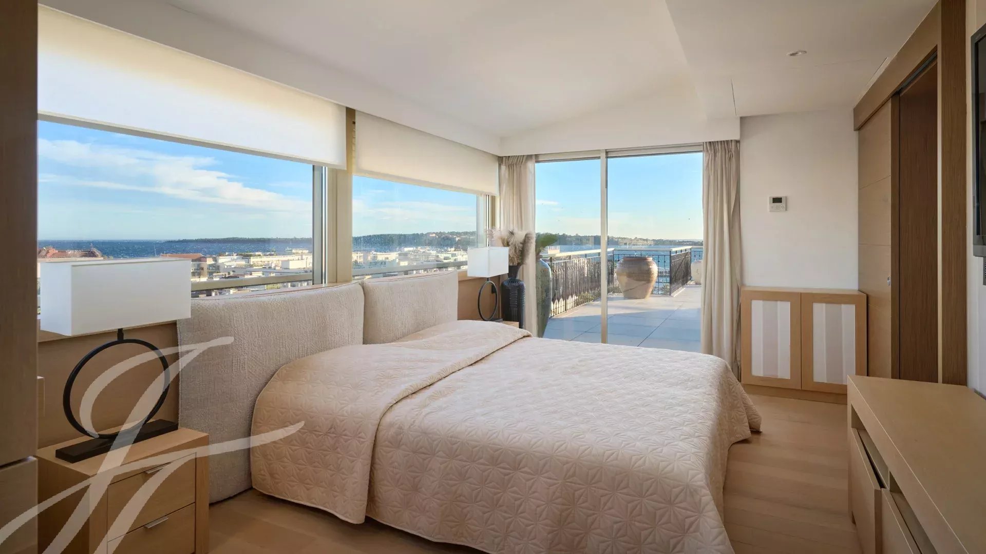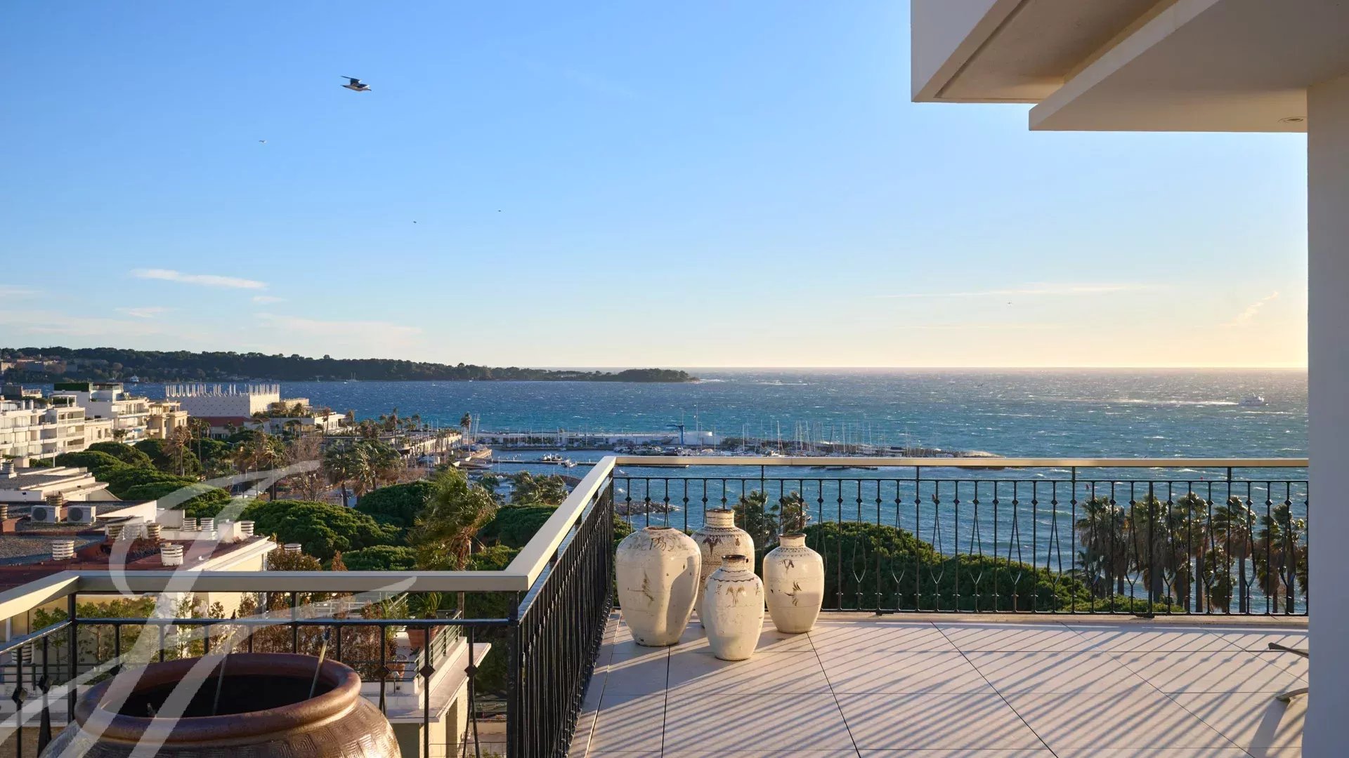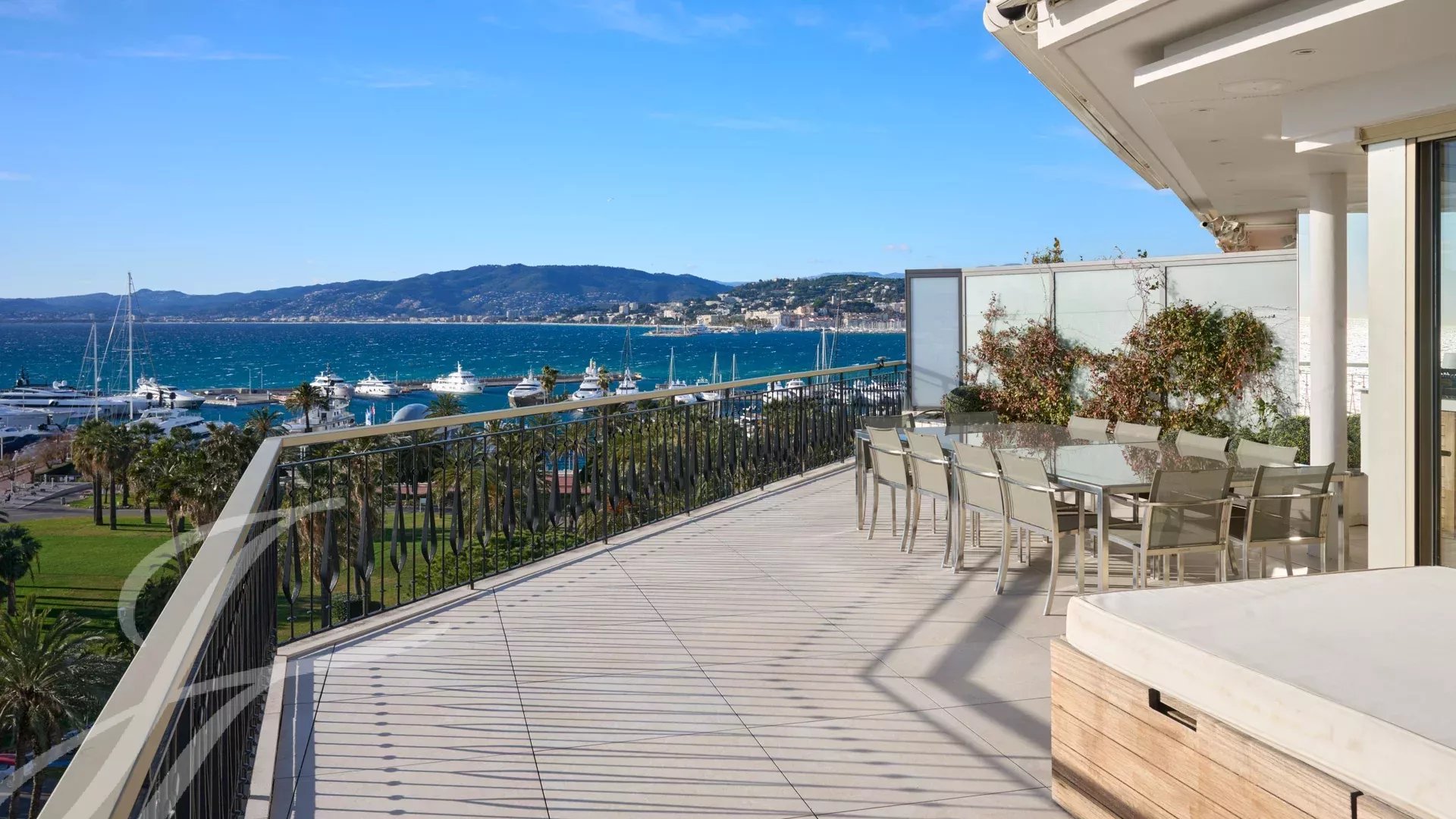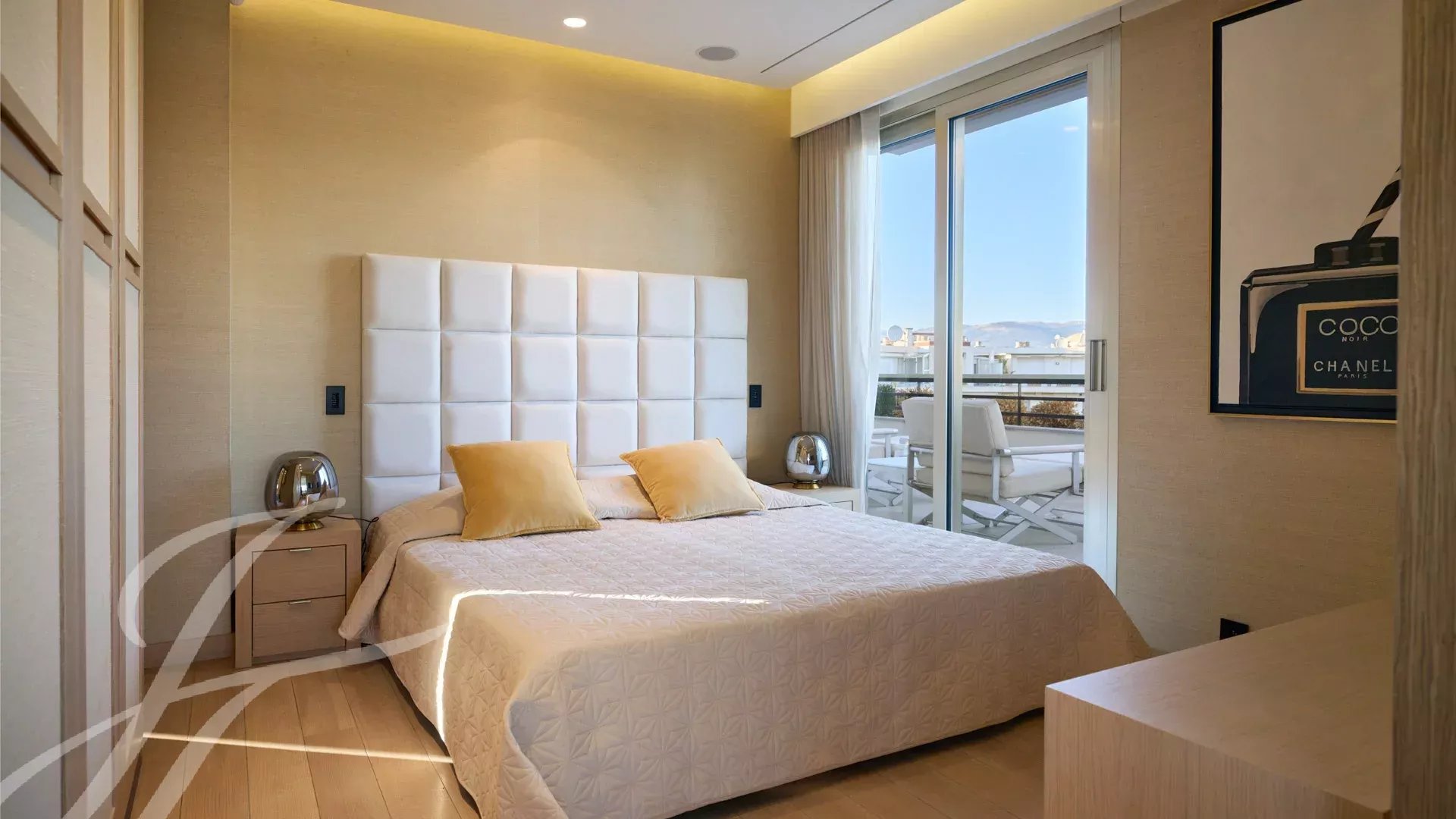 È composto da un ampio soggiorno/sala da pranzo con zona bar e due cantine, che si apre su una spettacolare terrazza di 156 m² con vista mozzafiato su Port Canto, Palm Beach, la baia di Cannes e le isole Lérins. La cucina chiusa e completamente attrezzata ha accesso a una seconda terrazza. L'appartamento dispone di quattro camere da letto, tra cui una camera da letto principale con bagno privato e doccia e accesso alla terrazza con vista sul mare. Un'altra camera da letto con bagno privato con doccia e altre due camere da letto che condividono un bagno con doccia.