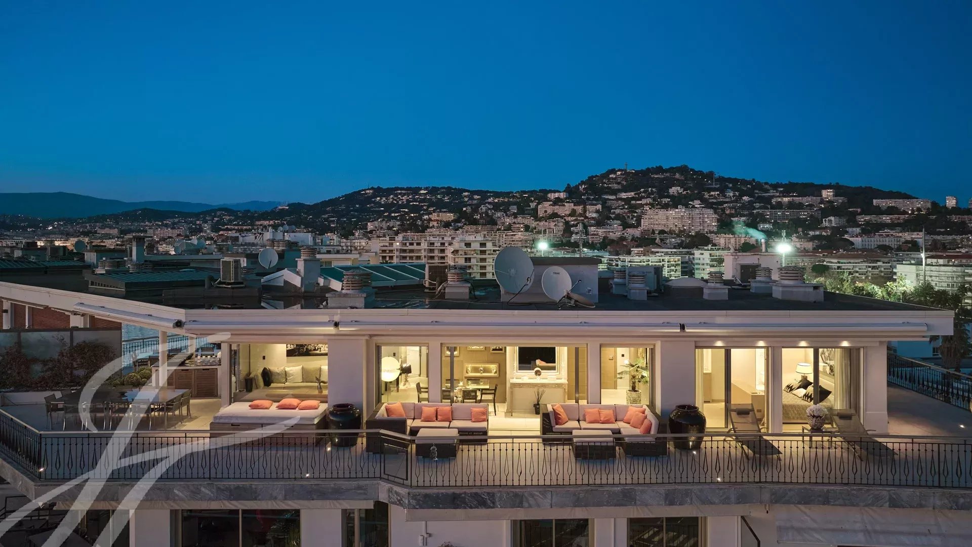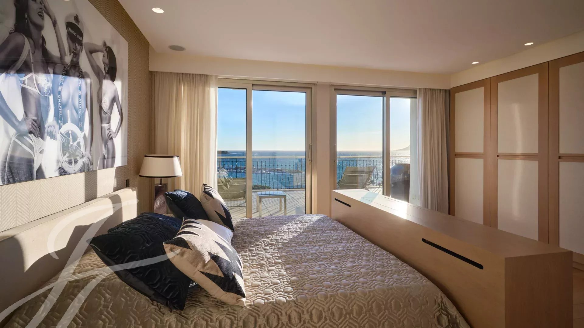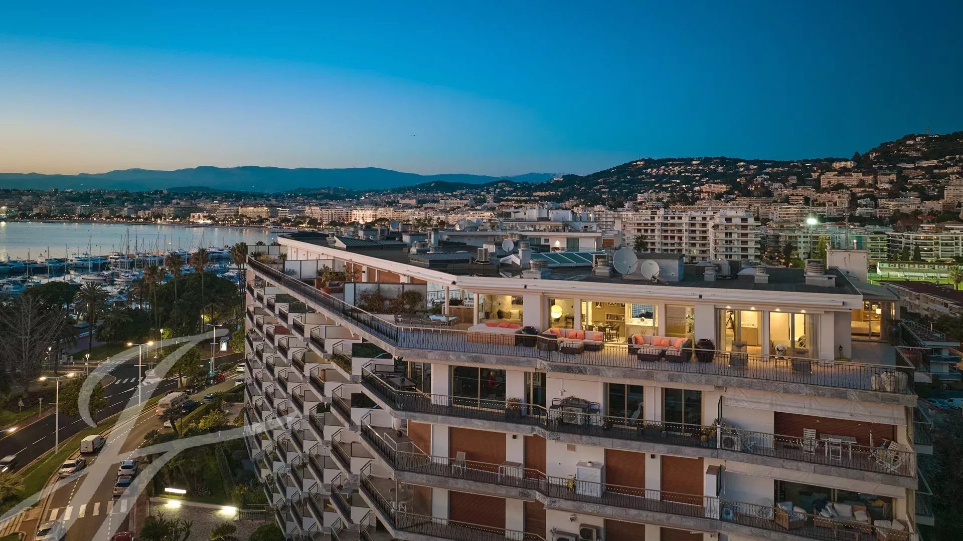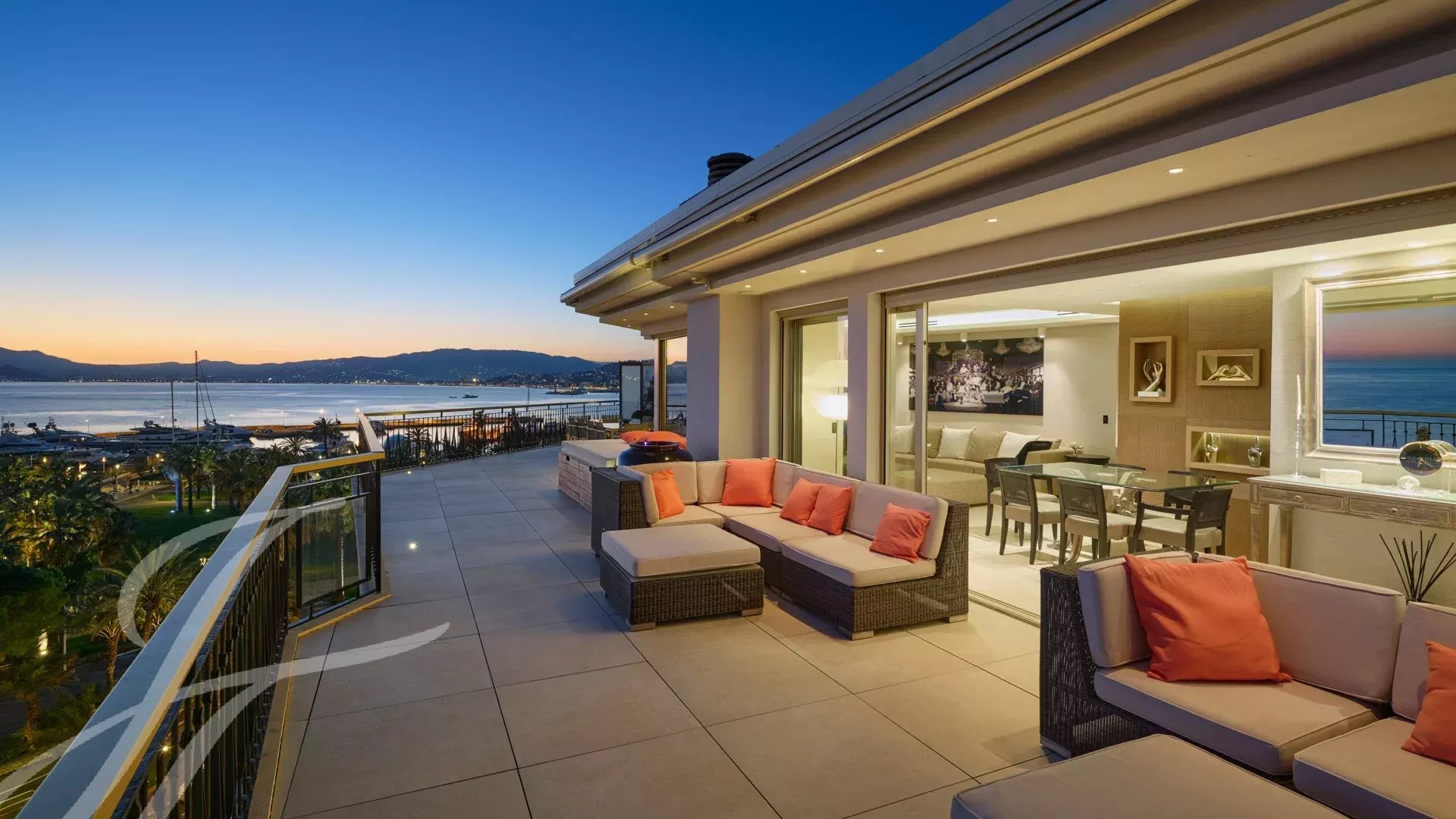 È composto da un ampio soggiorno/sala da pranzo con zona bar e due cantine, che si apre su una spettacolare terrazza di 156 m² con vista mozzafiato su Port Canto, Palm Beach, la baia di Cannes e le isole Lérins. La cucina chiusa e completamente attrezzata ha accesso a una seconda terrazza. L'appartamento dispone di quattro camere da letto, tra cui una camera da letto principale con bagno privato e doccia e accesso alla terrazza con vista sul mare. Un'altra camera da letto con bagno privato con doccia e altre due camere da letto che condividono un bagno con doccia.