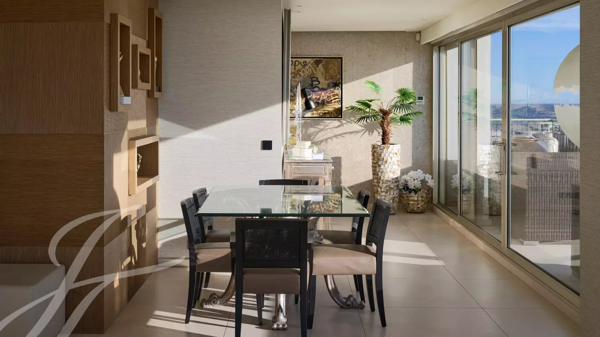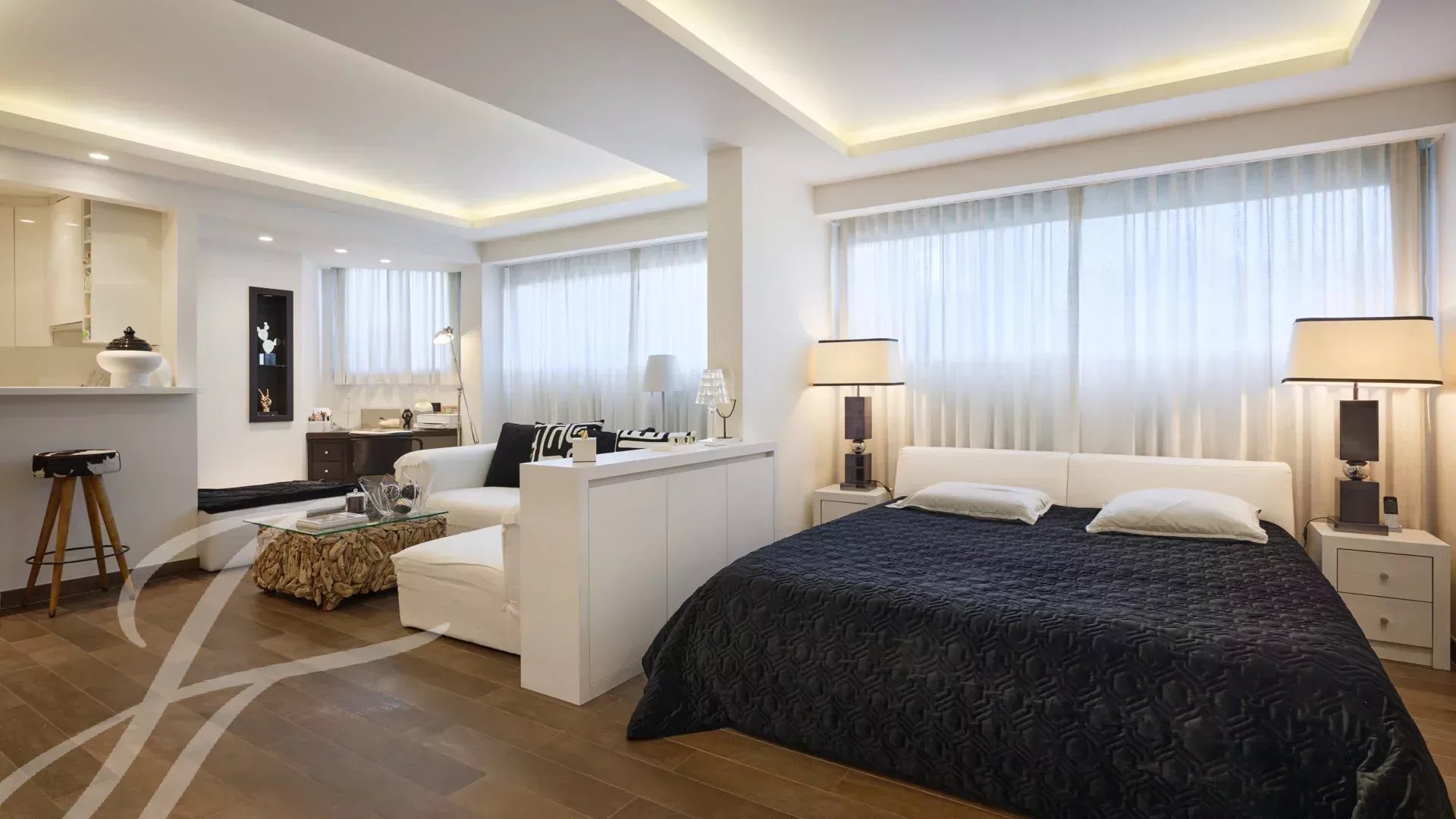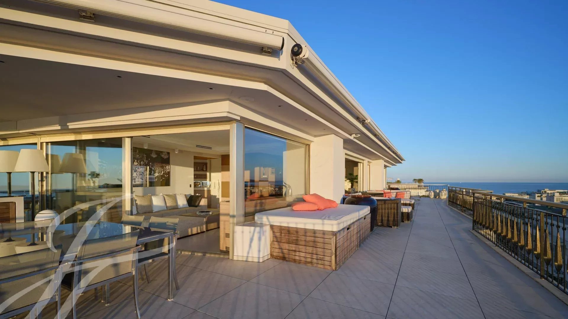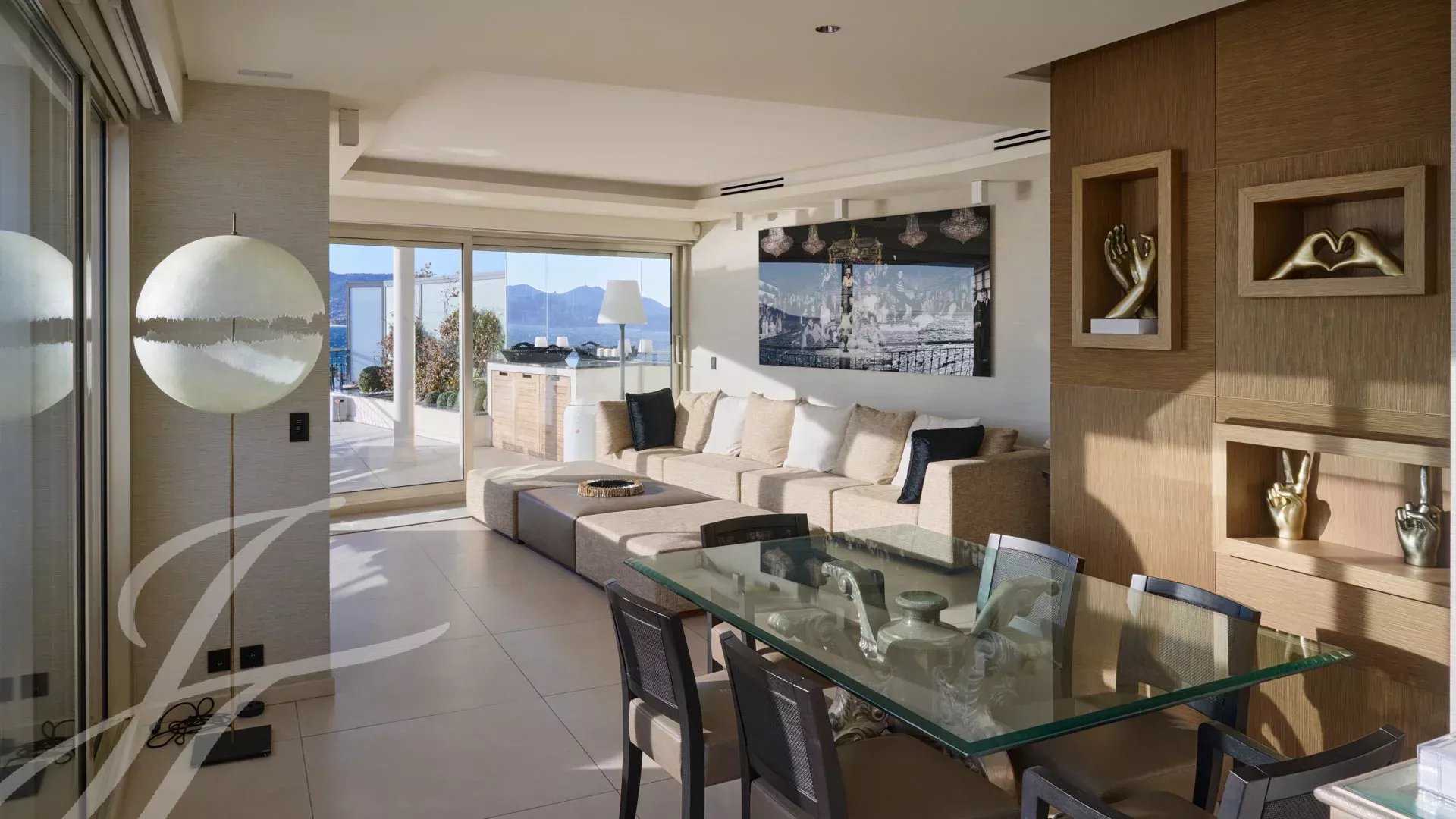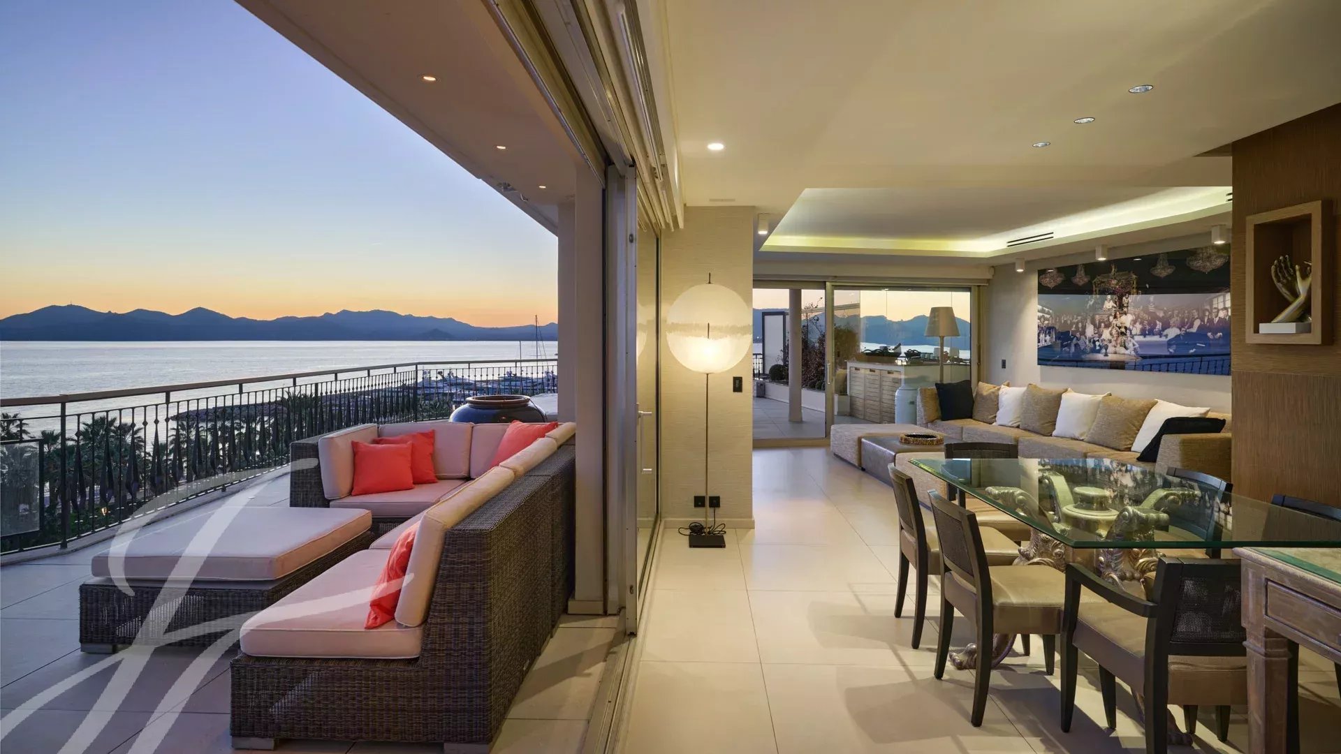 È composto da un ampio soggiorno/sala da pranzo con zona bar e due cantine, che si apre su una spettacolare terrazza di 156 m² con vista mozzafiato su Port Canto, Palm Beach, la baia di Cannes e le isole Lérins. La cucina chiusa e completamente attrezzata ha accesso a una seconda terrazza. L'appartamento dispone di quattro camere da letto, tra cui una camera da letto principale con bagno privato e doccia e accesso alla terrazza con vista sul mare. Un'altra camera da letto con bagno privato con doccia e altre due camere da letto che condividono un bagno con doccia.