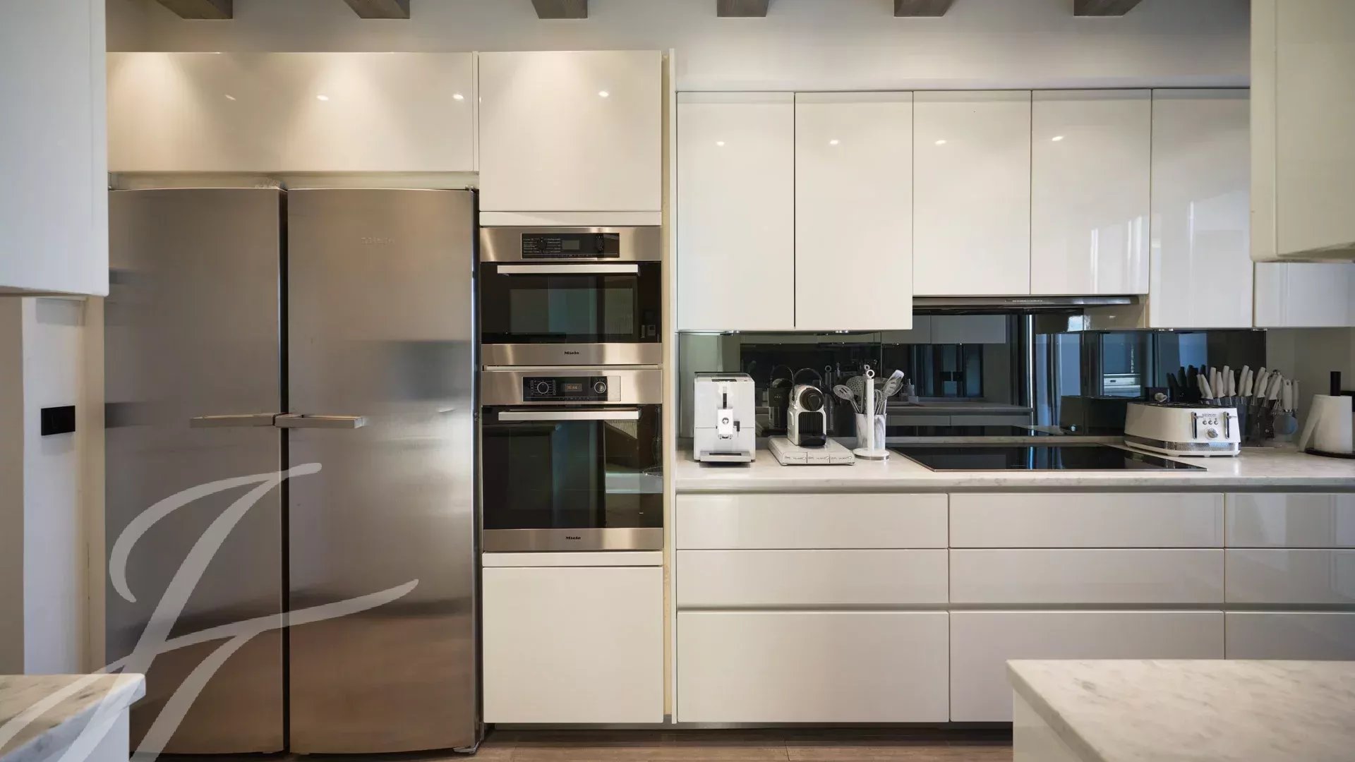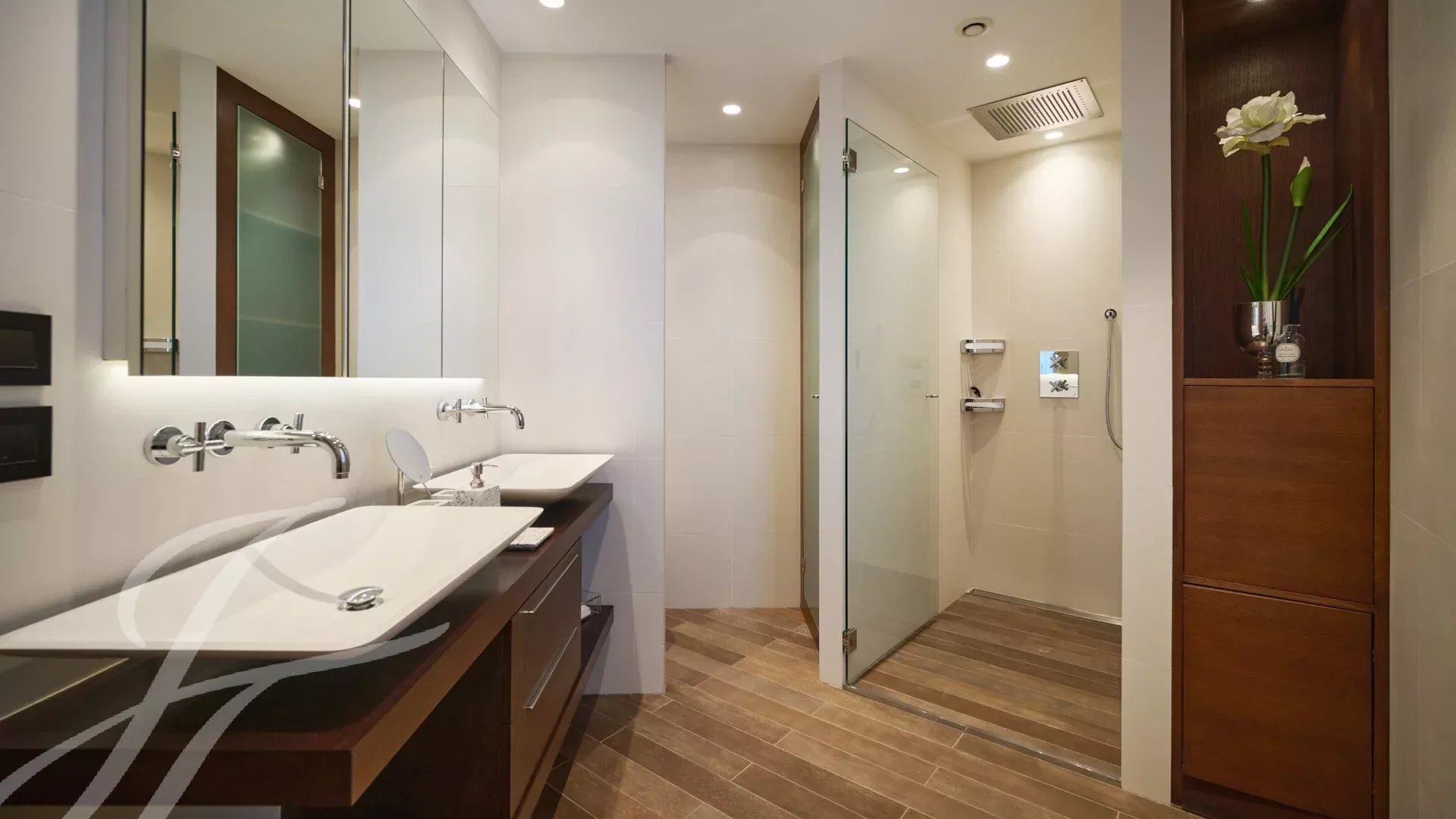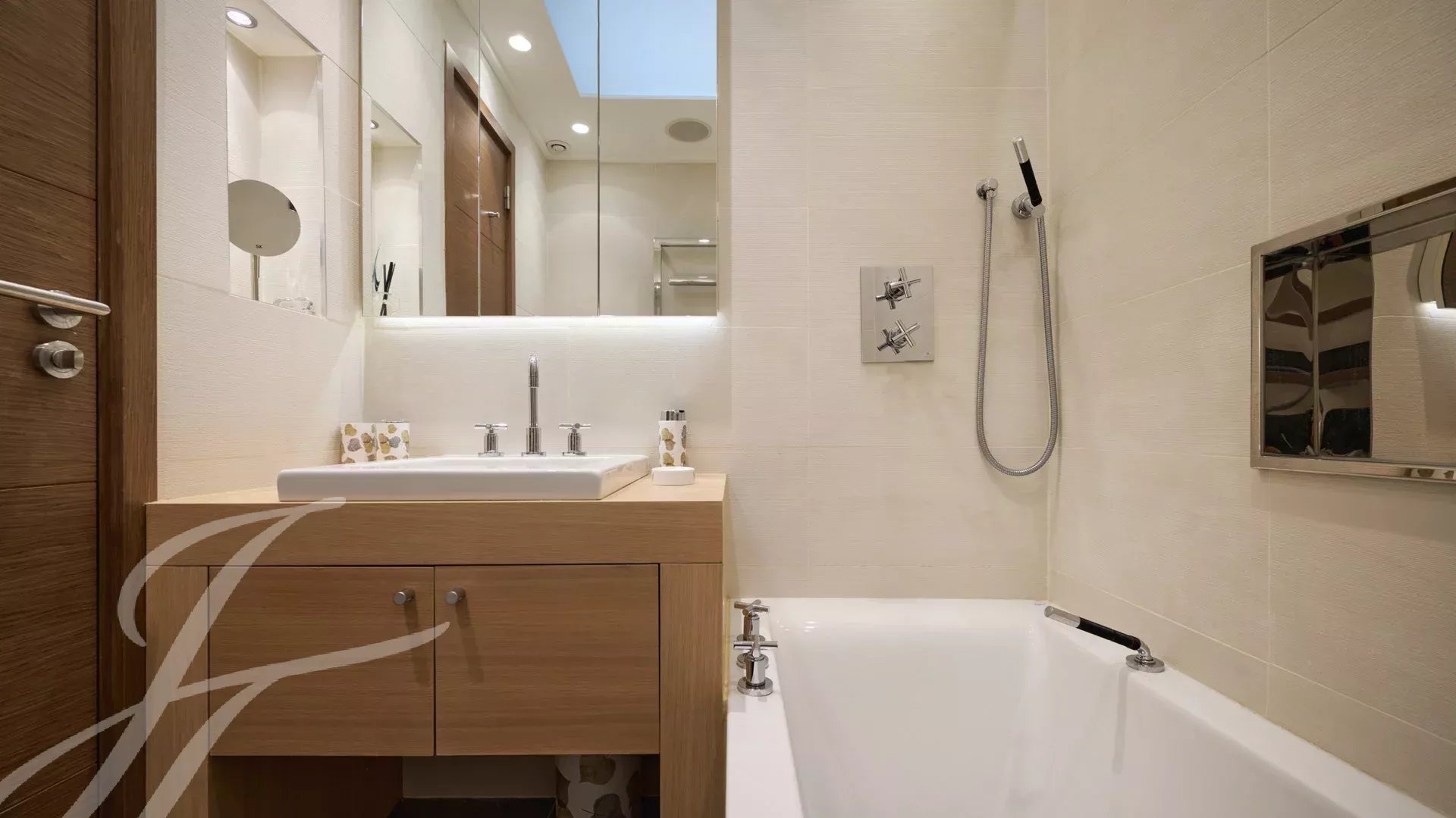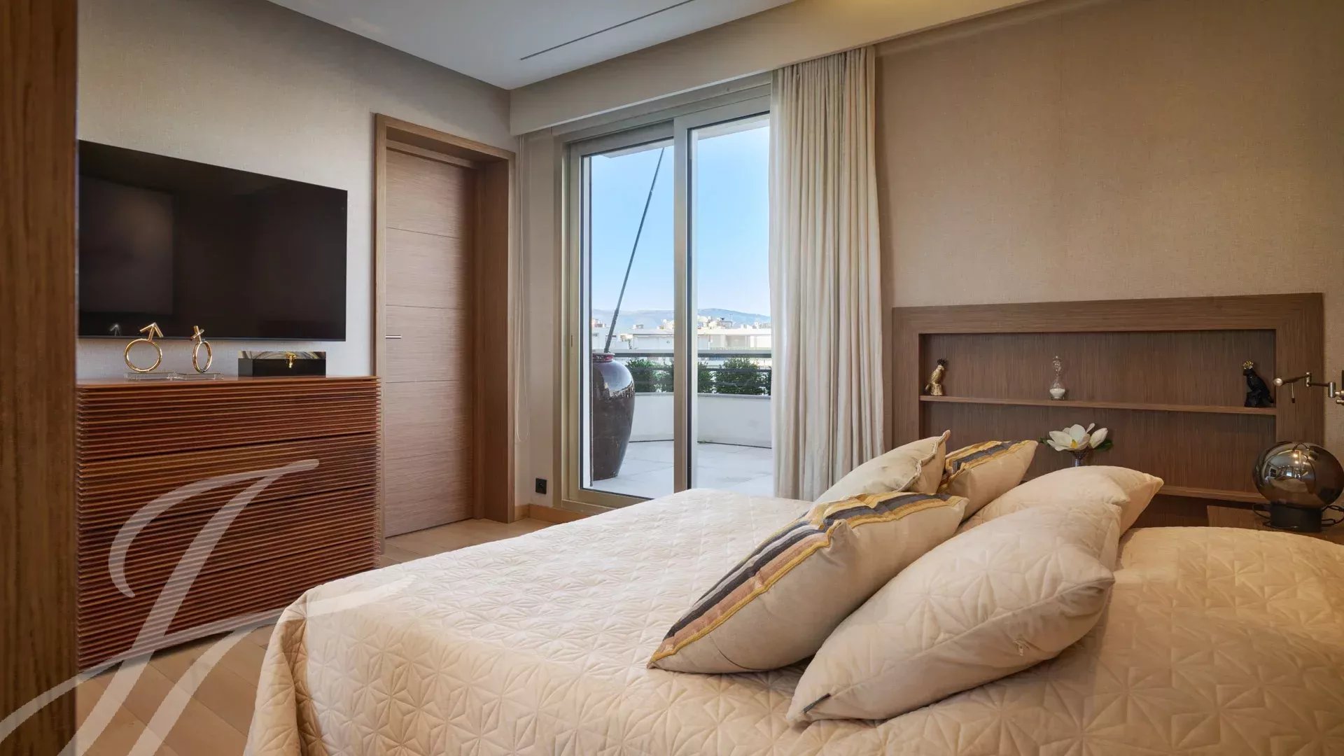 È composto da un ampio soggiorno/sala da pranzo con zona bar e due cantine, che si apre su una spettacolare terrazza di 156 m² con vista mozzafiato su Port Canto, Palm Beach, la baia di Cannes e le isole Lérins. La cucina chiusa e completamente attrezzata ha accesso a una seconda terrazza. L'appartamento dispone di quattro camere da letto, tra cui una camera da letto principale con bagno privato e doccia e accesso alla terrazza con vista sul mare. Un'altra camera da letto con bagno privato con doccia e altre due camere da letto che condividono un bagno con doccia.