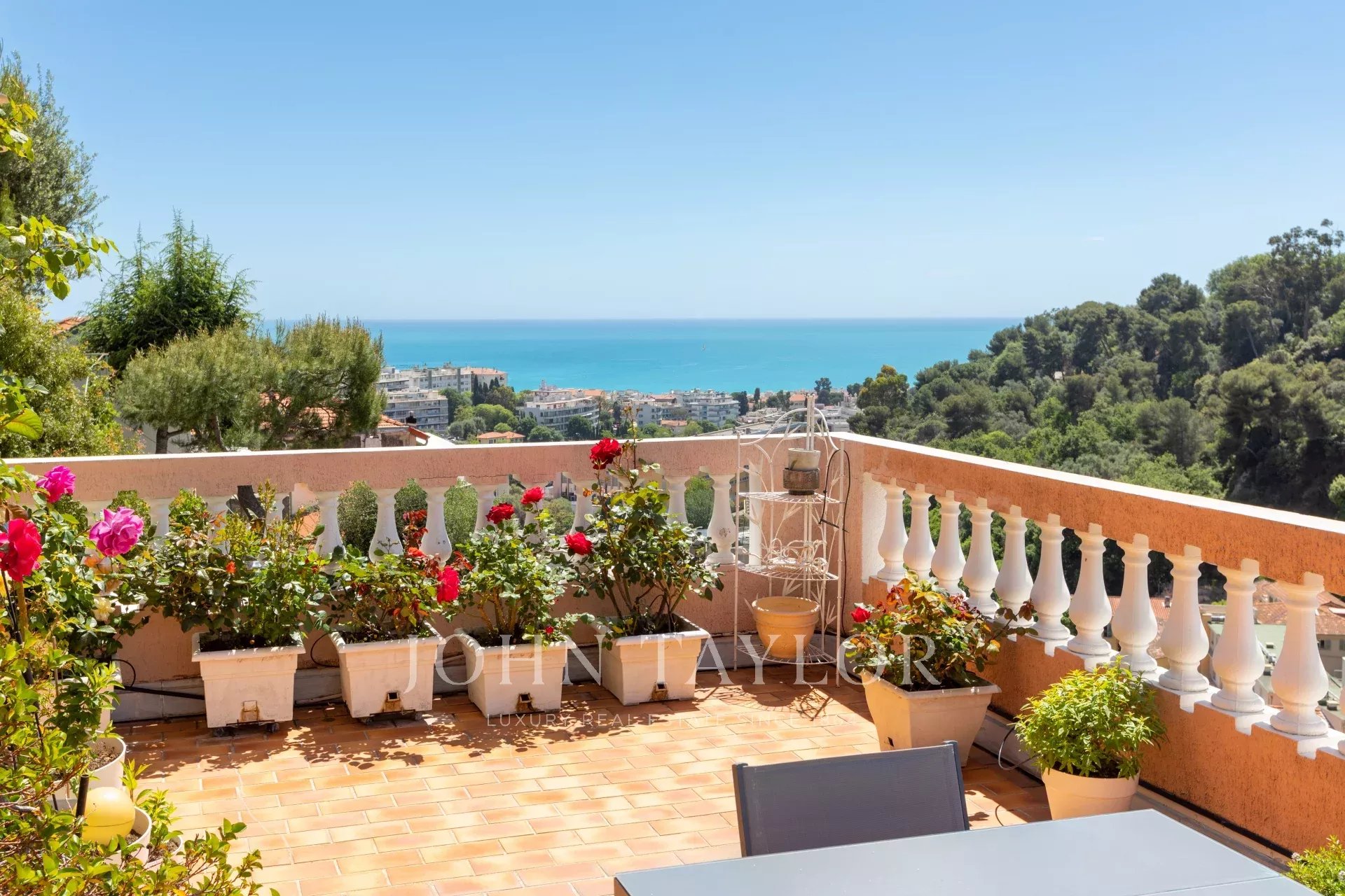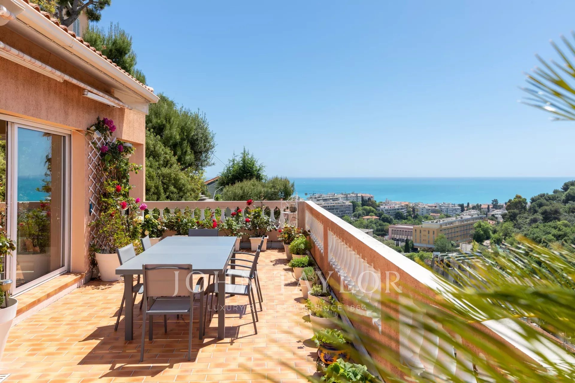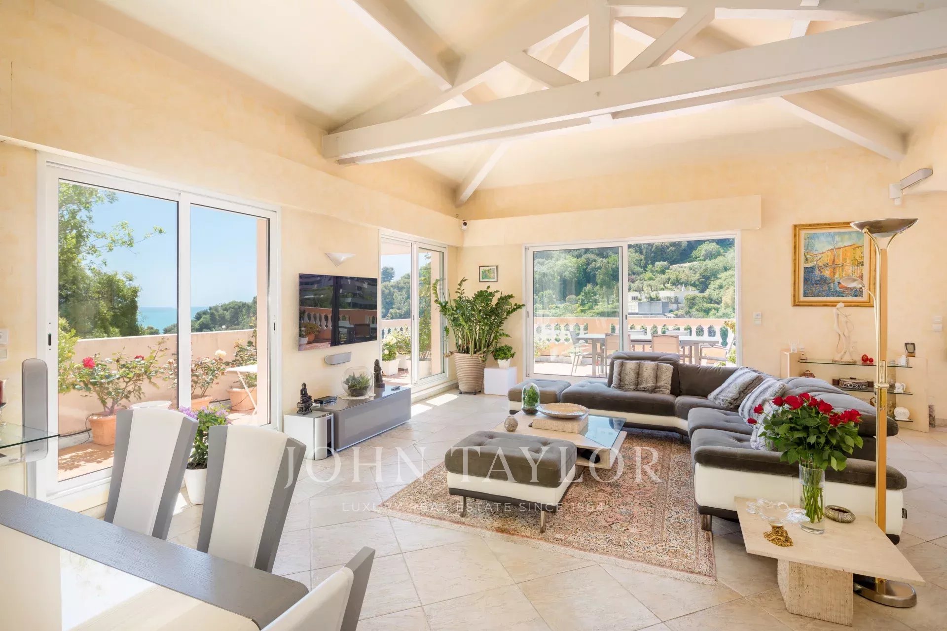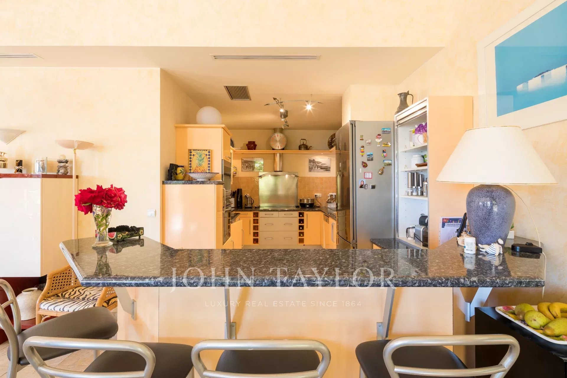 Occupando l'intero ultimo piano di una residenza a misura d'uomo perfettamente mantenuta, esposta a sud/ovest e completamente climatizzata, questo superbo appartamento/villa sul tetto di 174,13 m2 Carrez, servito direttamente da un ascensore, offre una vasta terrazza circolare con una splendida vista panoramica sul mare, su parte della città e sulle colline.
