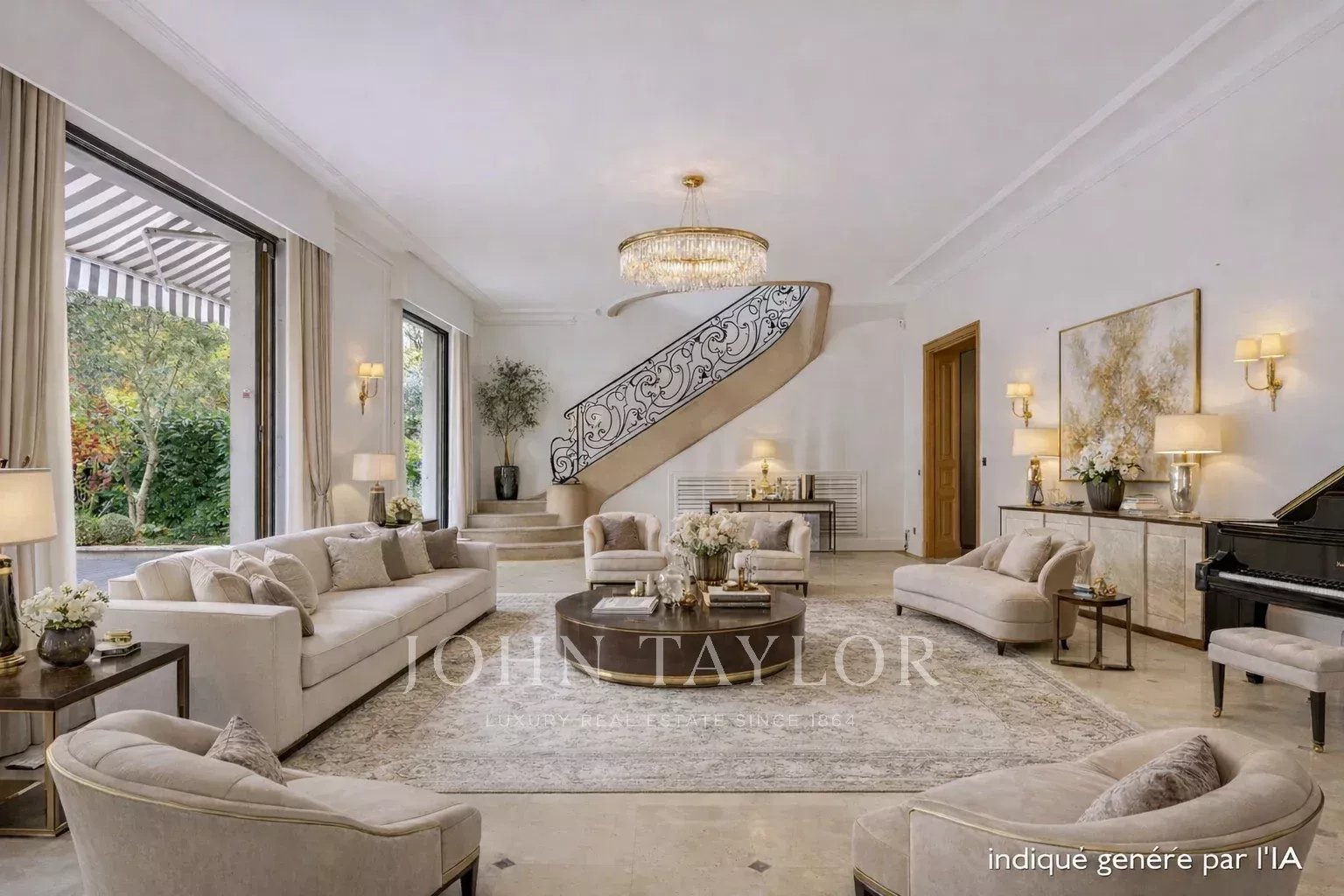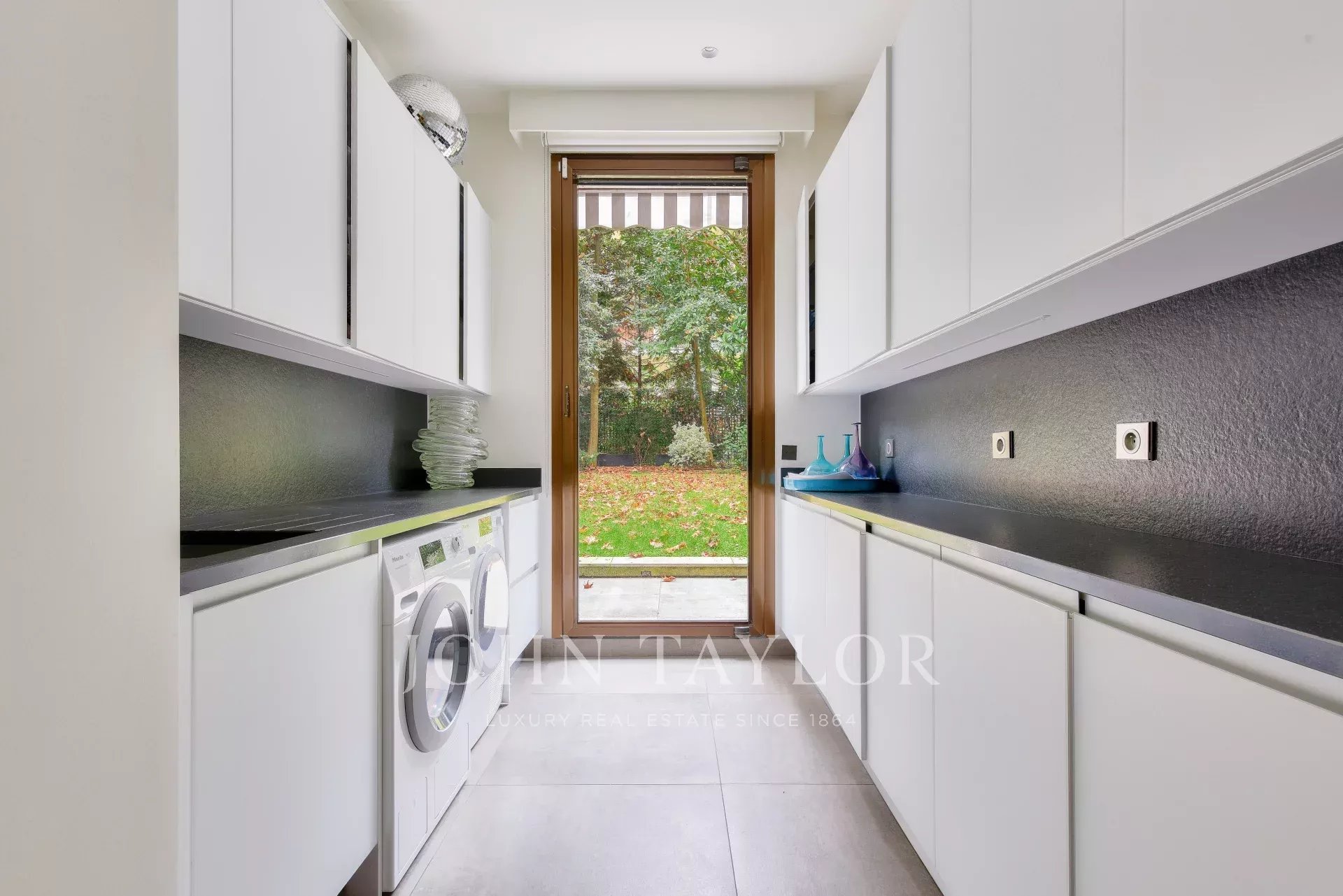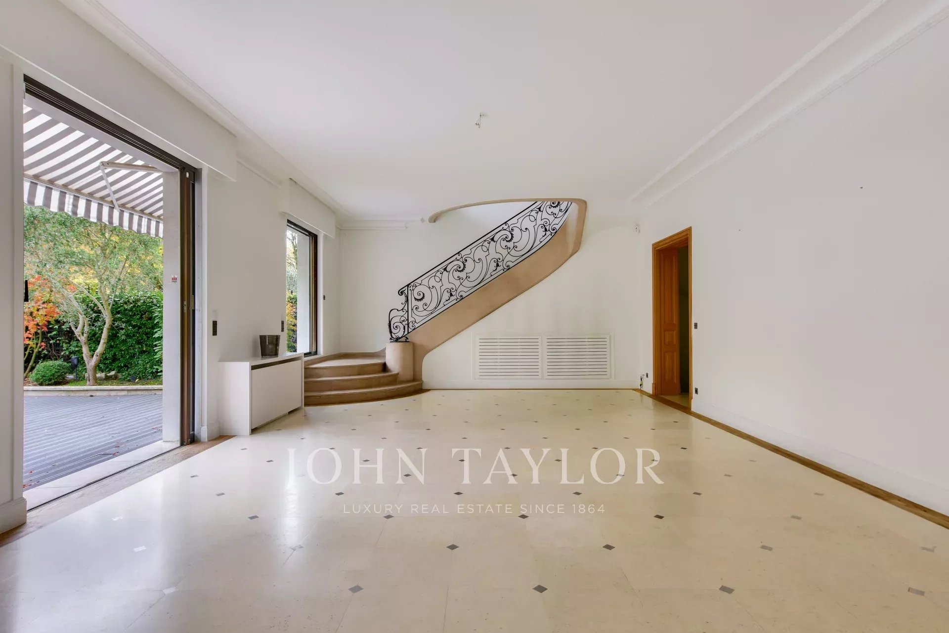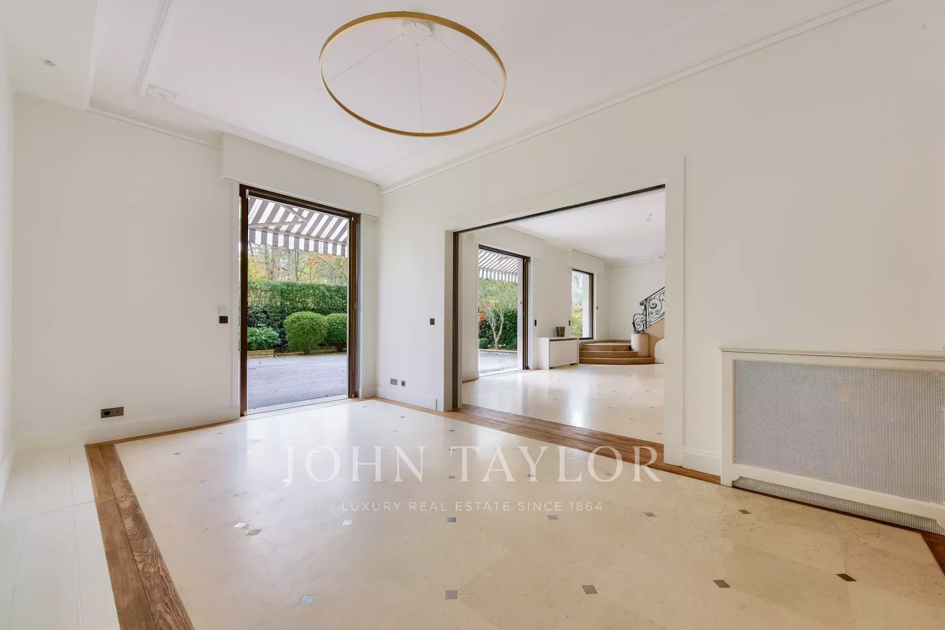 Piano terra: una galleria d'ingresso che conduce a un salone triplo aperto su un giardino di 129 m², una grande cucina, una lavanderia, una sala da pranzo aperta su un giardino esclusivo di 195 m², un bagno per gli ospiti.