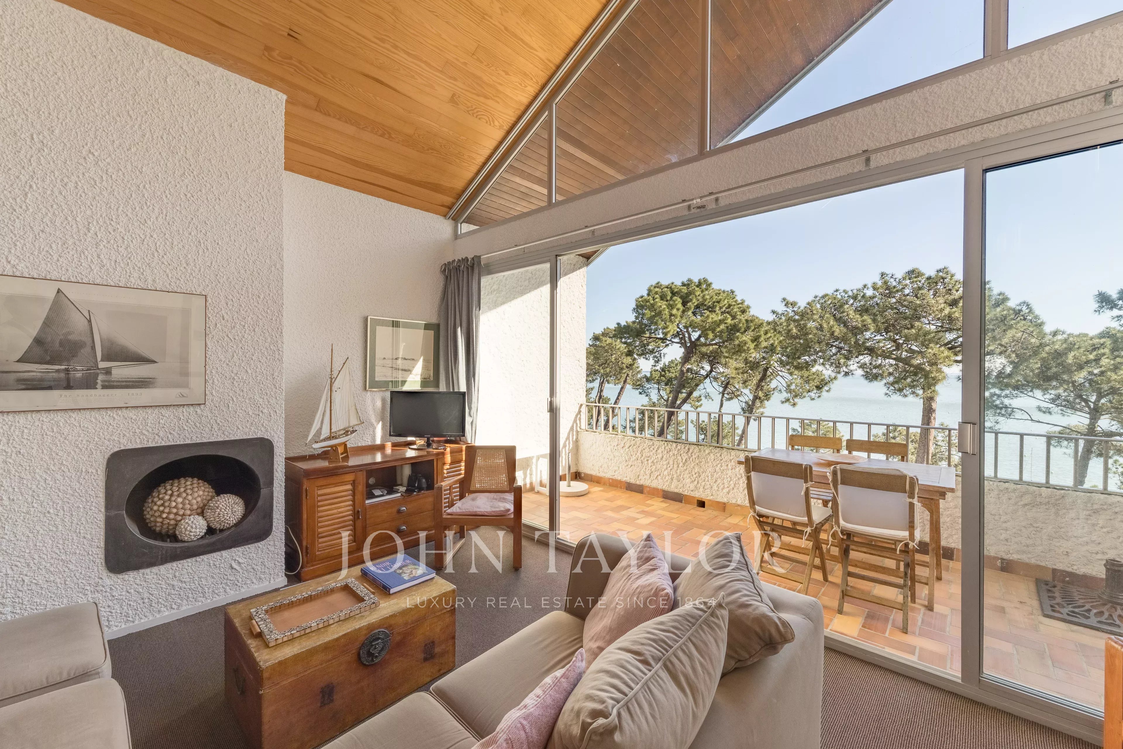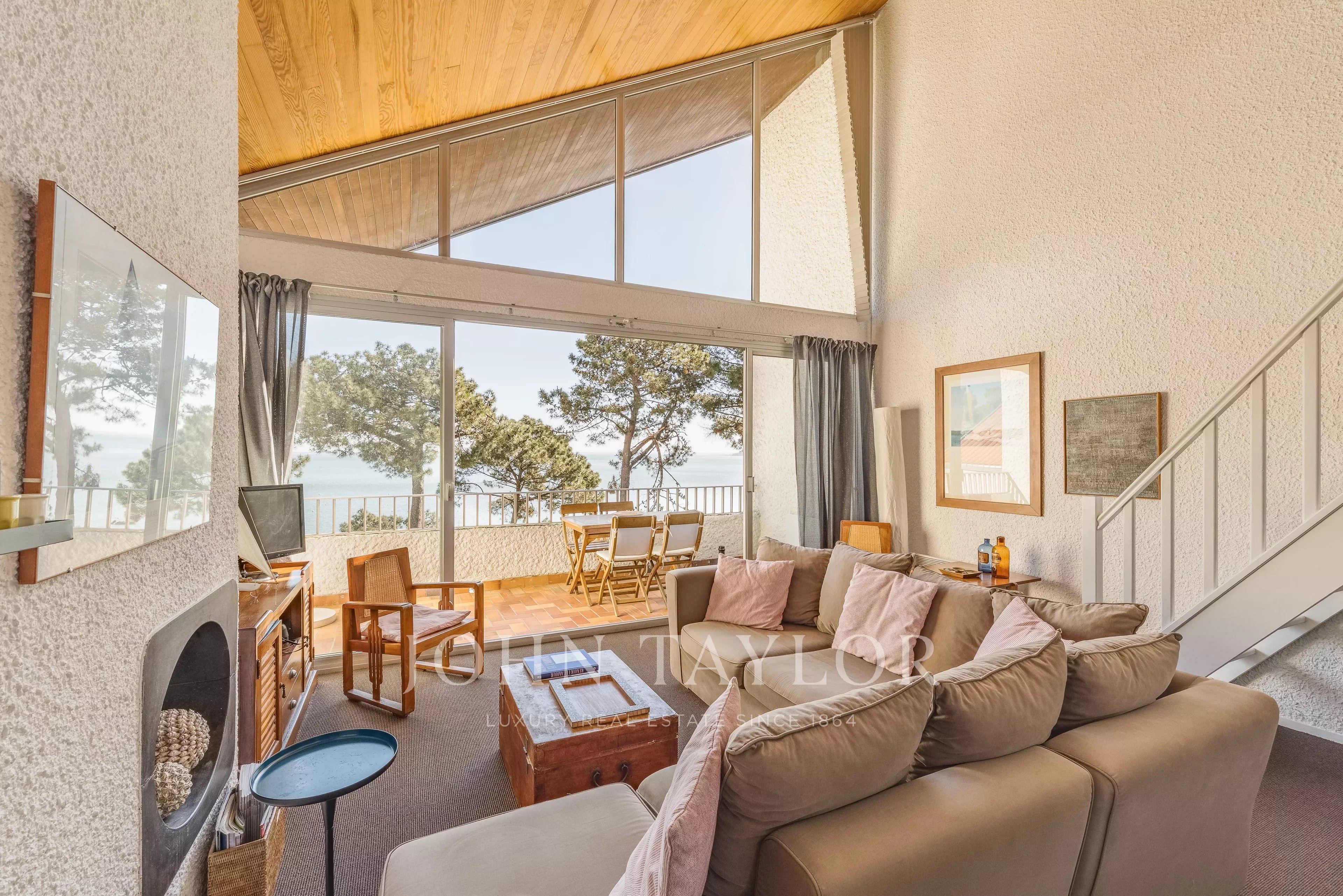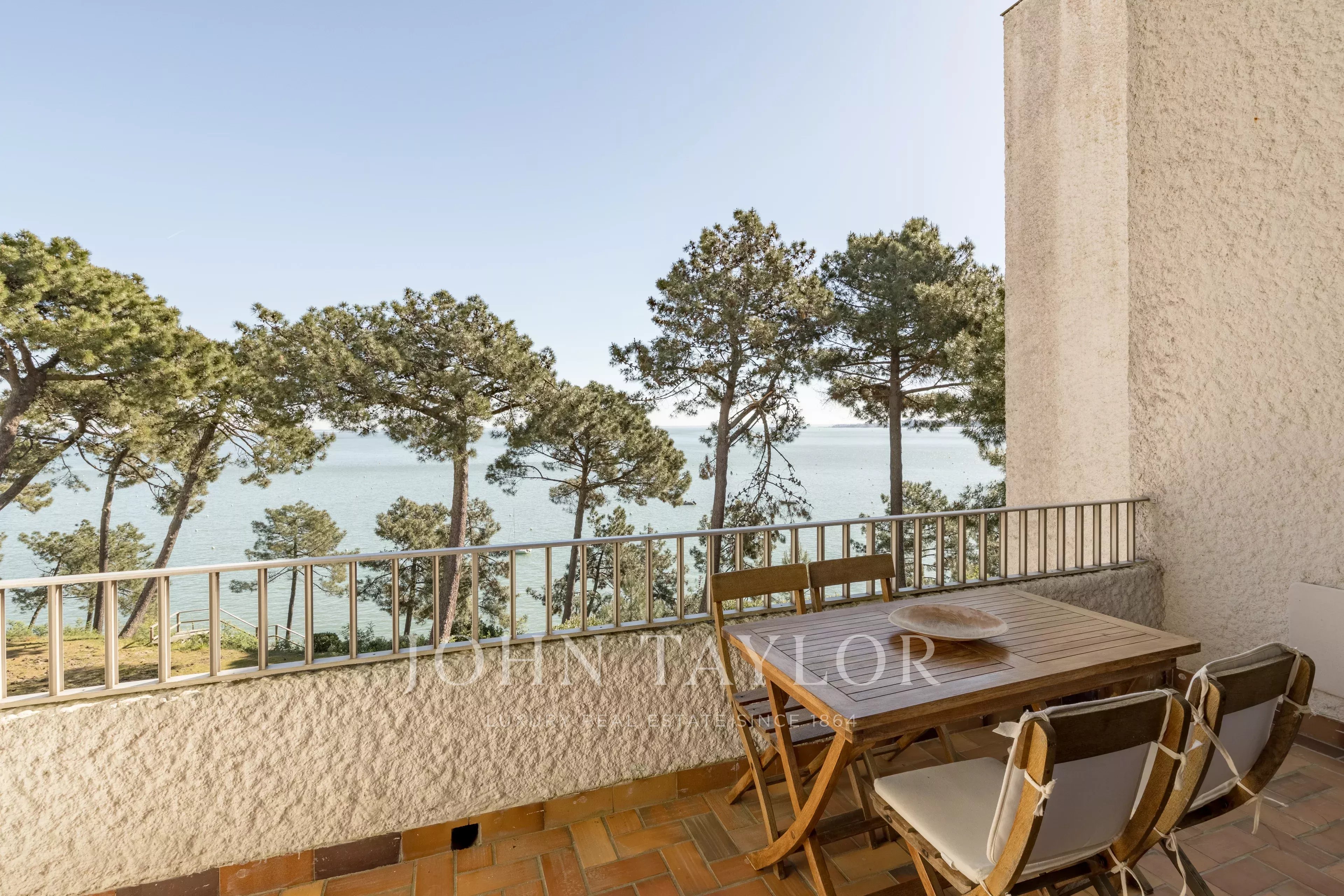La terrazza, il punto culminante della proprietà, offre una vista panoramica assolutamente unica sulle acque del Bassin, sull’Isola degli Uccelli e sulla Duna di Pilat.