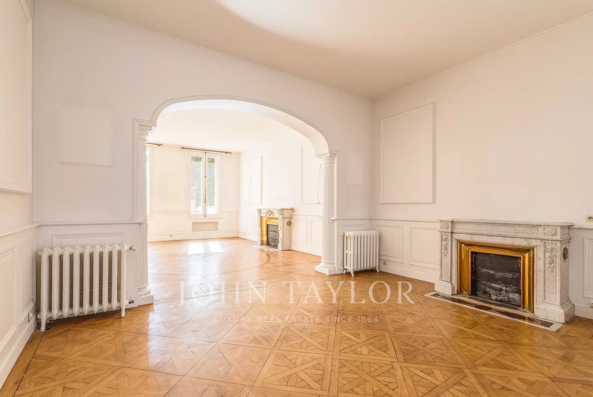 Il soggiorno principale, esposto a sud, è ricco di luce naturale e offre una vista ininterrotta sul Jardin Public.