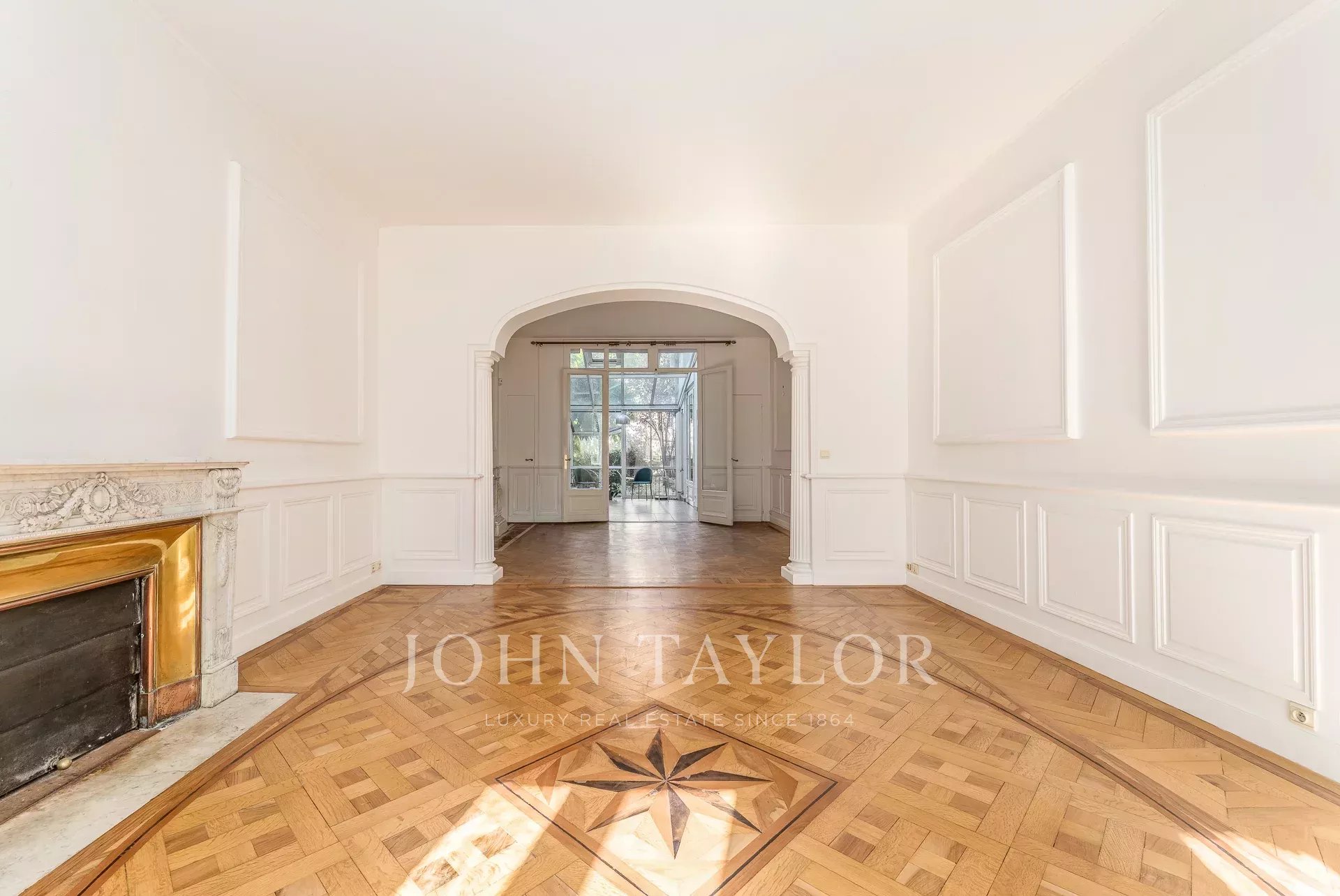 Al piano terra si trova un'ampia zona giorno: un vasto salone con camino, raffinati pavimenti in parquet, modanature e un tetto in vetro che dà accesso a un giardino privato di 100 m², una vera oasi di pace nel centro della città. La cucina e la suite padronale completano questo livello.