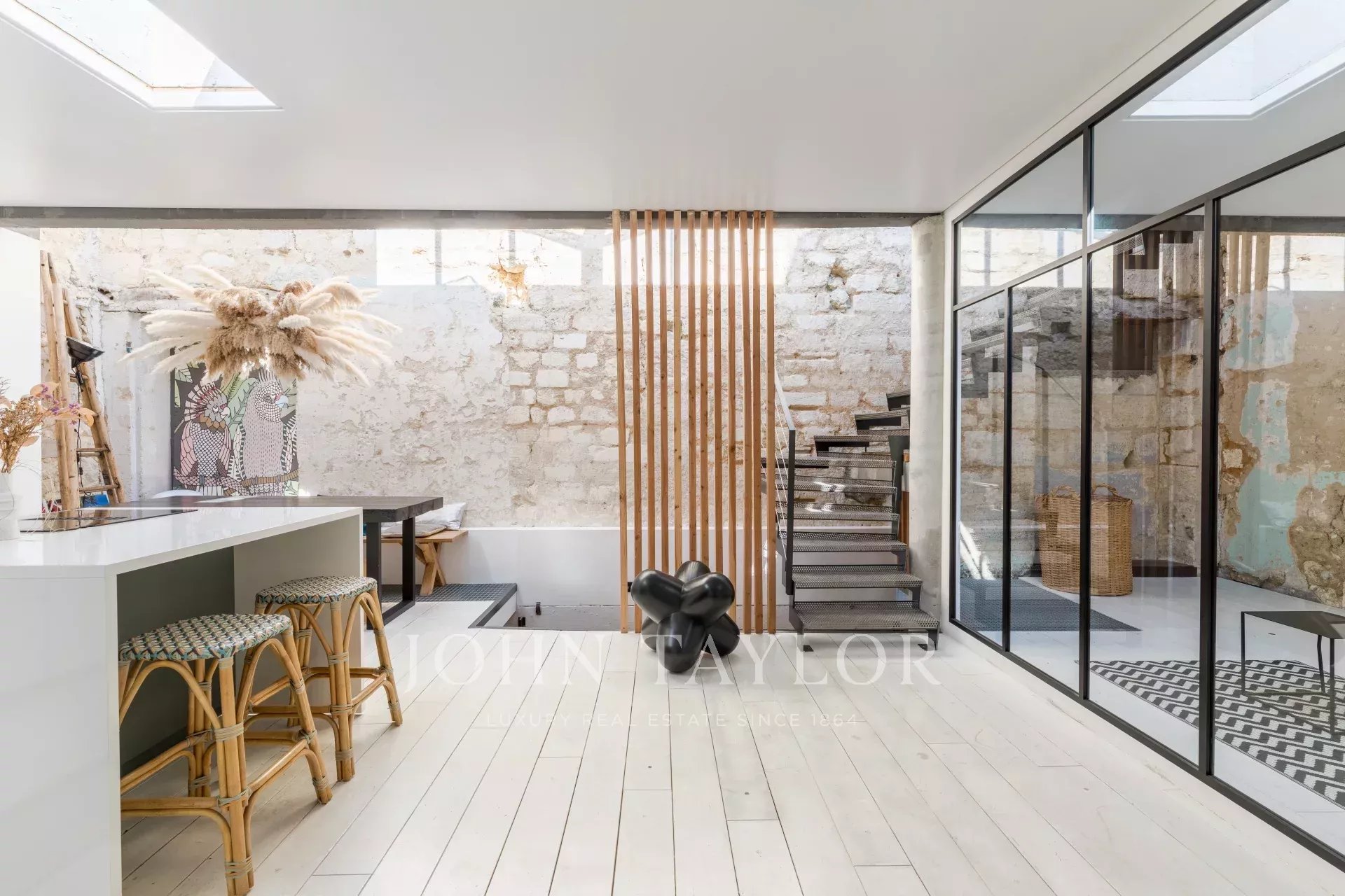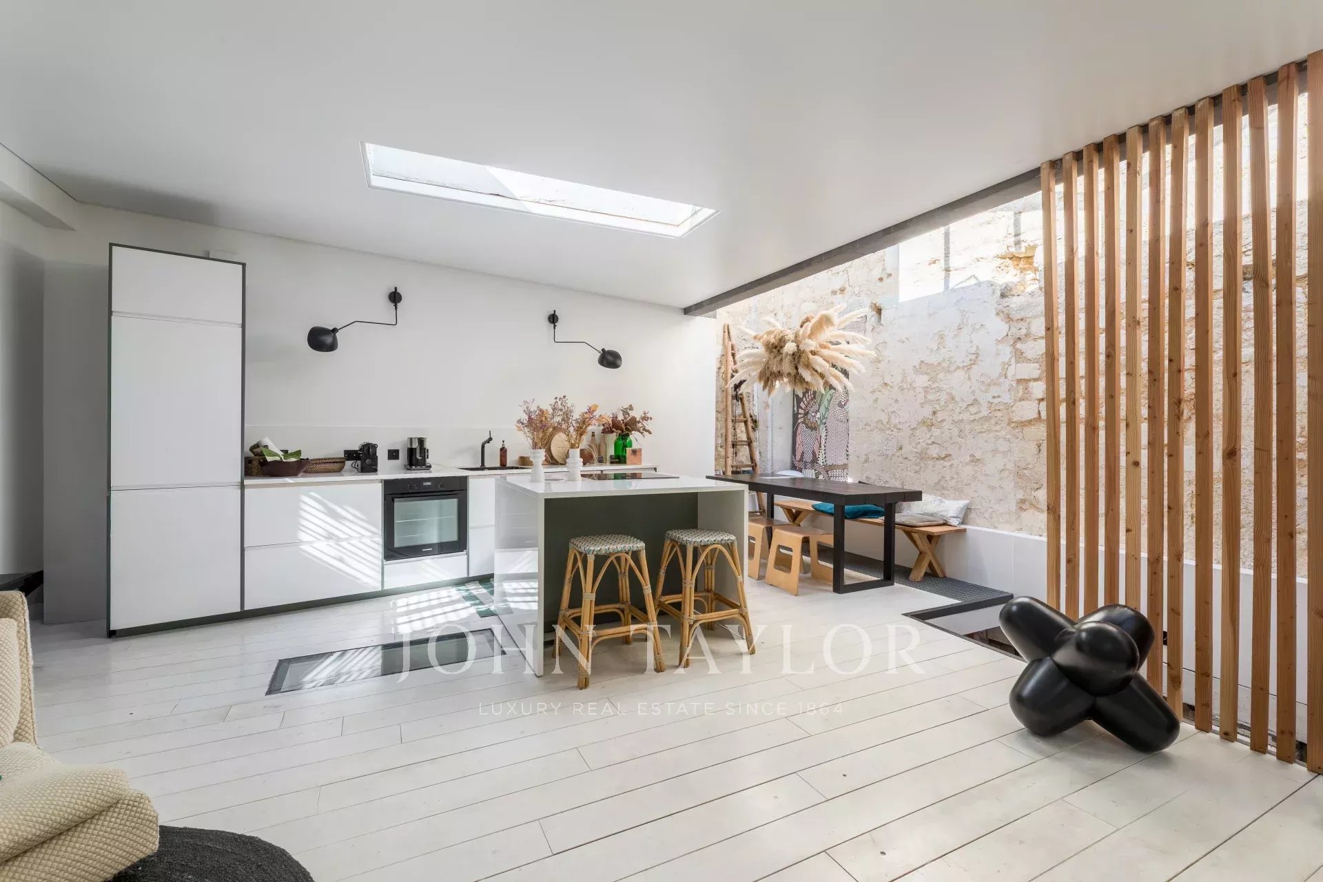 Il triplex è dotato di tutti i comfort moderni, incluse l'aria condizionata e doppi vetri, che assicurano un'ambiente tranquillo e piacevole in ogni stagione. Gli interni, contraddistinti da uno stiloso design contemporaneo, integrano elementi rustici come pareti in pietra e travi a vista. L'area della cucina, con il suo arredamento minimalista, si apre su una sala da pranzo spaziosa, ideale per ricevere ospiti.