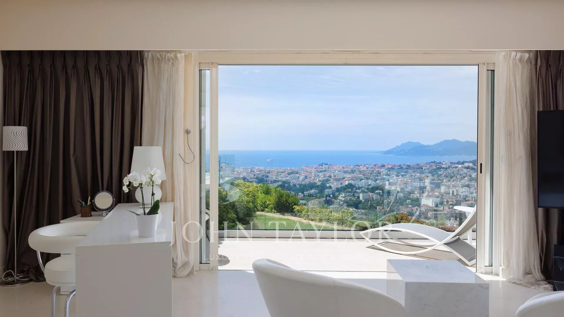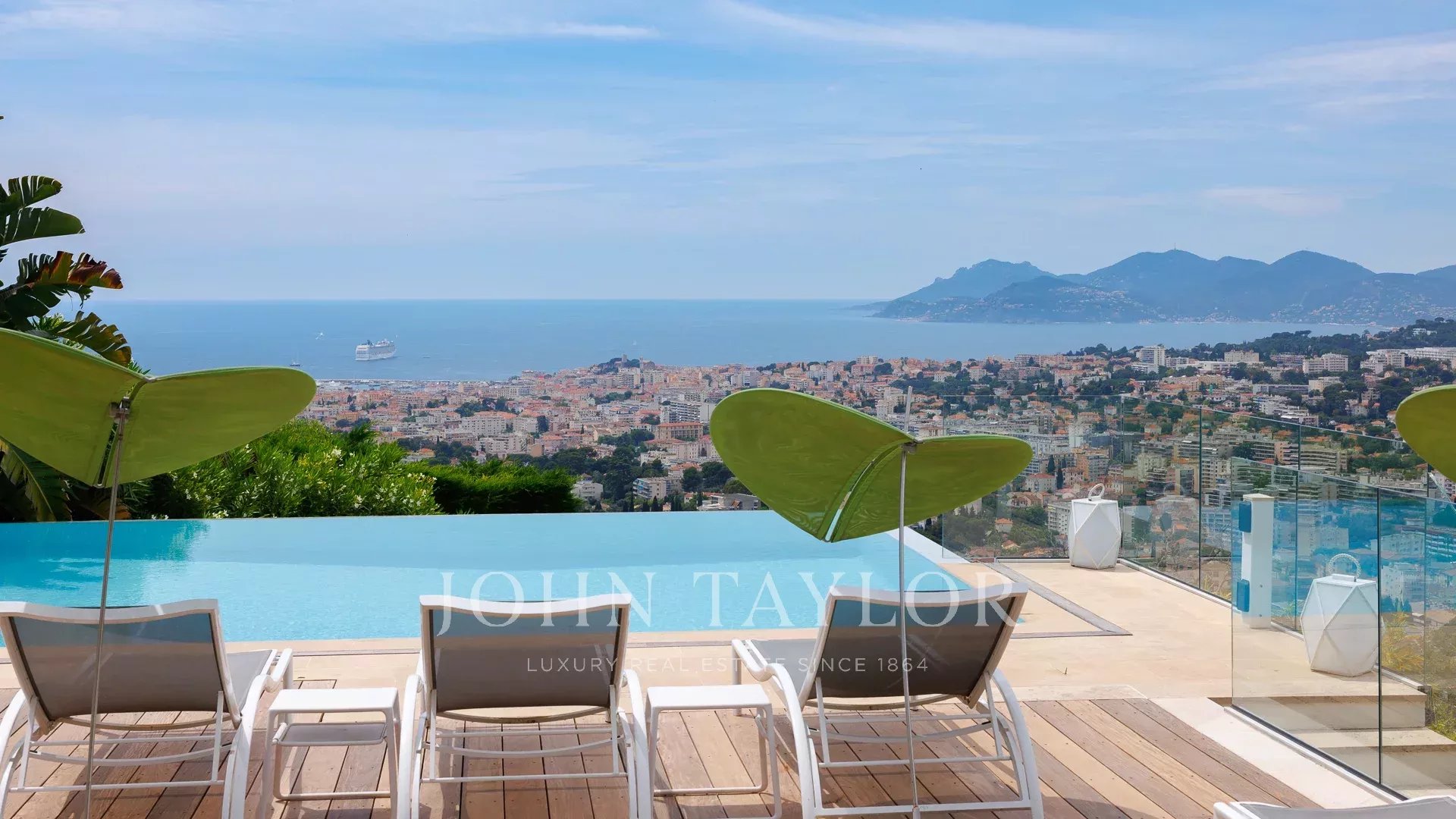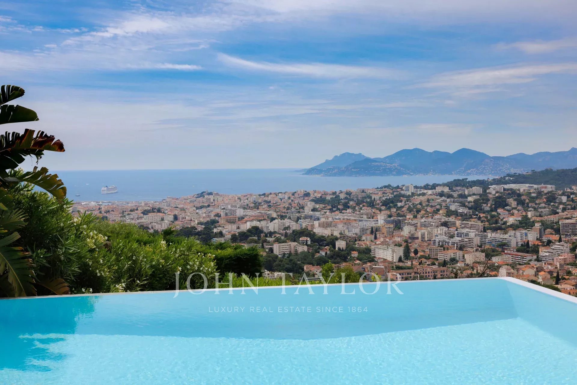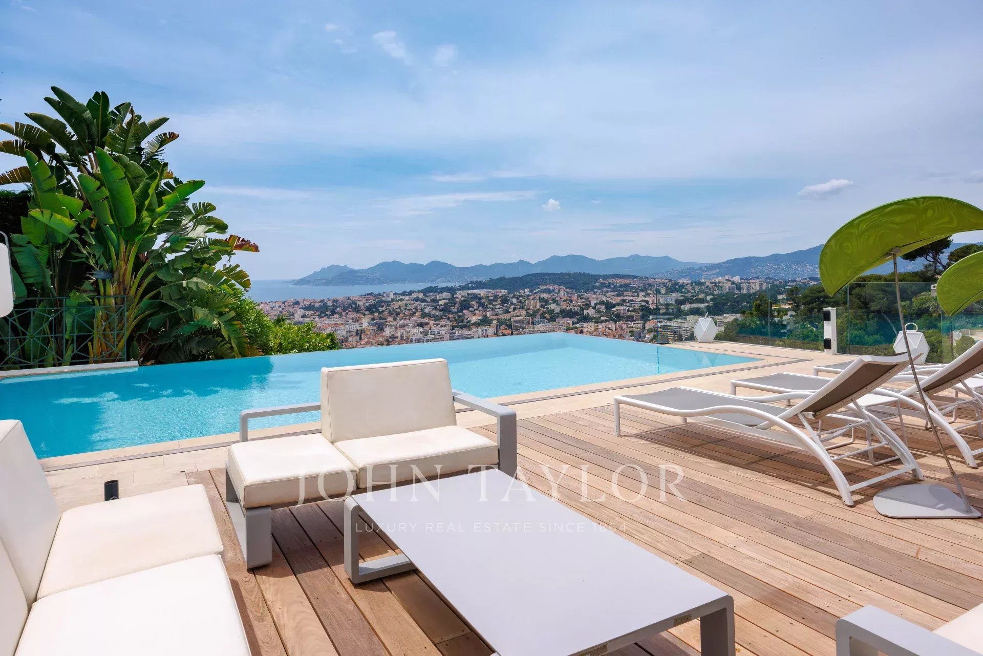 Situata sulle alture di Cannes, in una tenuta privata, questa splendida villa contemporanea di nuova costruzione è completamente climatizzata e vanta una splendida vista sul mare della baia di Cannes e sul massiccio dell'Esterel.