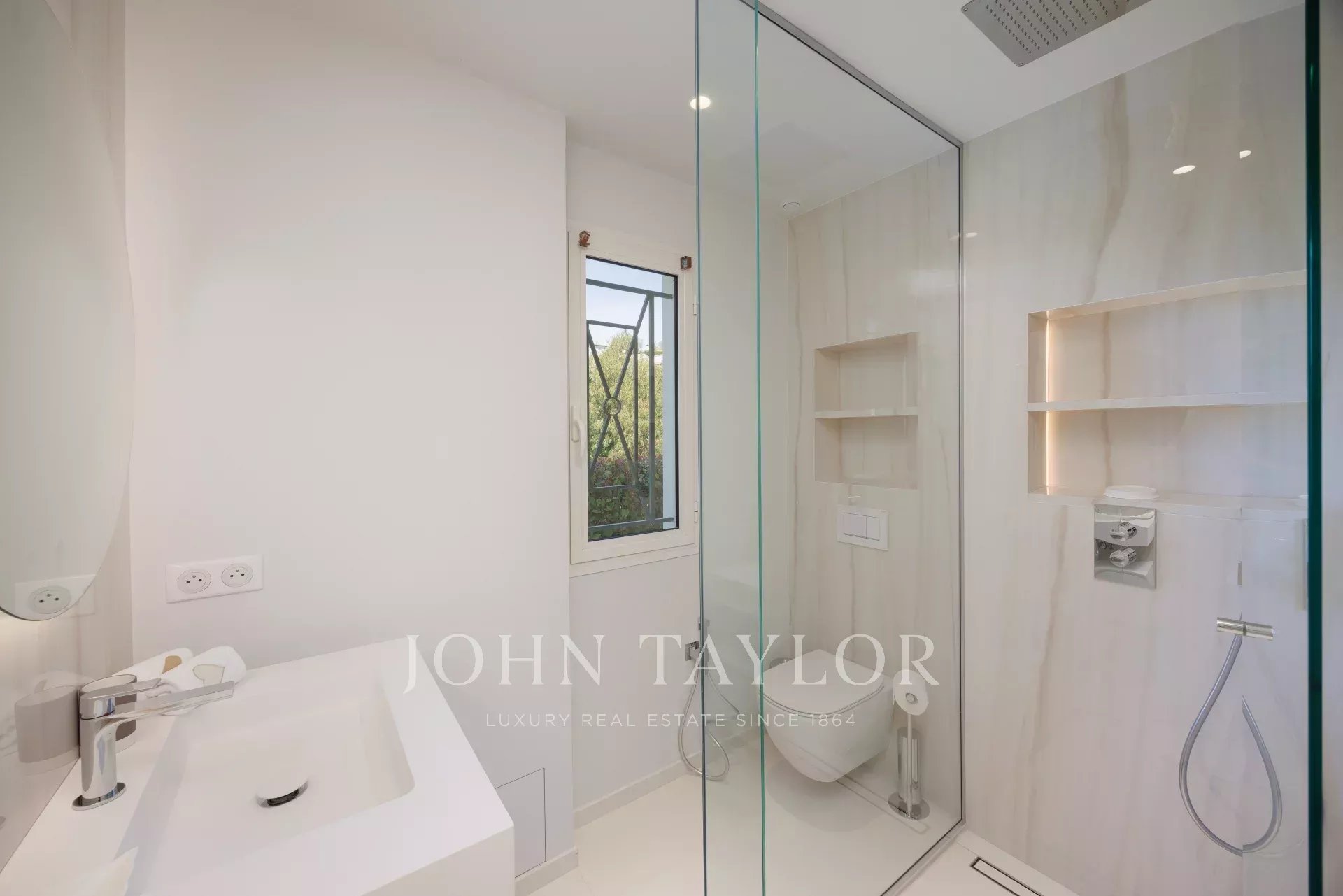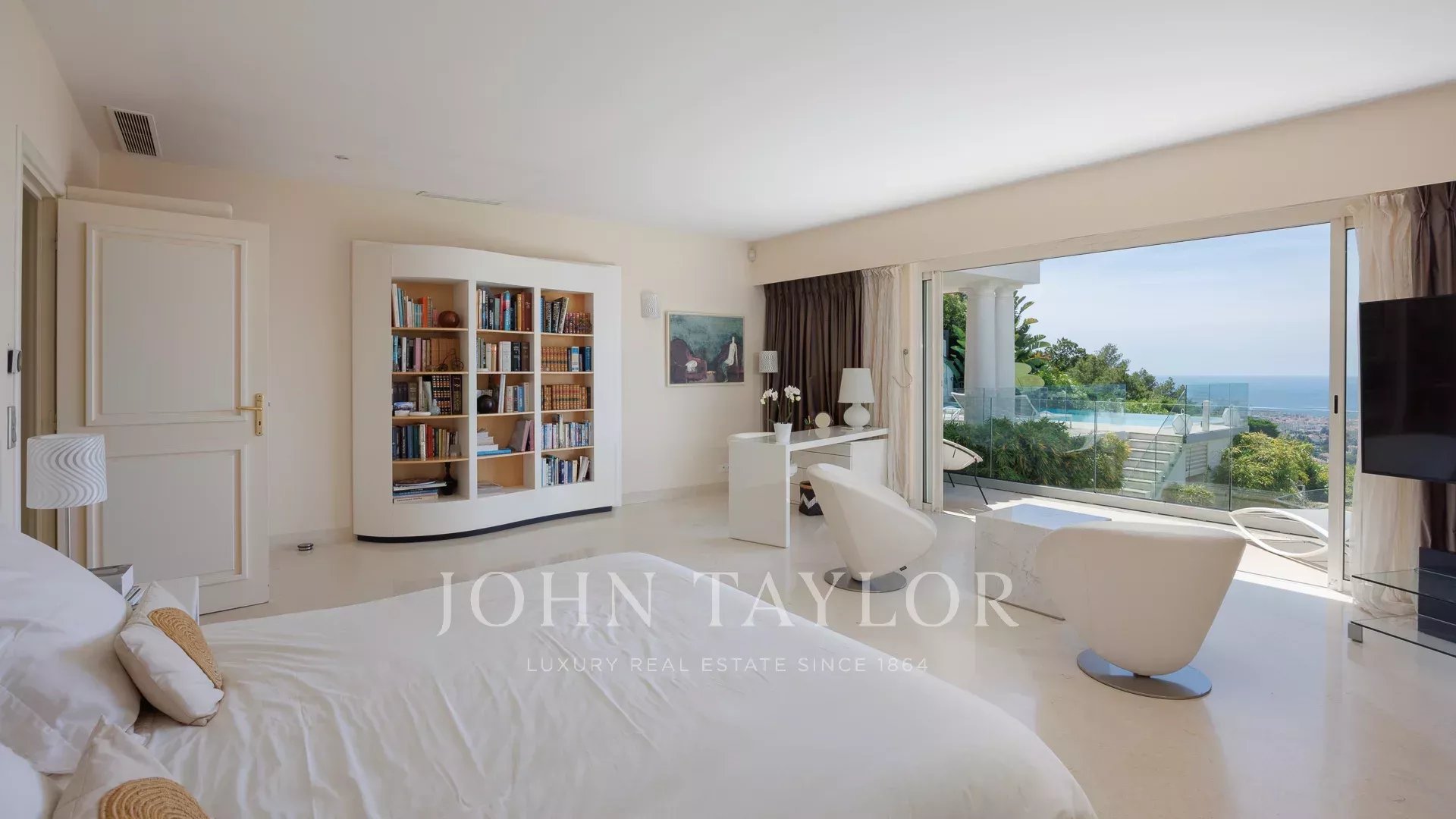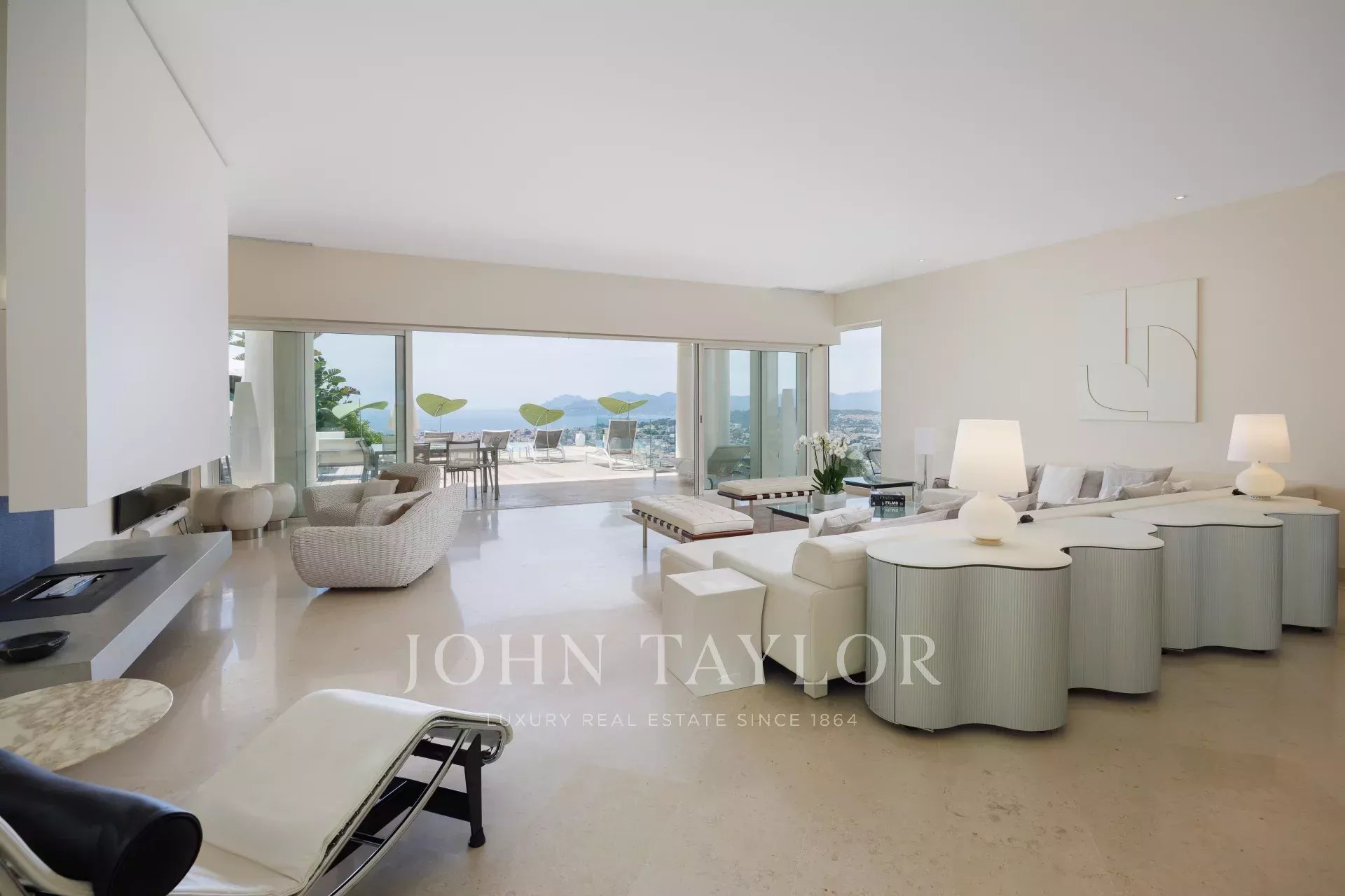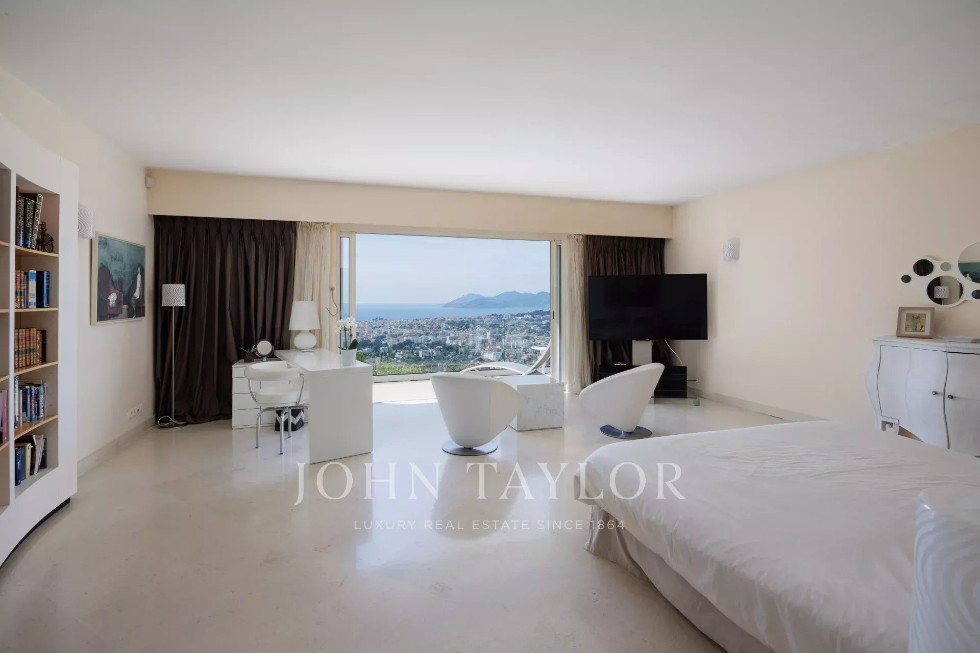 Situata sulle alture di Cannes, in una tenuta privata, questa splendida villa contemporanea di nuova costruzione è completamente climatizzata e vanta una splendida vista sul mare della baia di Cannes e sul massiccio dell'Esterel.