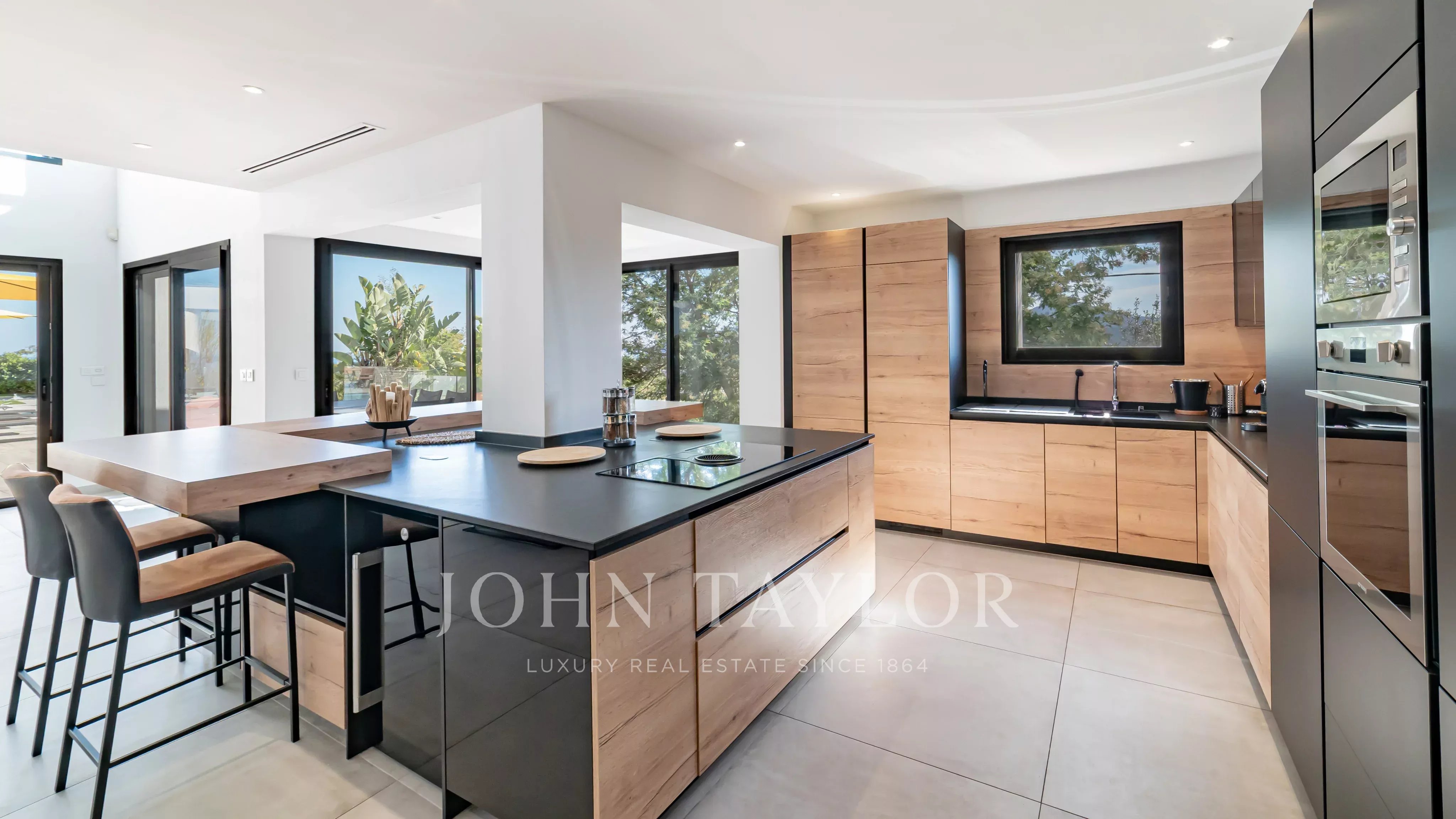 - Maestoso e luminoso soggiorno con soffitti alti 5 m che si apre su un'ampia terrazza e sulla piscina a sfioro riscaldata (11 m x 5 m),
