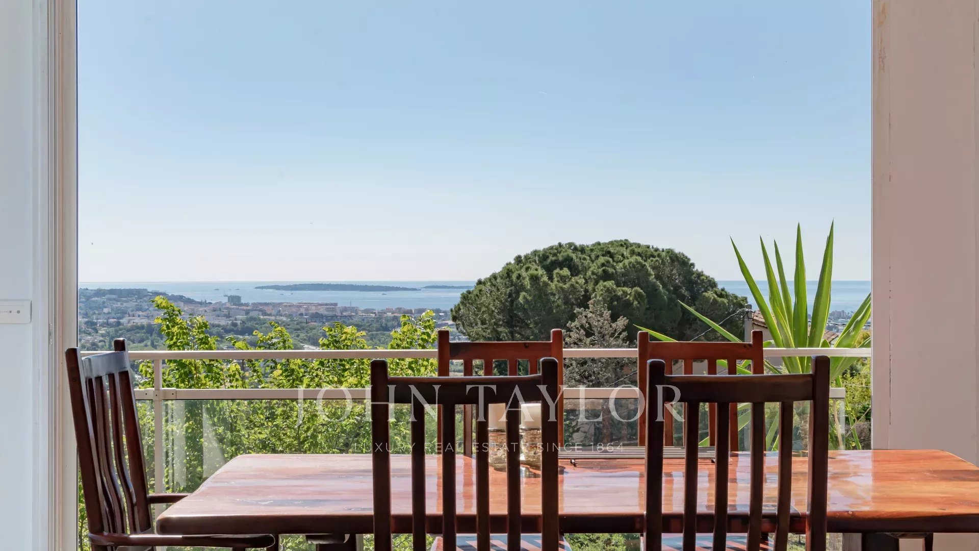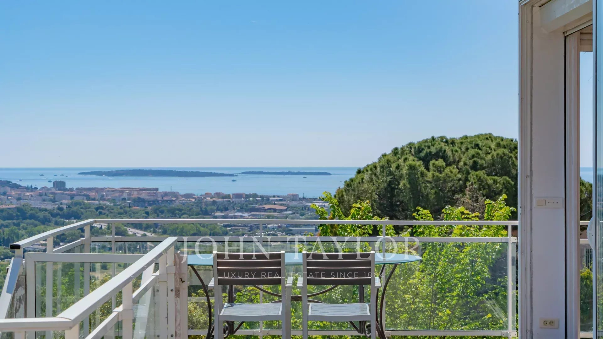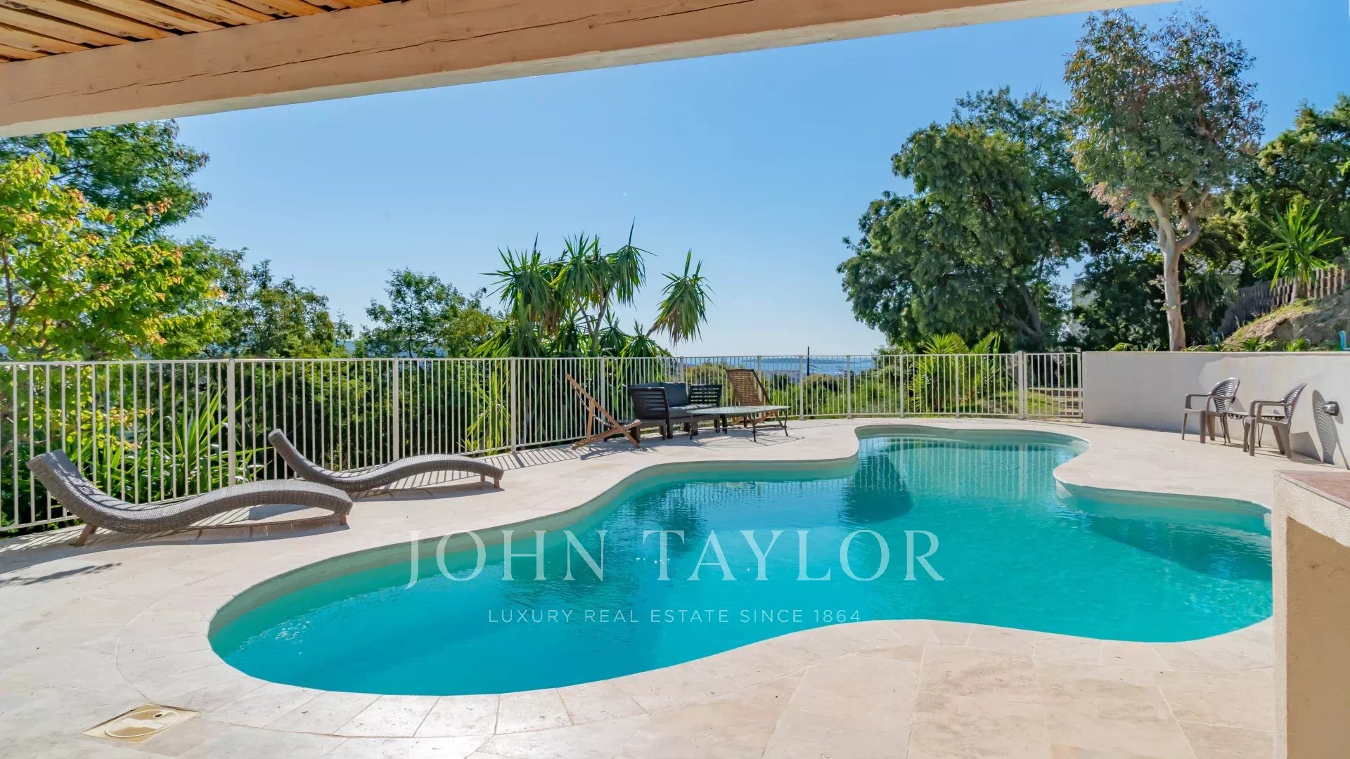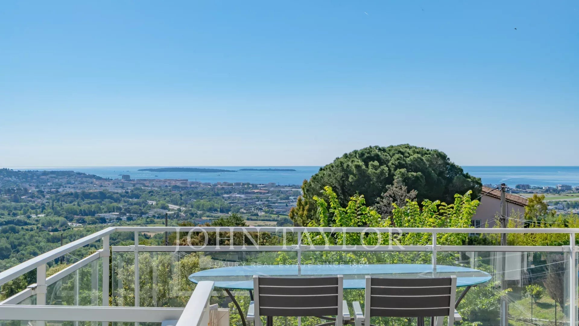 Situata sulla collina di Mandelieu, questa villa in stile contemporaneo vanta una vista panoramica mozzafiato a 270 gradi sulle isole, sulla baia di Cannes, sul massiccio dell'Estérel e sulle Alpi.