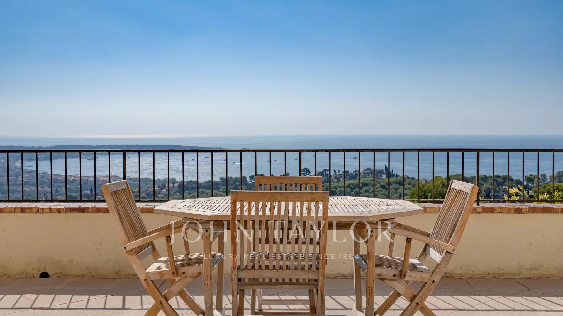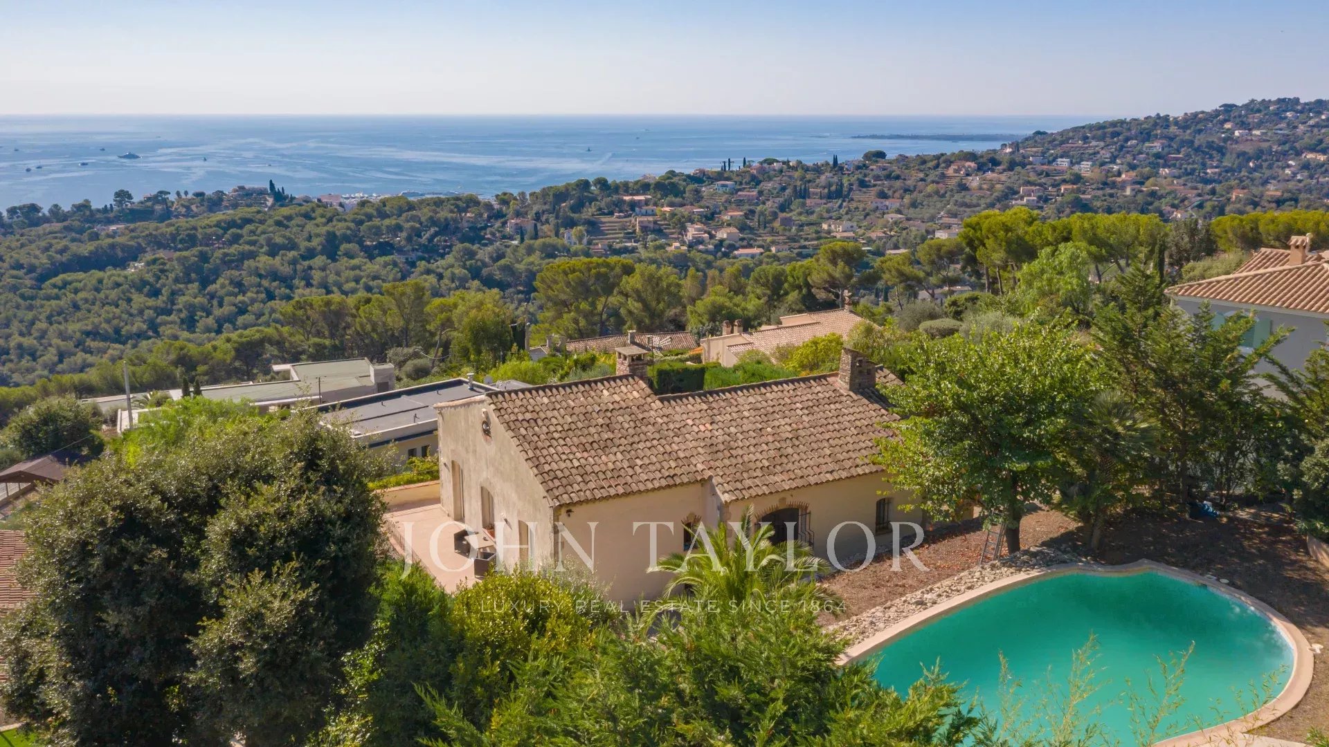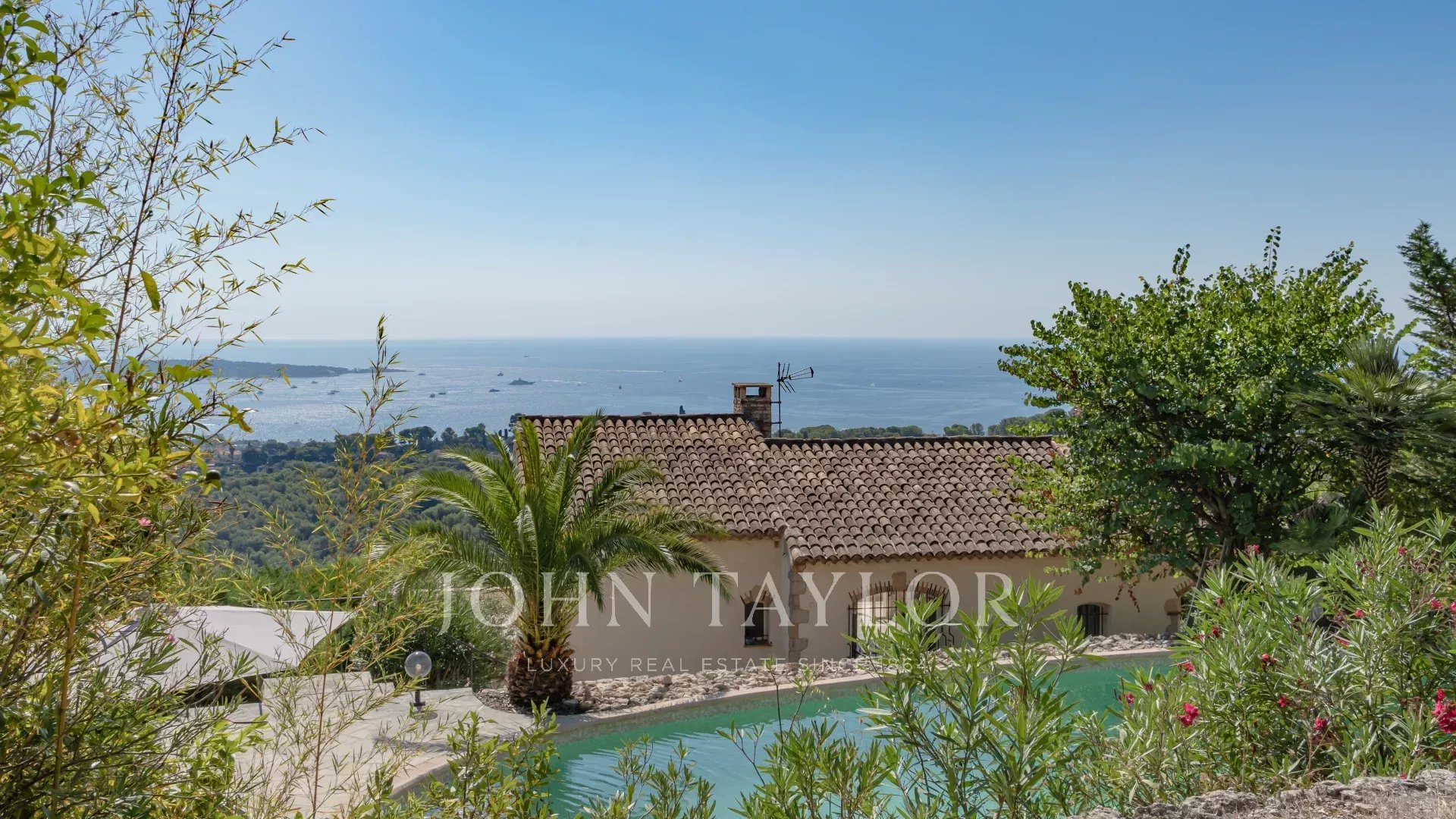 Sulle alture di Golfe Juan, vicino alle strade principali, questa villa provenzale su 1820 m² di terreno con piscina offre una vista eccezionale sul mare e su Cap d'Antibes.