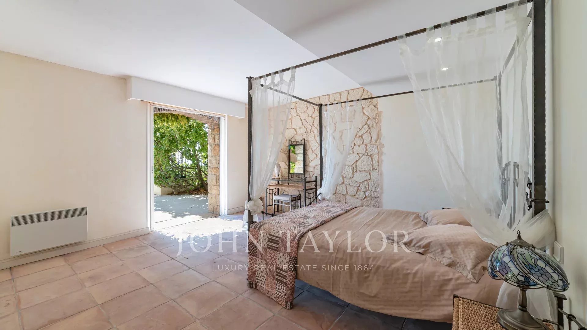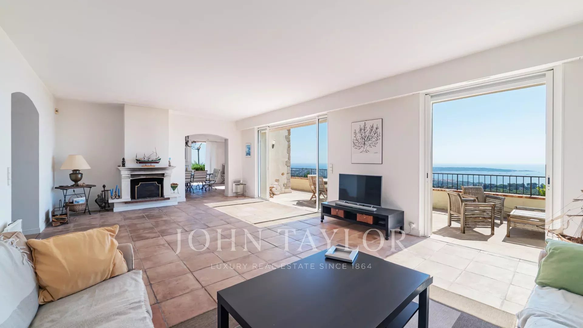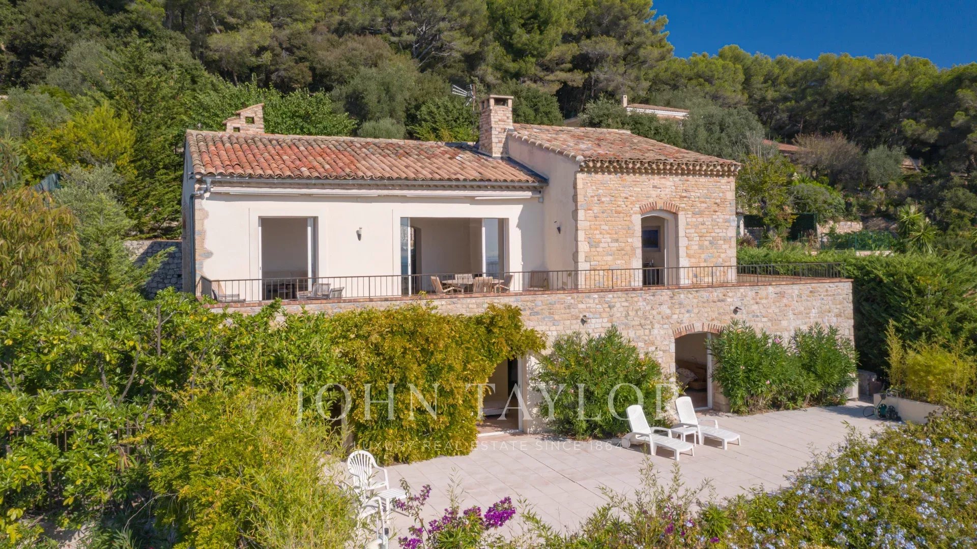 Sulle alture di Golfe Juan, vicino alle strade principali, questa villa provenzale su 1820 m² di terreno con piscina offre una vista eccezionale sul mare e su Cap d'Antibes.
