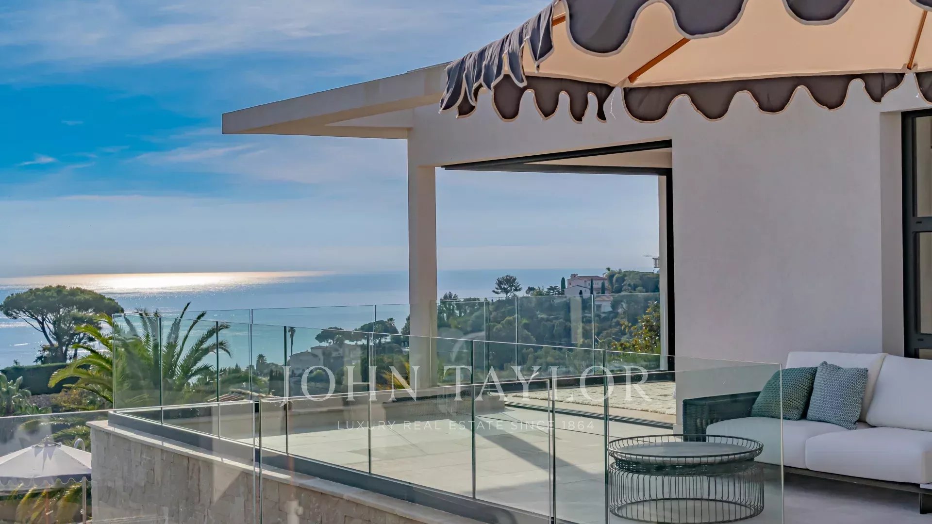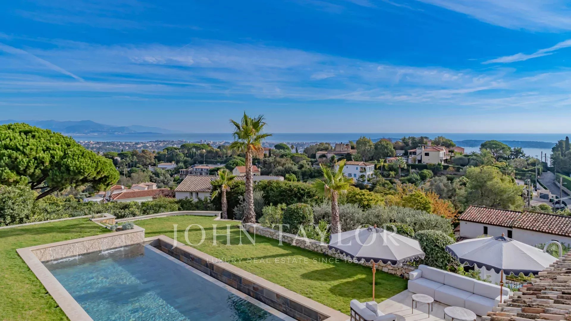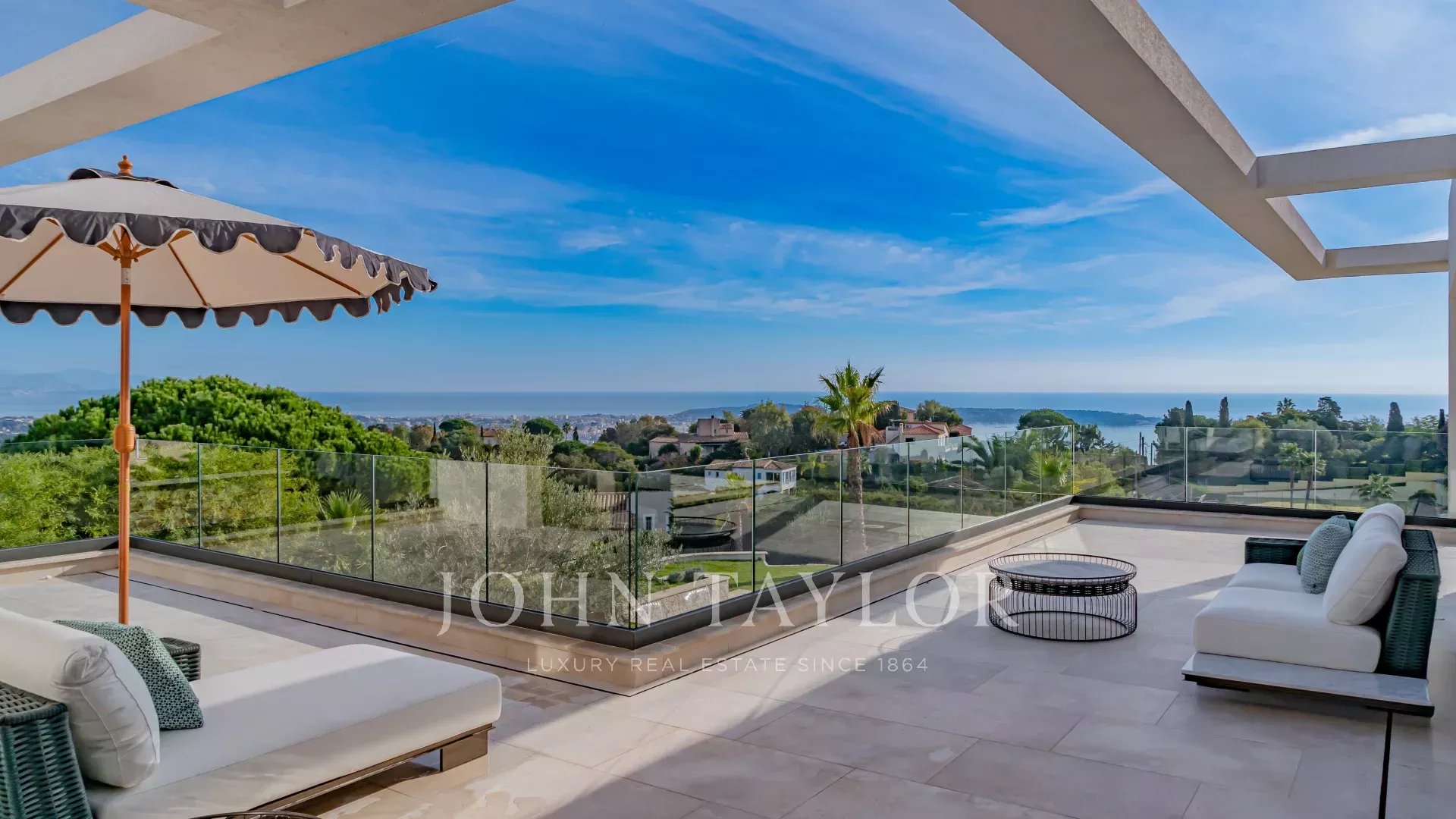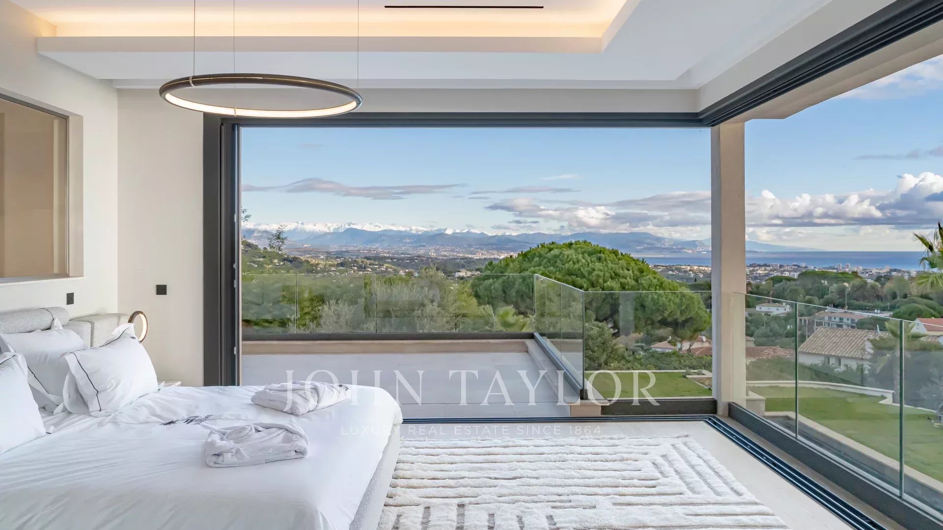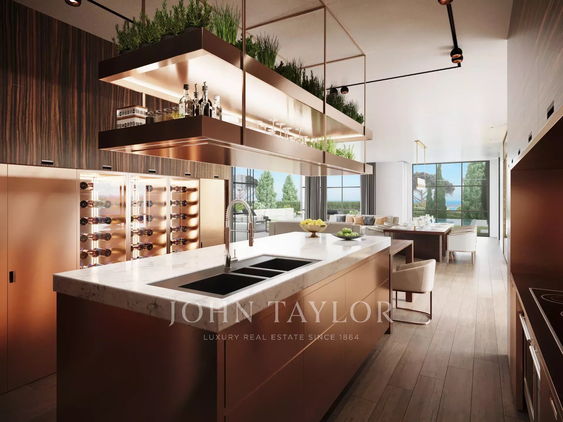 Questa villa contemporanea di circa 400 m² si trova in una tenuta recintata nella prestigiosa e silenziosa zona residenziale di Super Cannes. Situata in posizione dominante su un terreno di 2.090 m², la proprietà gode di una vista sublime che spazia da Cap d'Antibes alle Alpi fino alle montagne italiane.