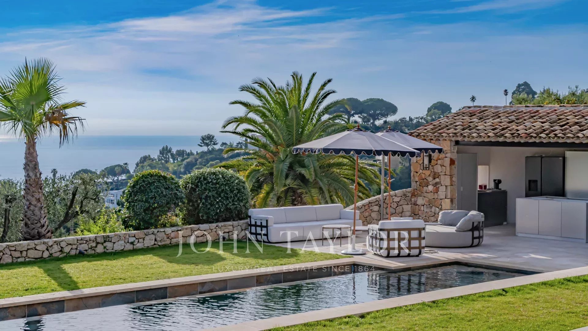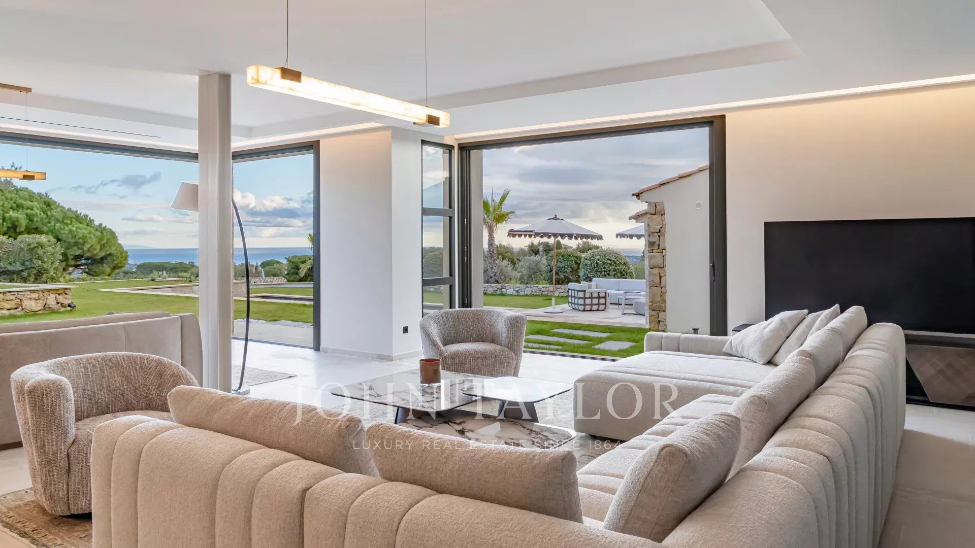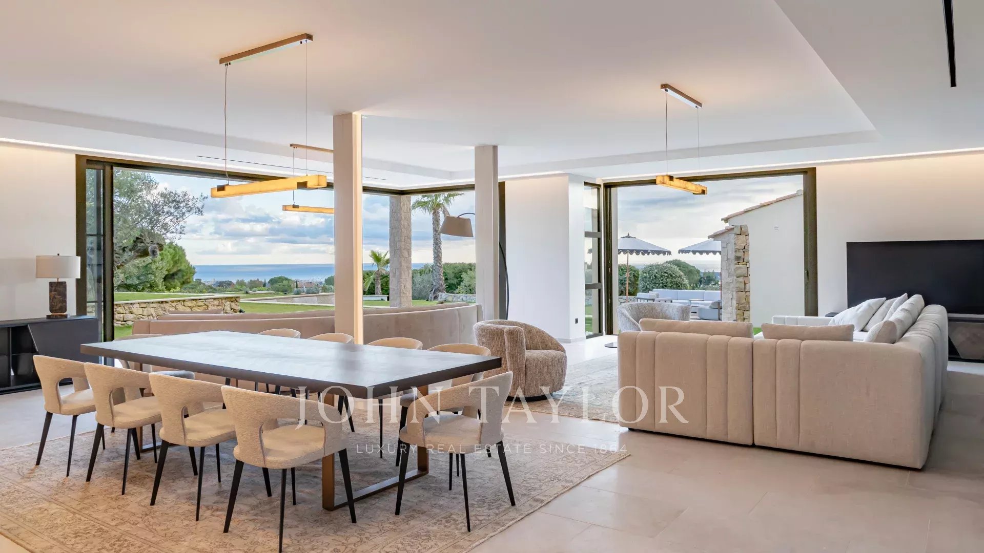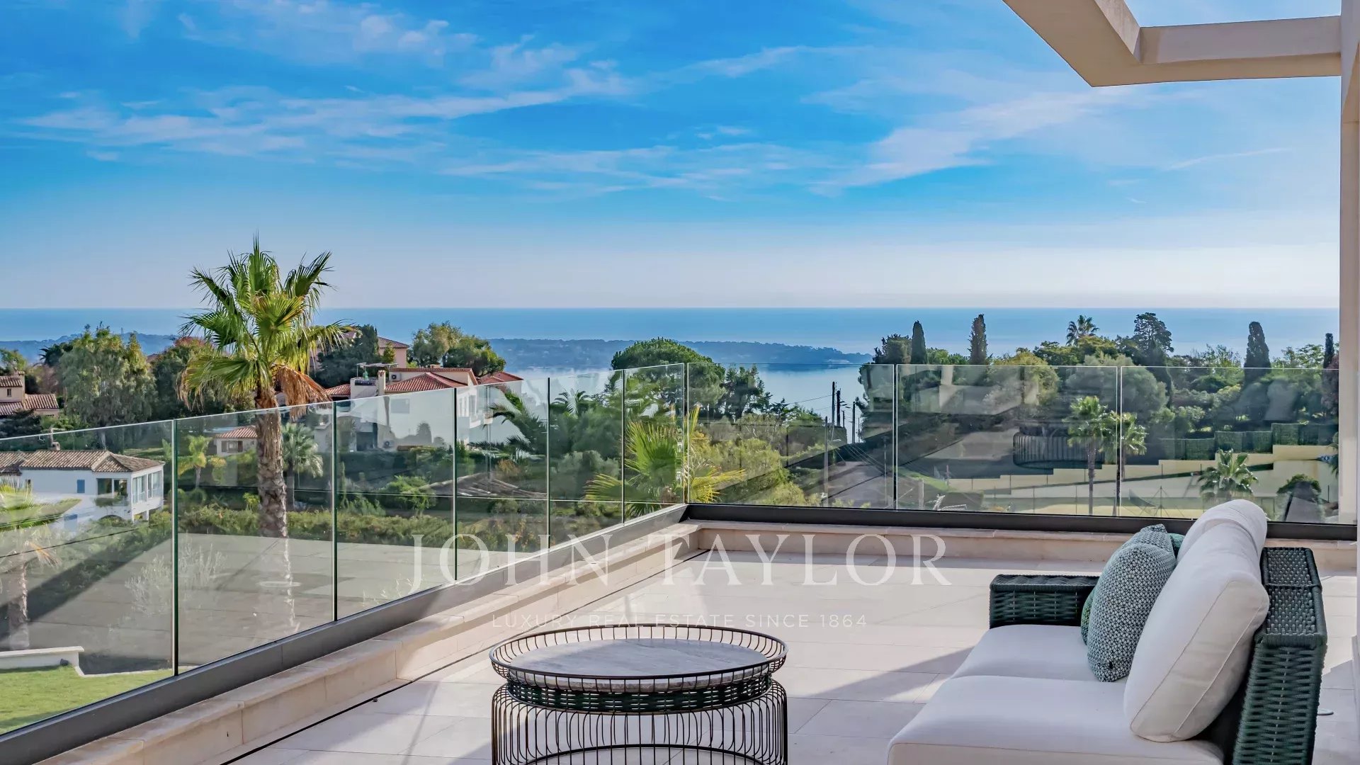Questa villa contemporanea di circa 400 m² si trova in una tenuta recintata nella prestigiosa e silenziosa zona residenziale di Super Cannes. Situata in posizione dominante su un terreno di 2.090 m², la proprietà gode di una vista sublime che spazia da Cap d'Antibes alle Alpi fino alle montagne italiane.