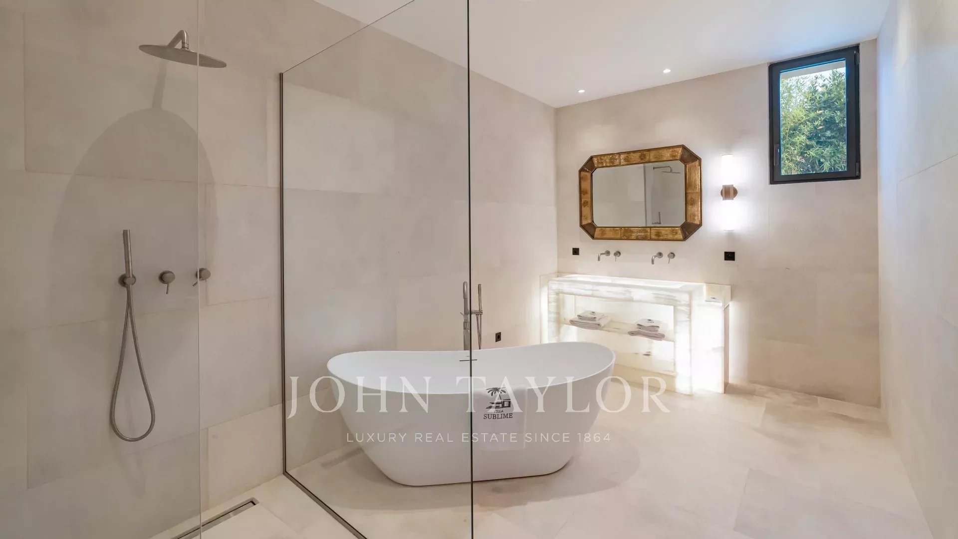 La villa è circondata da un magnifico giardino mediterraneo con piscina a sfioro, vasca idromassaggio e pool house.