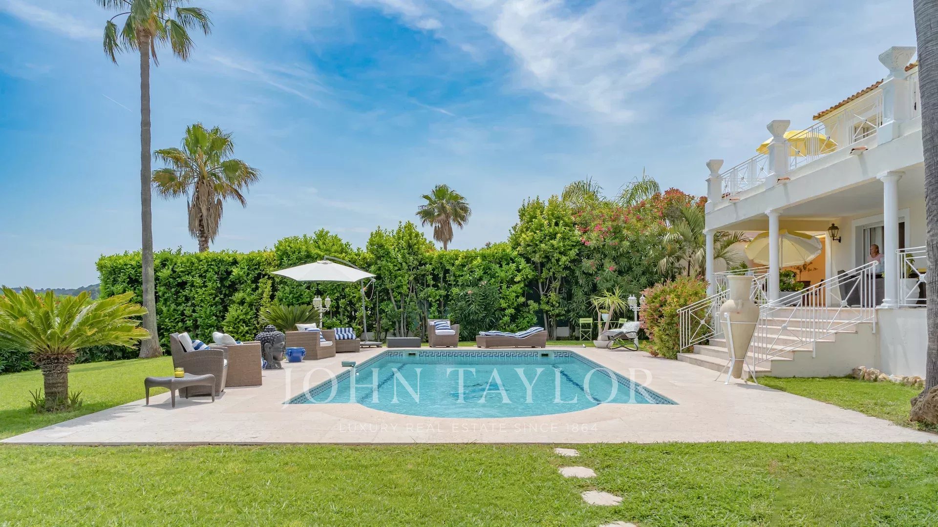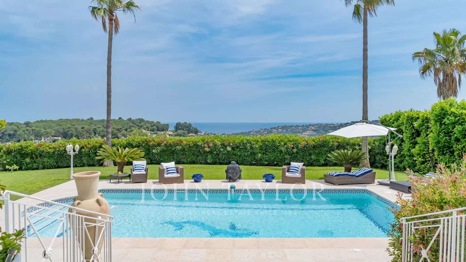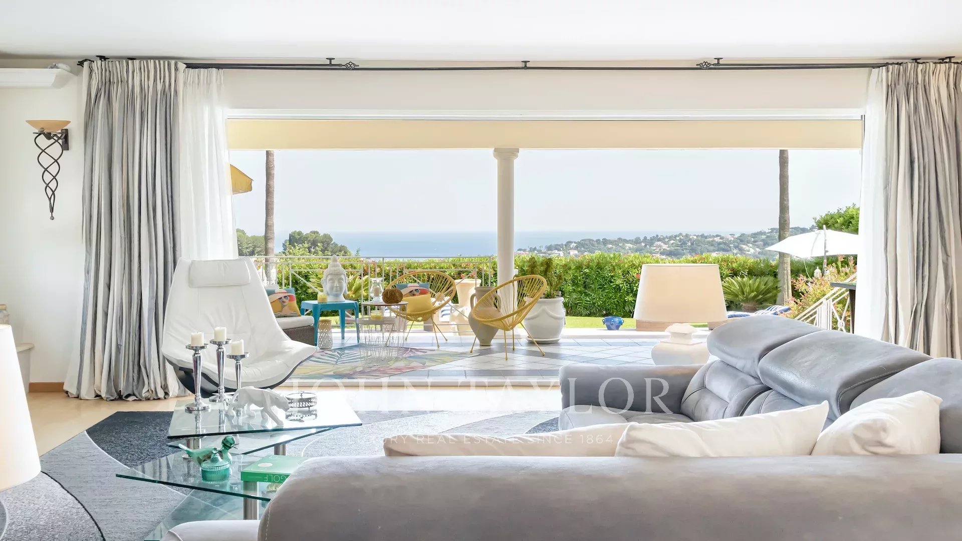Situata sulle alture di Vallauris, in una tranquilla tenuta recintata, questa splendida villa è stata completamente ristrutturata secondo standard elevati e vanta una vista ininterrotta sul mare e sulle verdi colline.