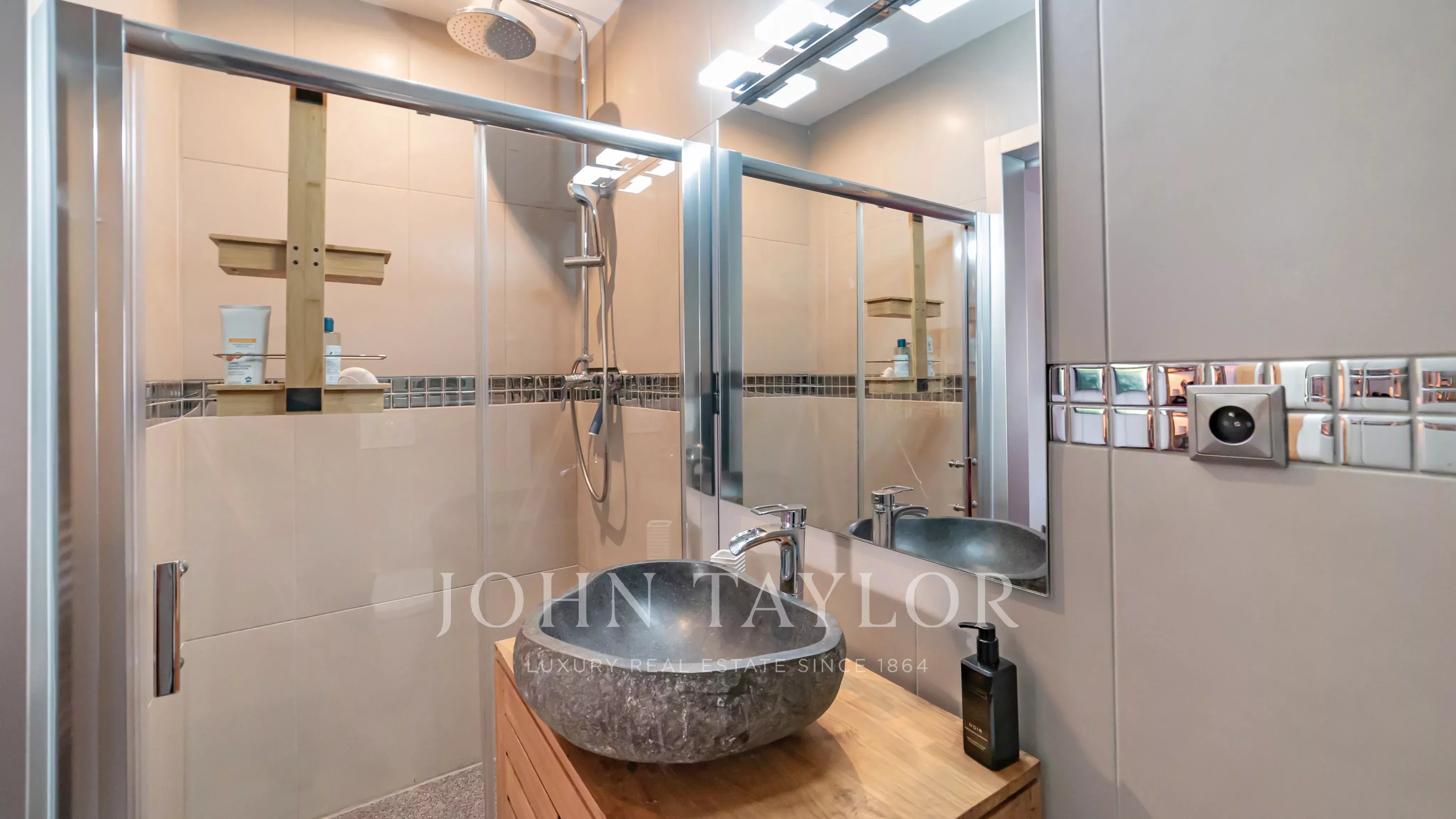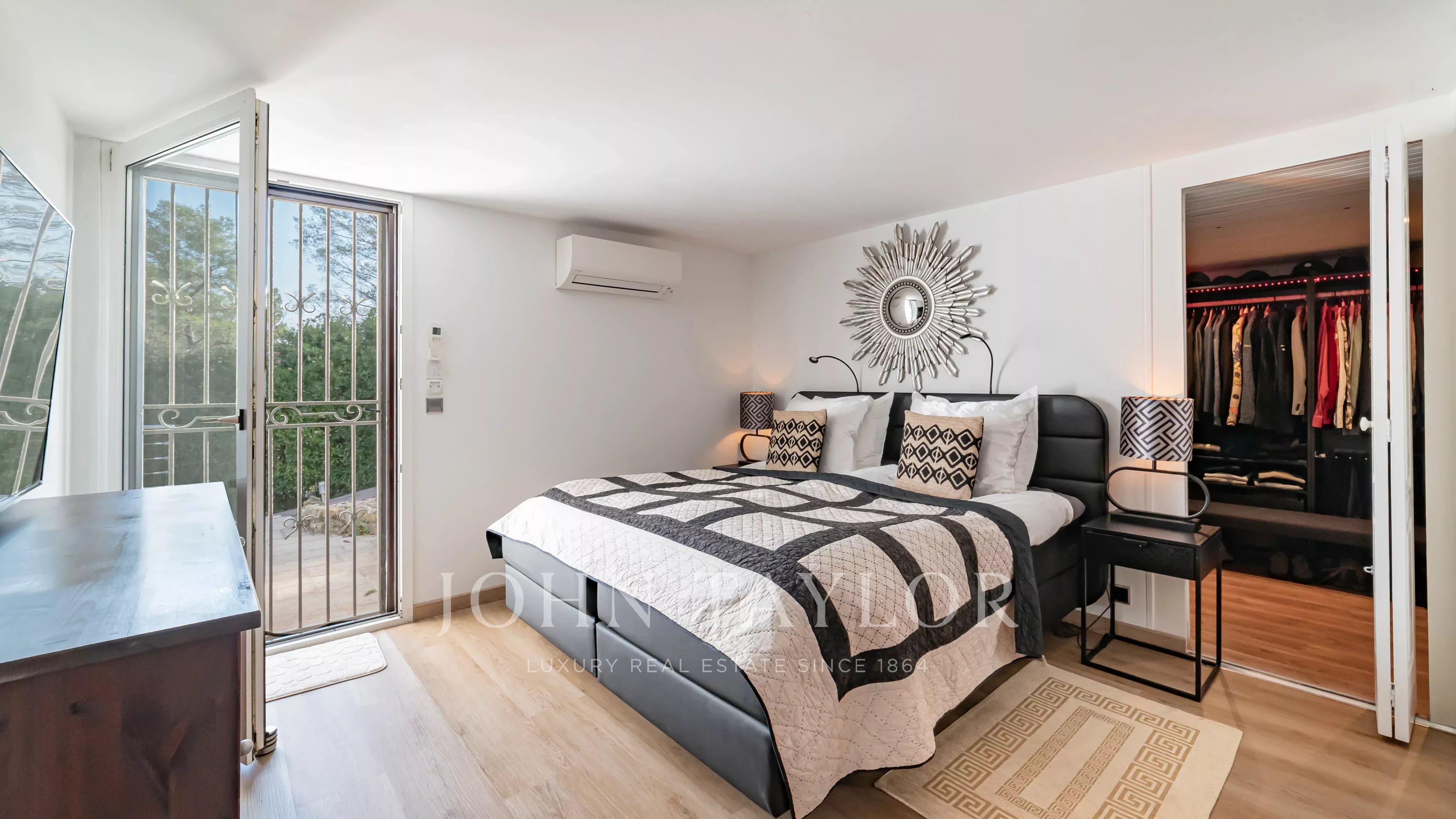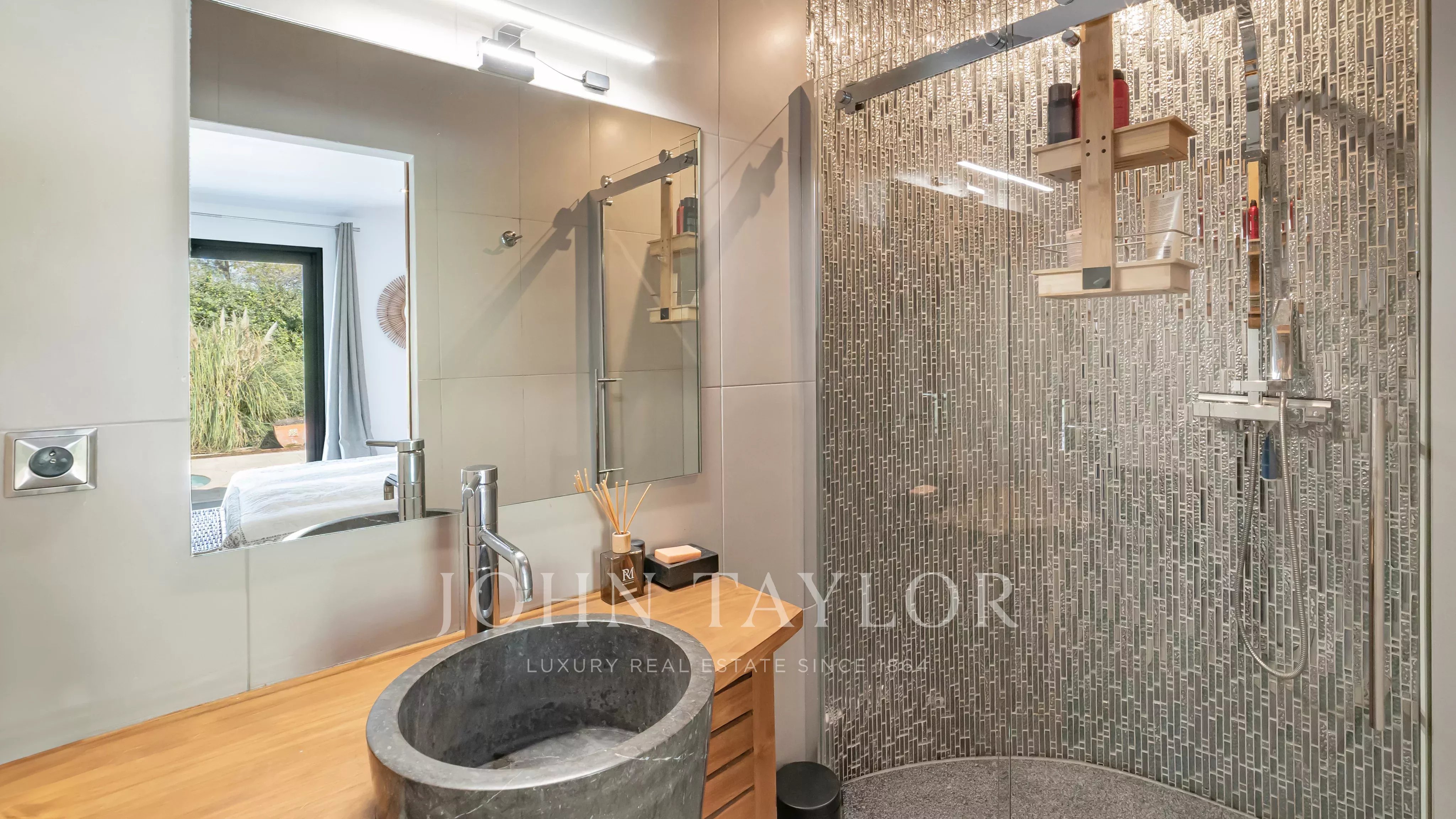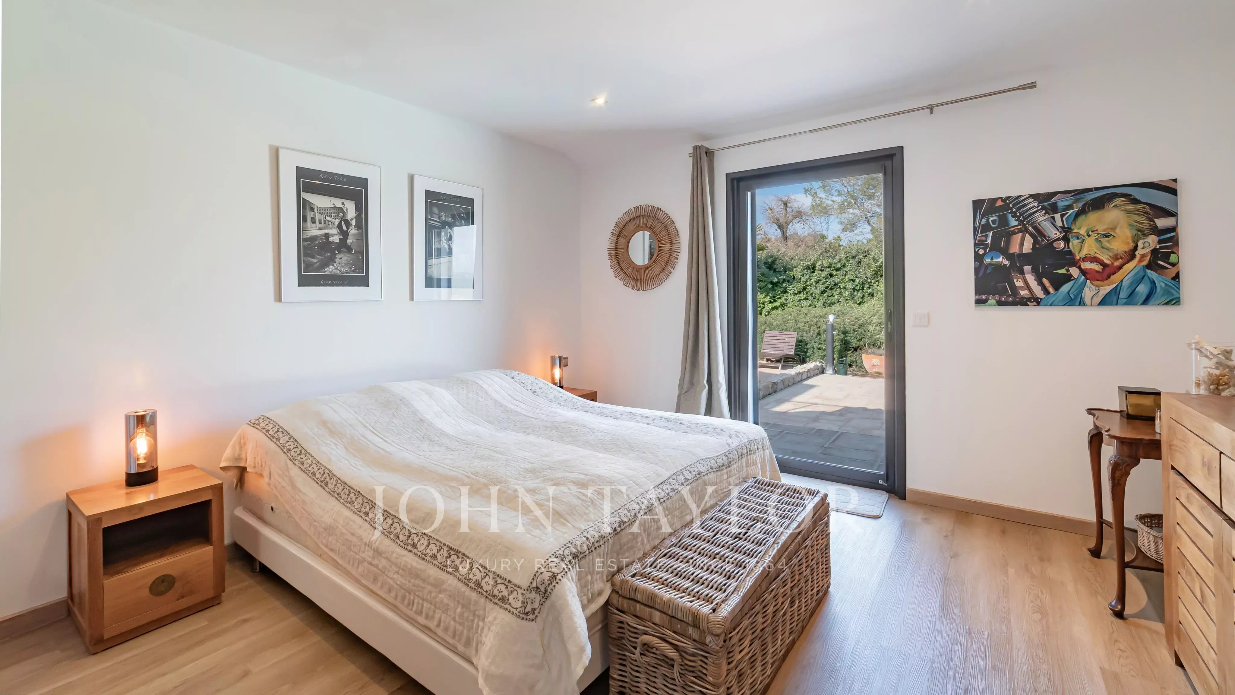 Al livello del giardino, la villa offre una suite padronale con bagno e spogliatoio, oltre a tre ulteriori camere da letto, ciascuna con il proprio bagno.
