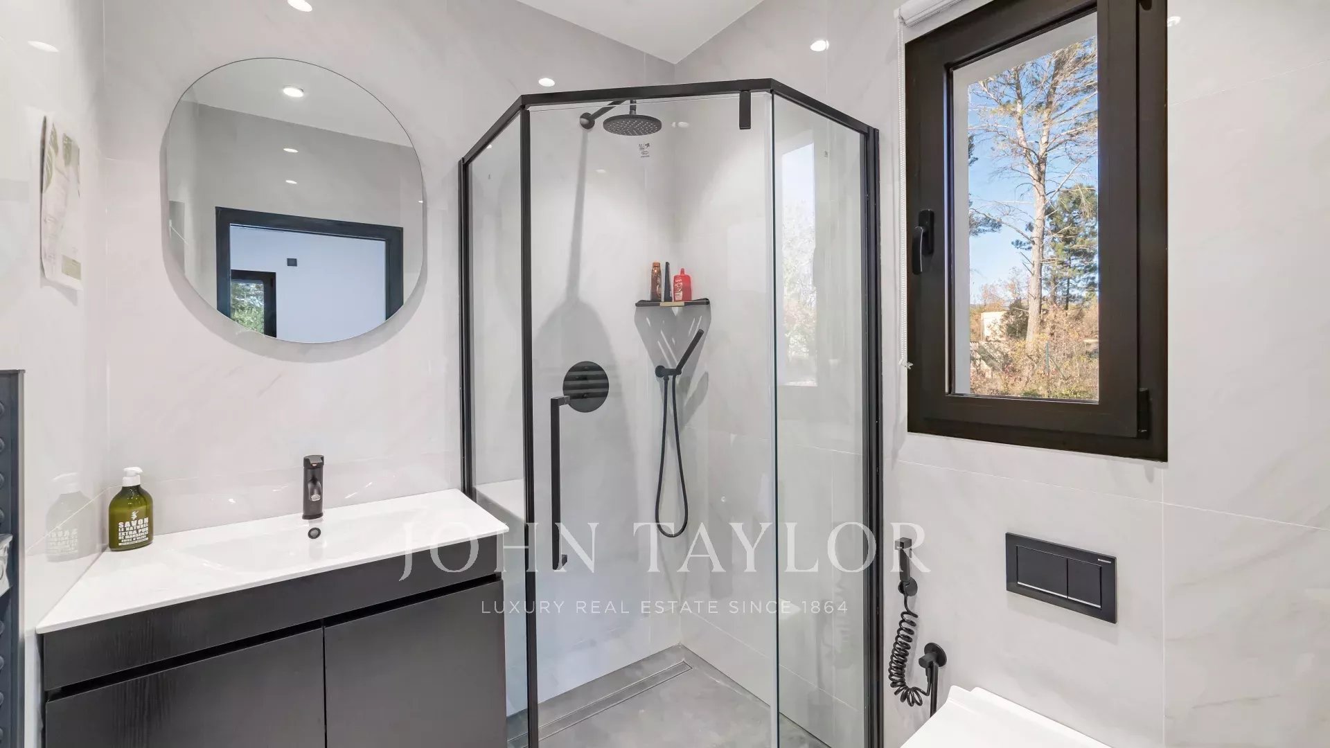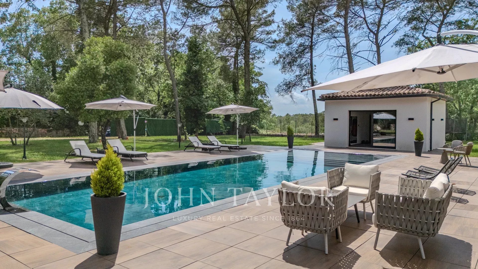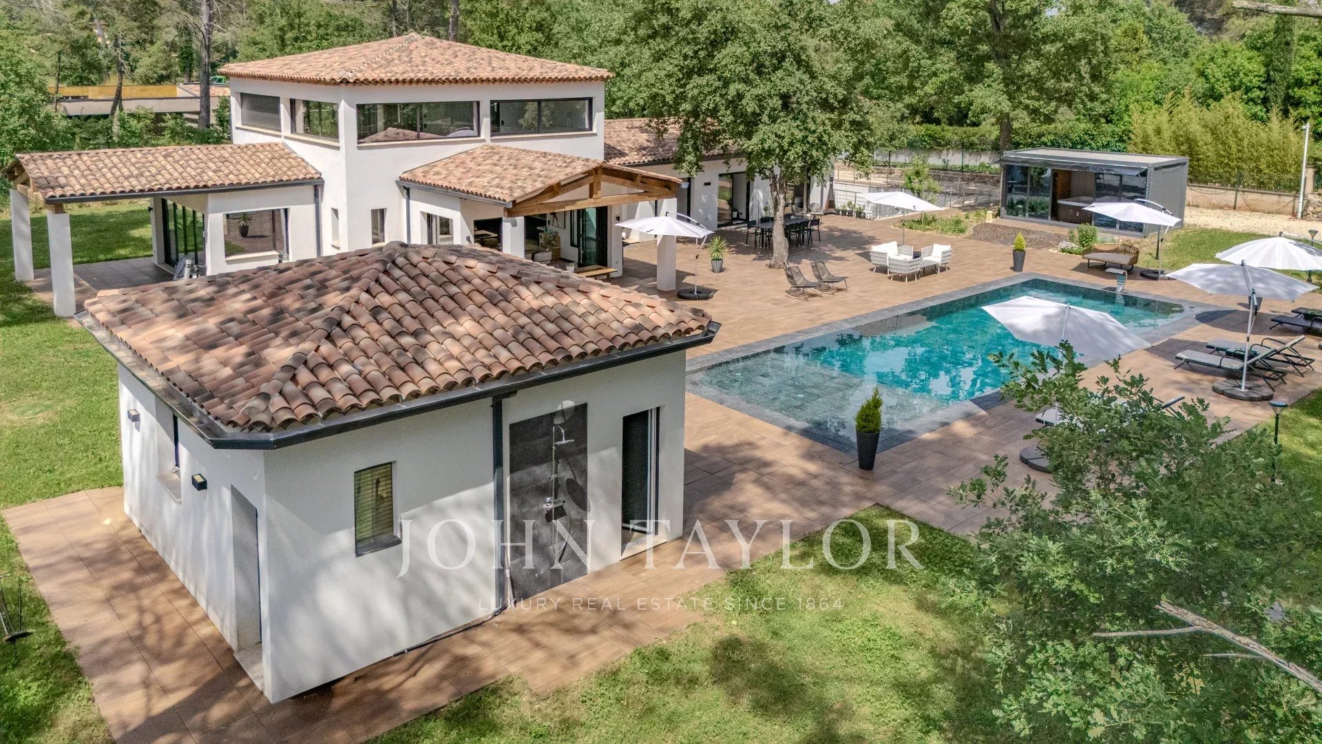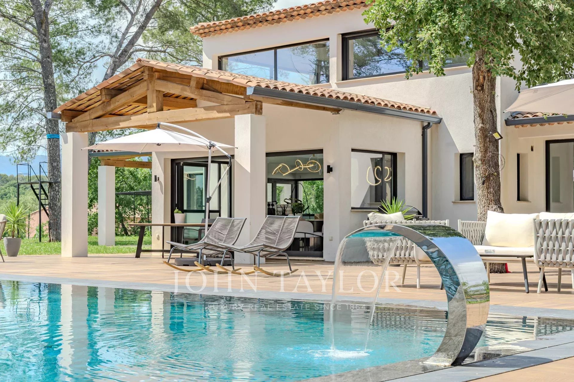 Questa villa dal design architettonico contemporaneo, costruita nel 2023, con una superficie totale di circa 543 m², si trova su 4.200 m² di terreno pianeggiante in un contesto residenziale ricercato e tranquillo, proprio accanto alla prestigiosa tenuta Terre Blanche.
