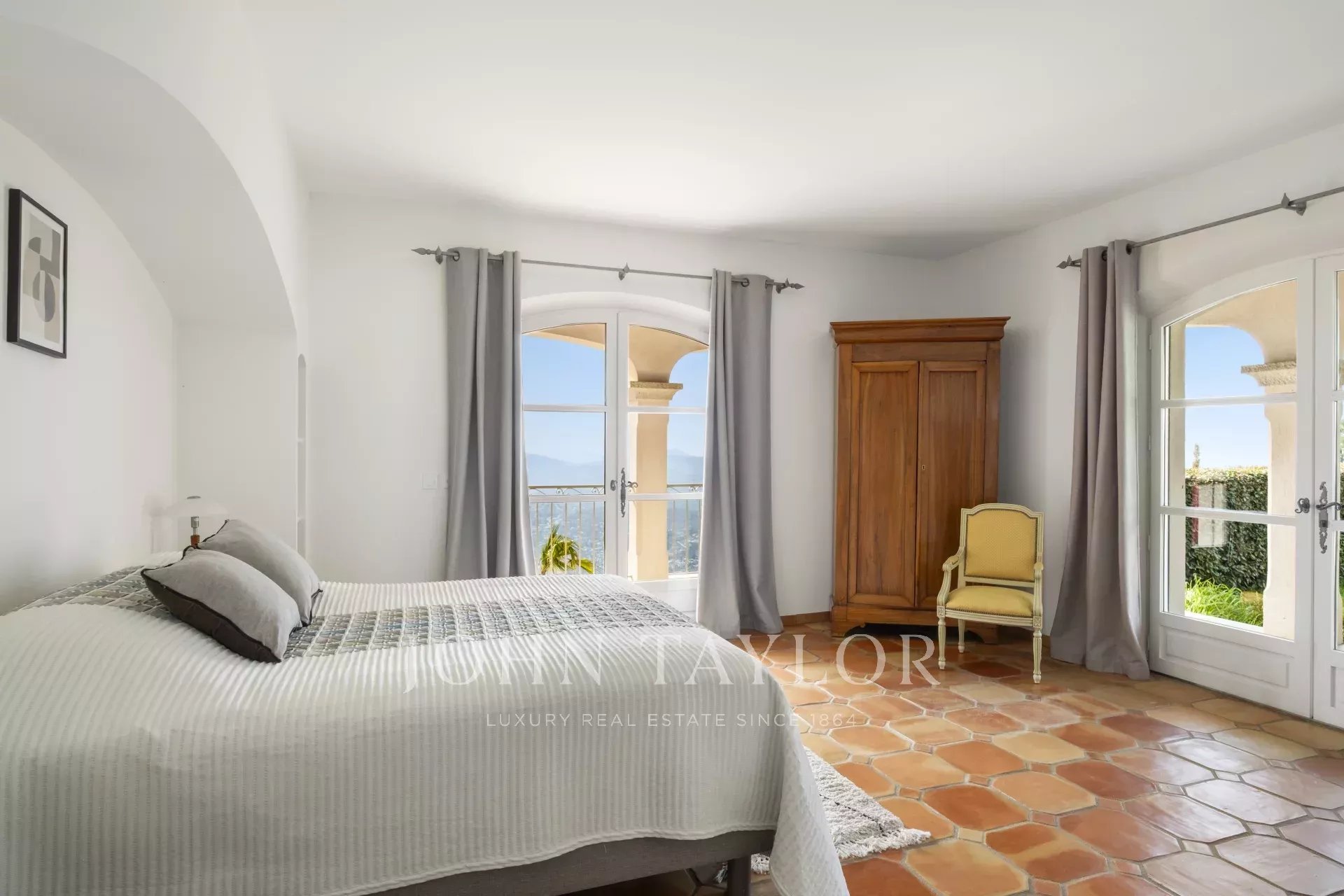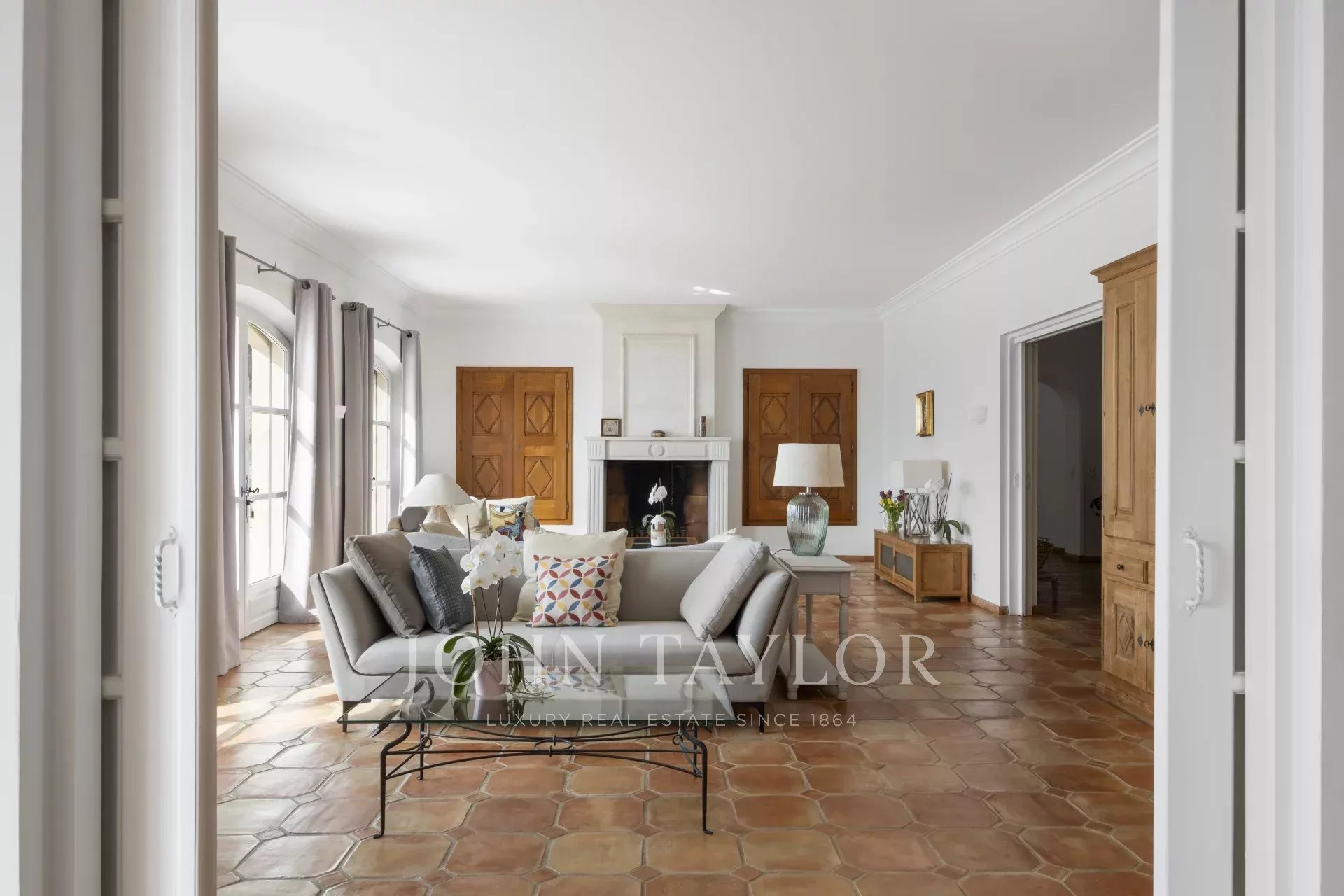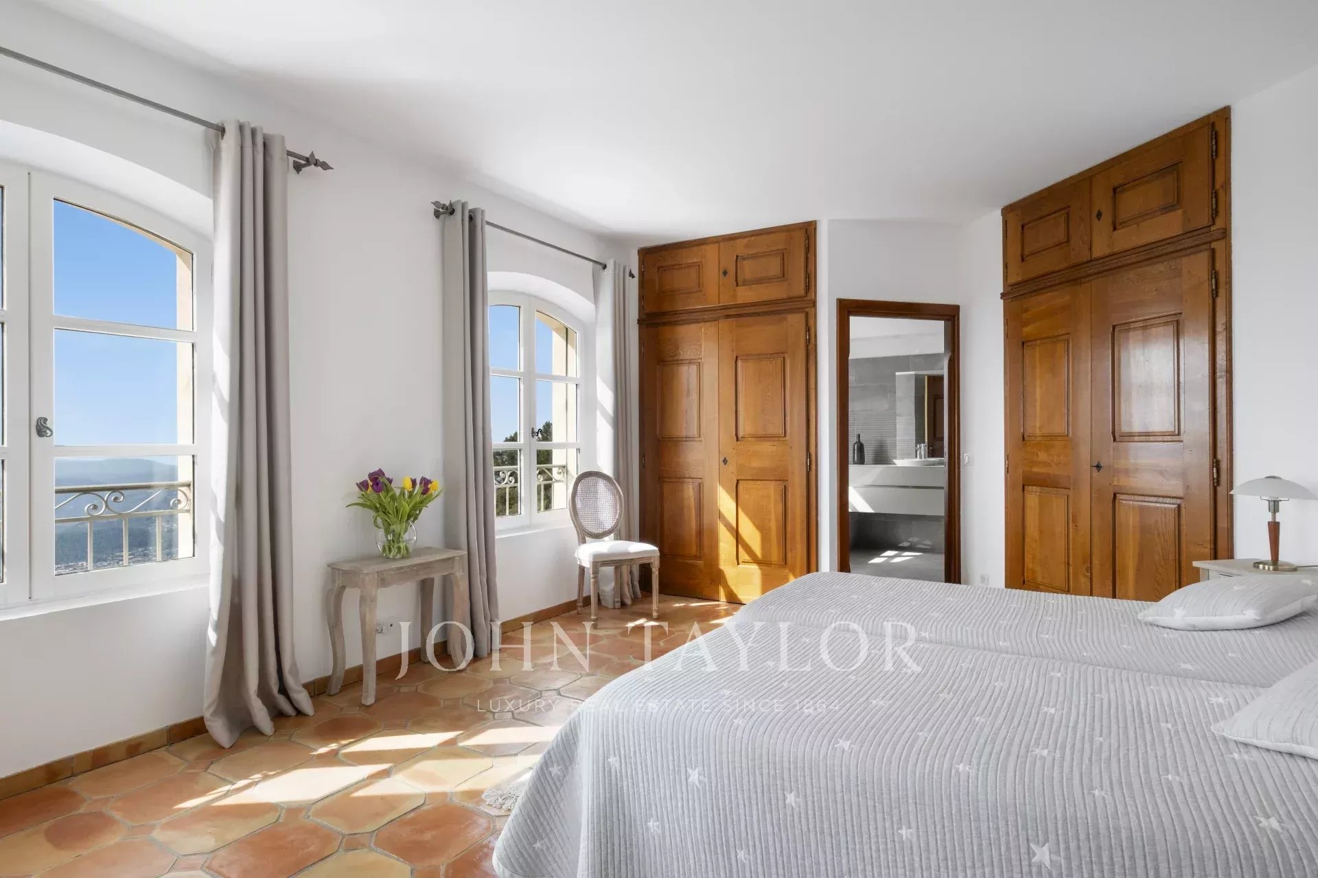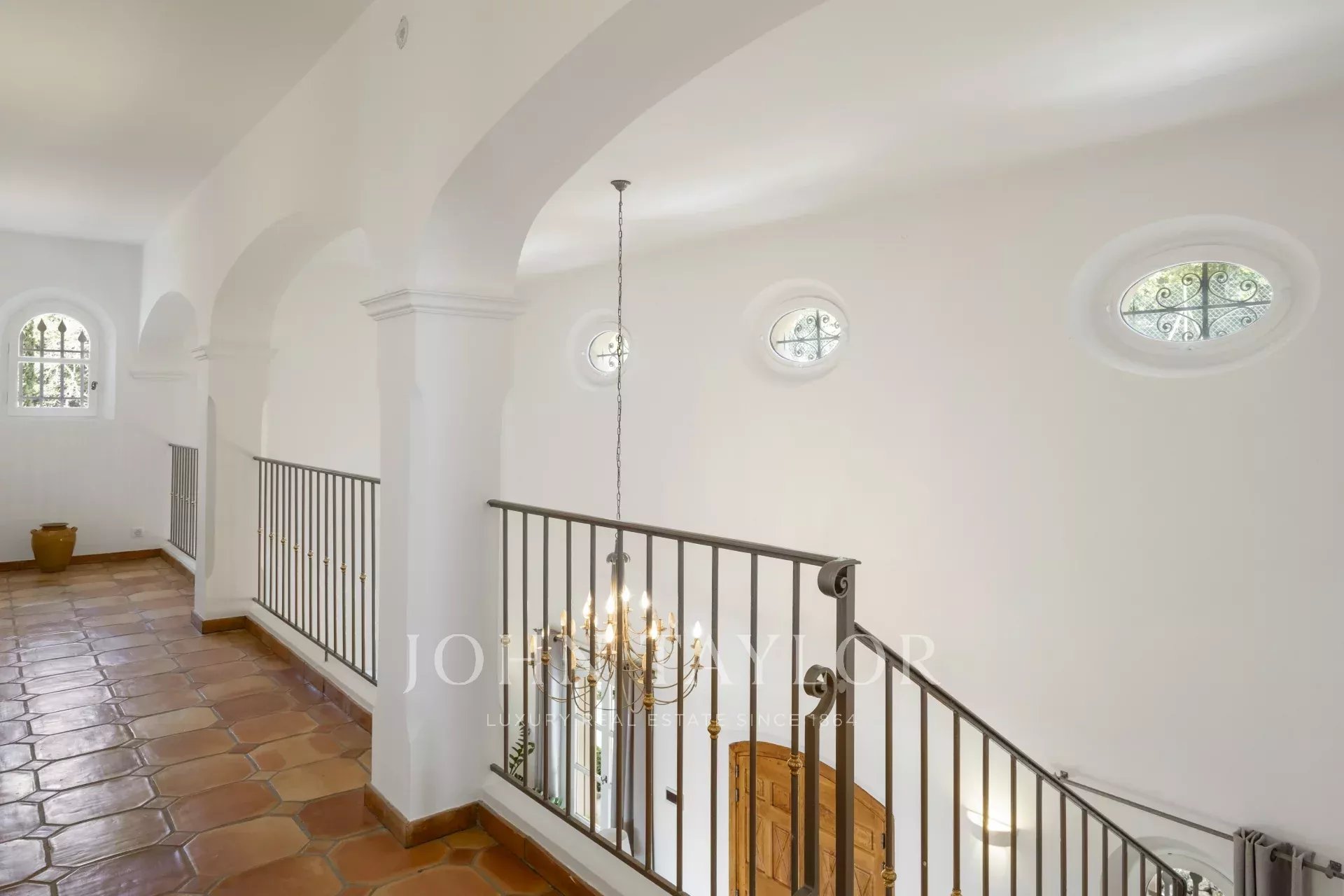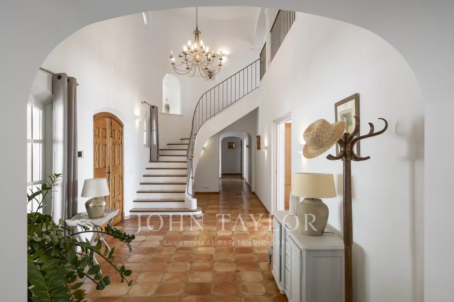 Un superbo ingresso con soffitto a doppia altezza conduce al vasto soggiorno/sala da pranzo, con un elegante camino e grandi finestre panoramiche che si aprono su un'immensa terrazza. L'affascinante cucina provenzale, con il suo grande camino, offre uno spazio conviviale per i pasti in famiglia. Sullo stesso livello si trovano anche uno studio, due camere da letto, tra cui una suite padronale con un bel bagno, uno spogliatoio e una terrazza privata, oltre a una lavanderia, un ripostiglio e un guardaroba.