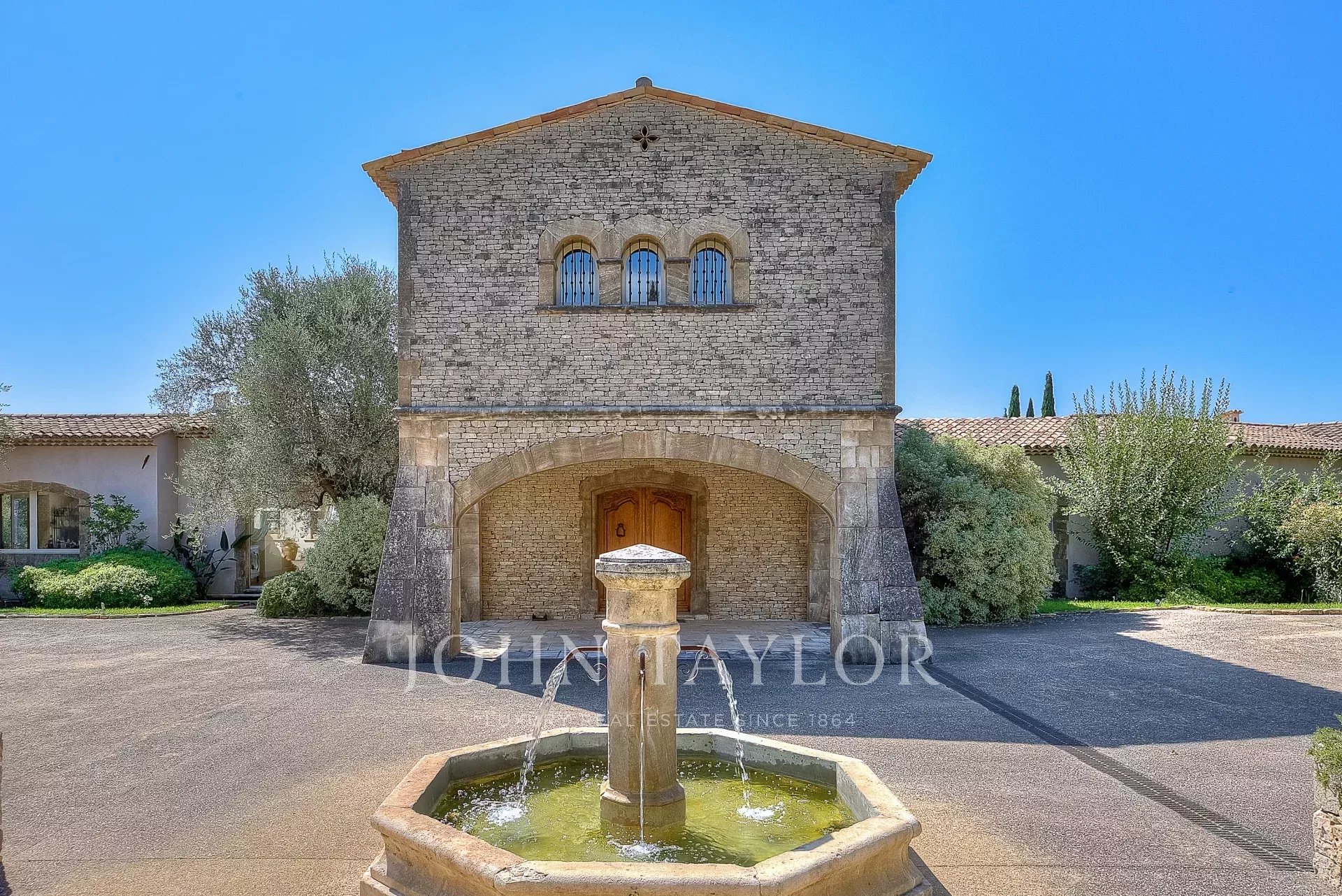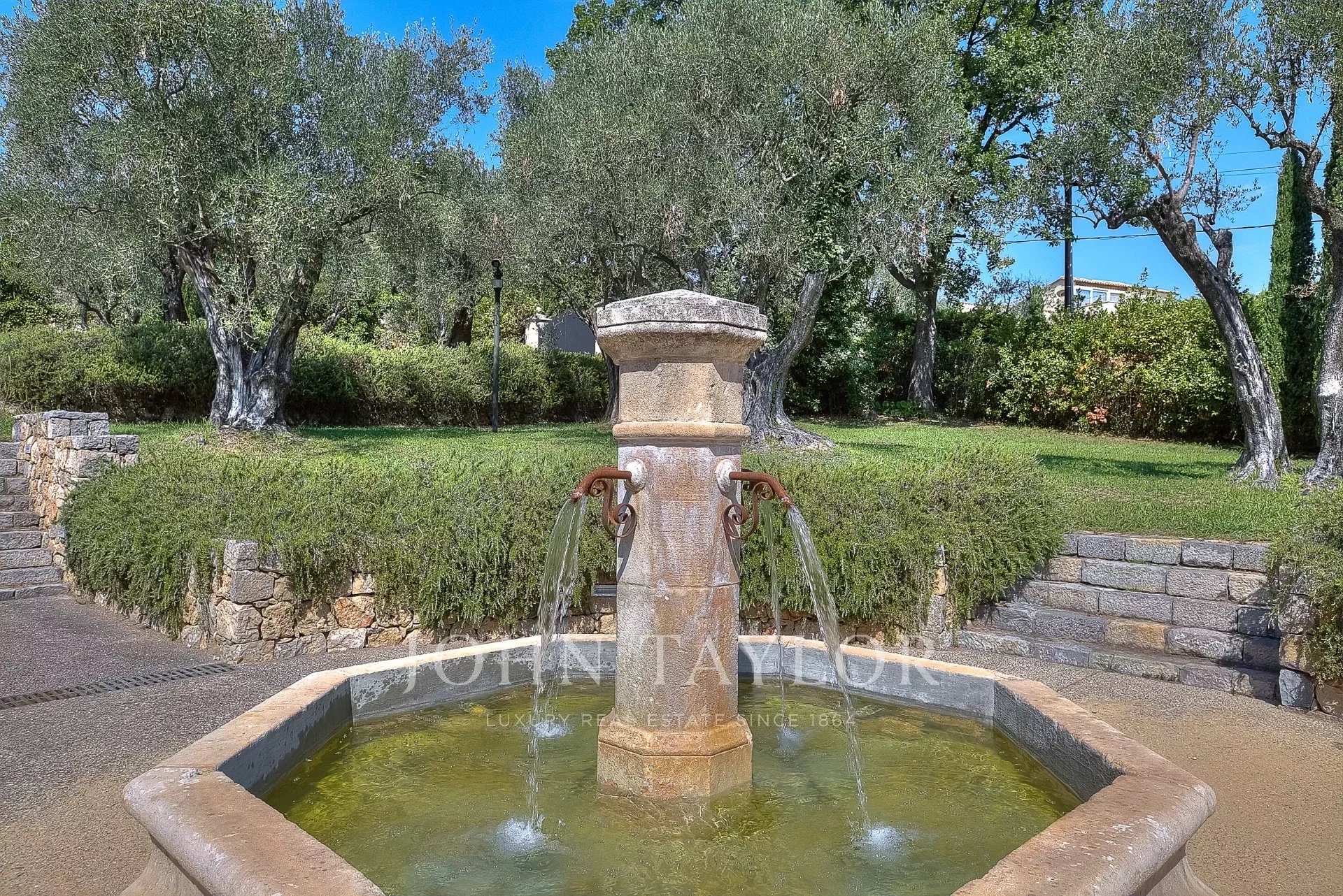 Il parco paesaggistico di 10.000 m², progettato da Jean Mus, è caratterizzato da dolci terrazze, muri in pietra e 160 ulivi.