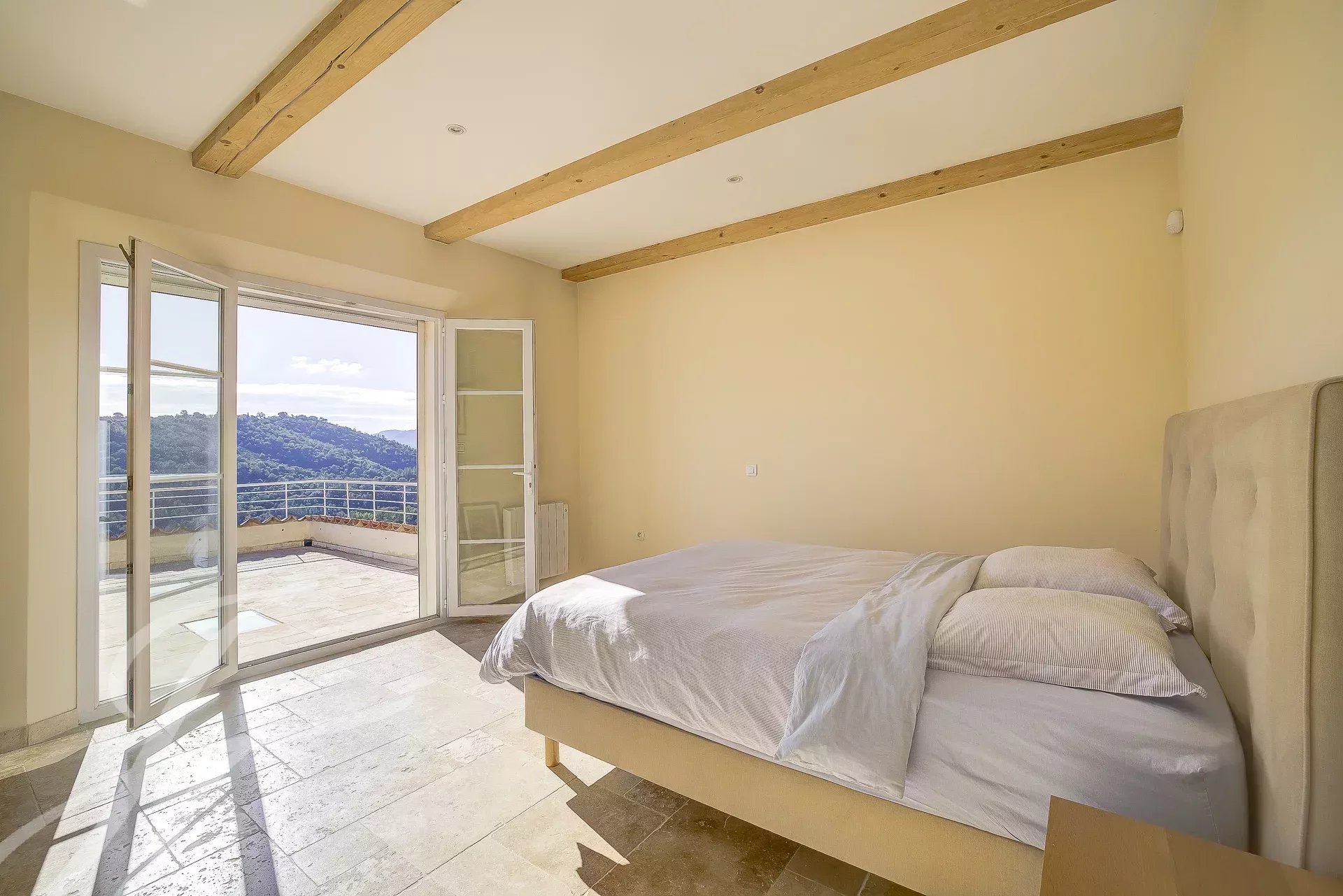 Il piano superiore è dedicato alla camera da letto principale, che dispone di un bagno interno e di un balcone privato con vista sulle colline.
