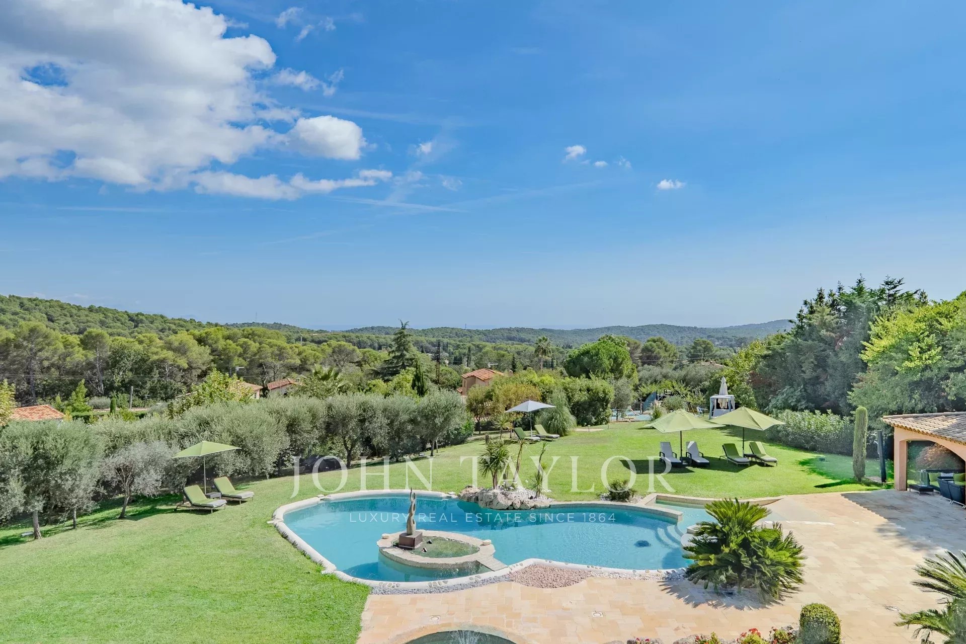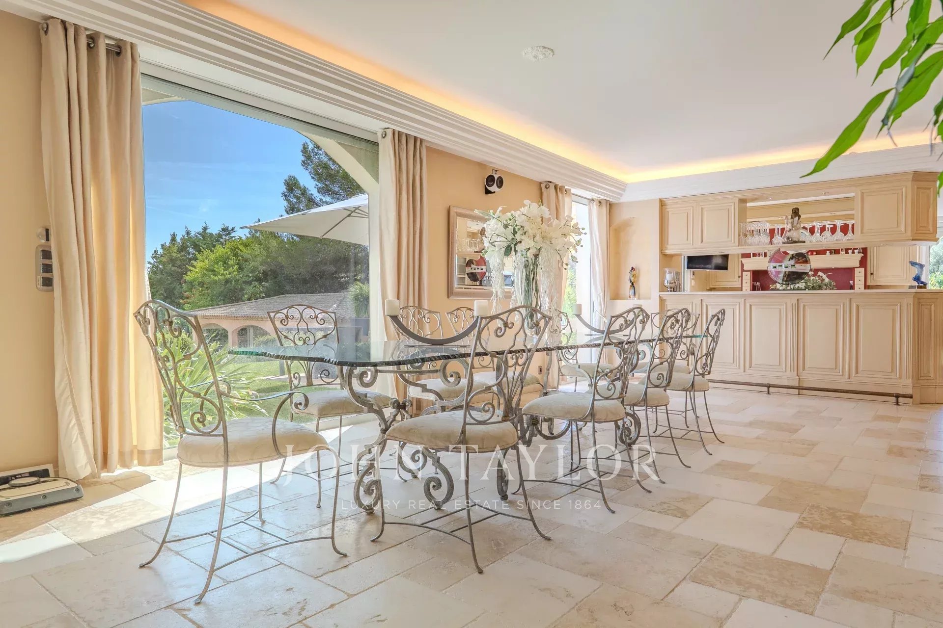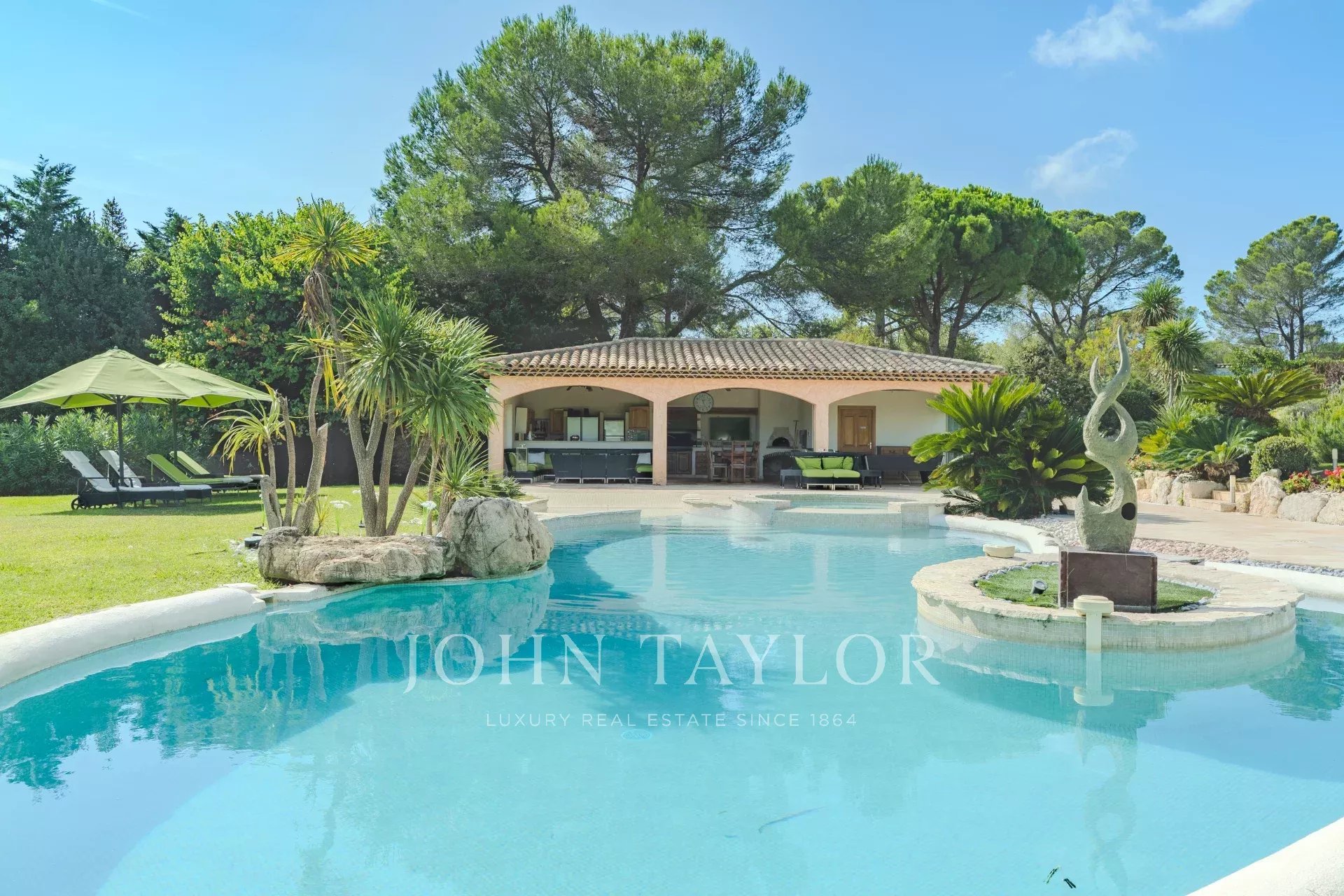 Situata a Mougins, in una delle zone più residenziali, a soli 5 minuti dal campo da golf di Mougins e a 15 minuti dalla famosa Croisette di Cannes, rimarrete affascinati da questa proprietà e dal suo magnifico giardino con una sontuosa piscina a forma libera con jacuzzi e una pool house completamente attrezzata con salotto e cucina estiva.