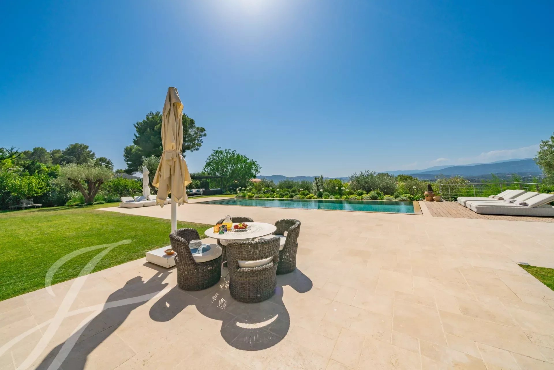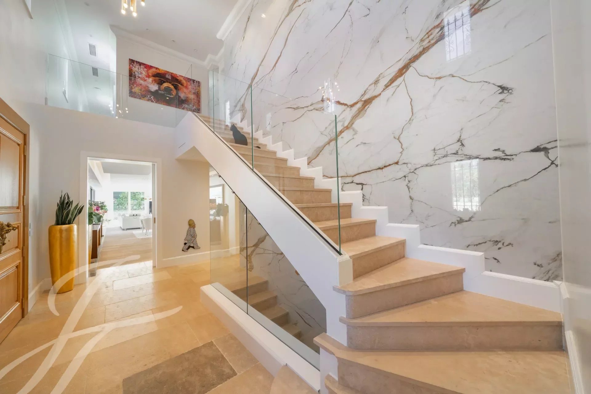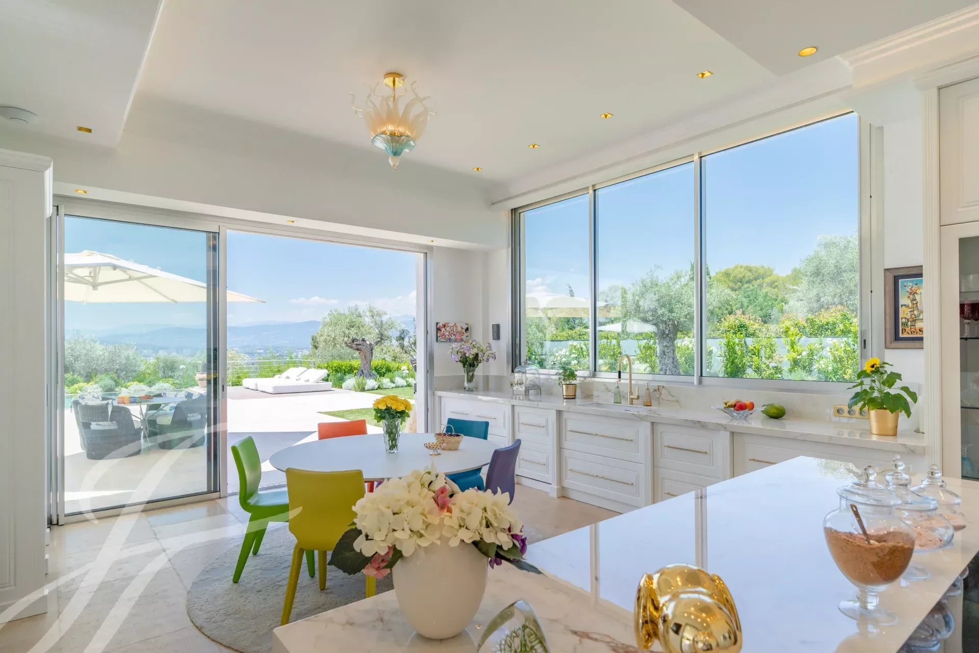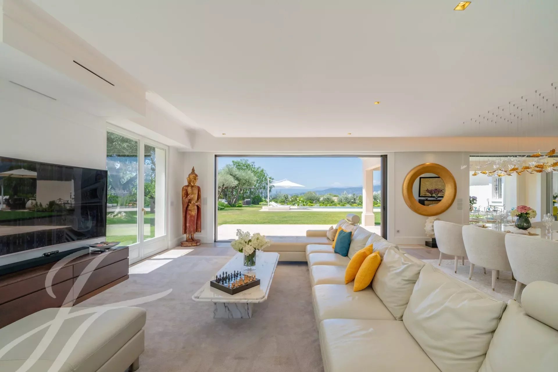 L'ingresso principale vanta porte doppie in rovere massiccio lavorate a mano che si aprono su un magnifico ingresso a doppia altezza, accentuato da una parete in marmo Calacatta alta 6 metri. L'ampio soggiorno e la sala da pranzo a pianta aperta di 108 m2 offrono una magnifica vista panoramica a 270 gradi, in direzione ovest, sulle colline e sulle montagne delle Alpi Marittime.