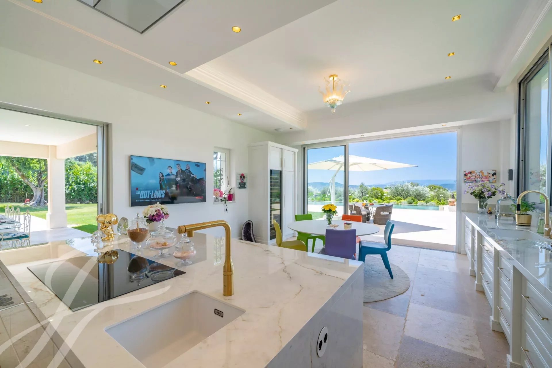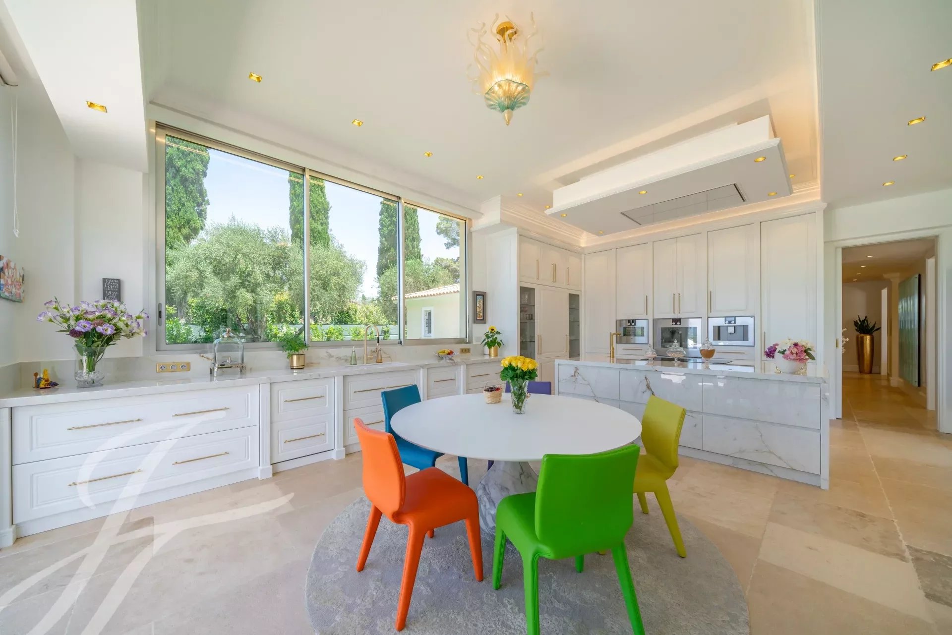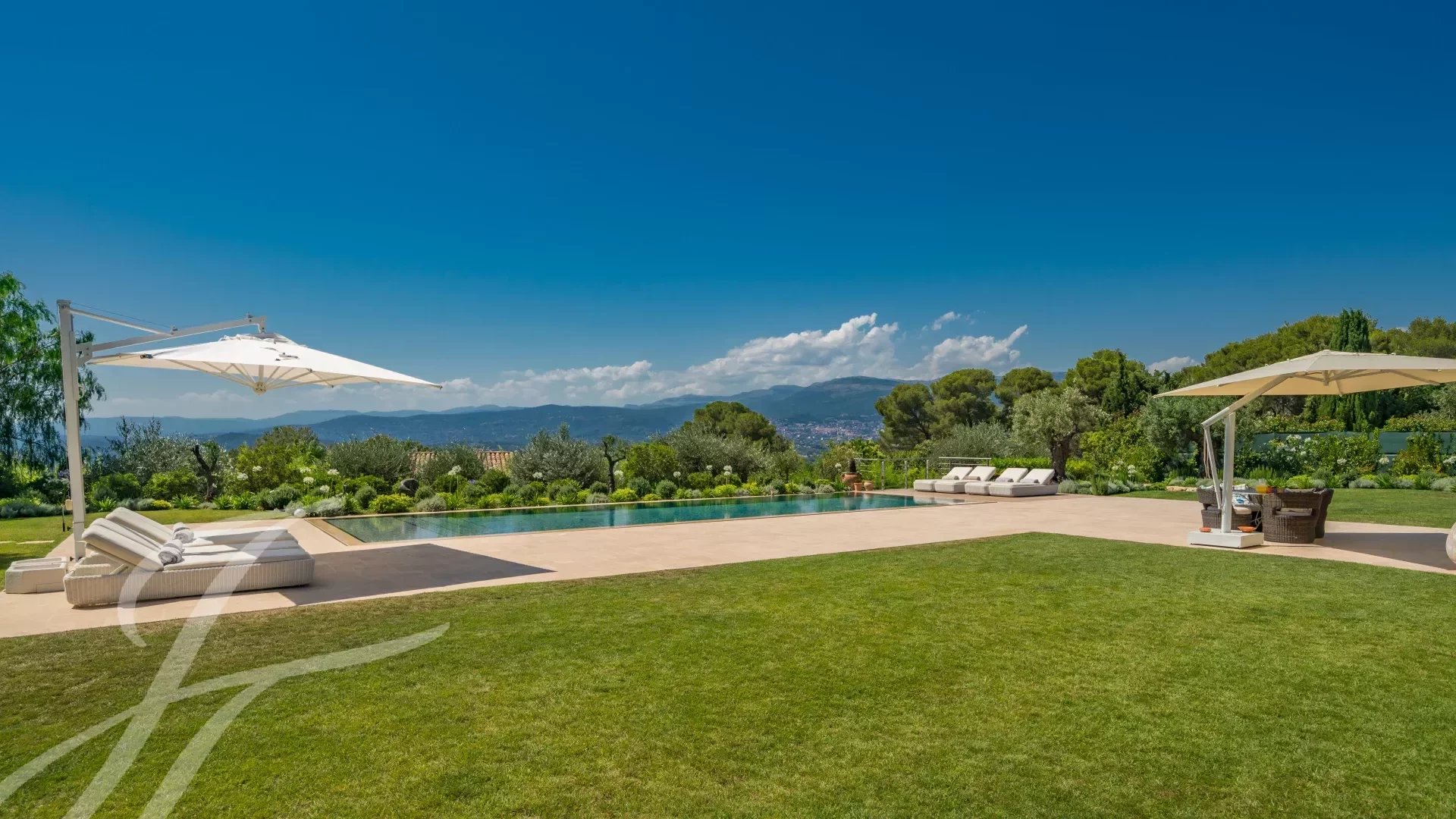 L'ingresso principale vanta porte doppie in rovere massiccio lavorate a mano che si aprono su un magnifico ingresso a doppia altezza, accentuato da una parete in marmo Calacatta alta 6 metri. L'ampio soggiorno e la sala da pranzo a pianta aperta di 108 m2 offrono una magnifica vista panoramica a 270 gradi, in direzione ovest, sulle colline e sulle montagne delle Alpi Marittime.