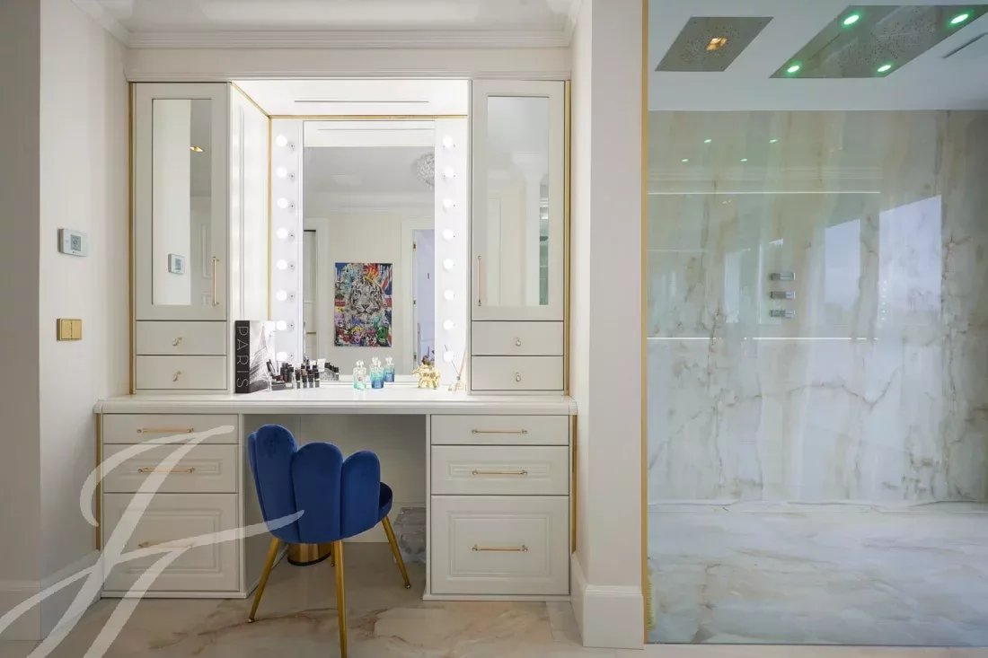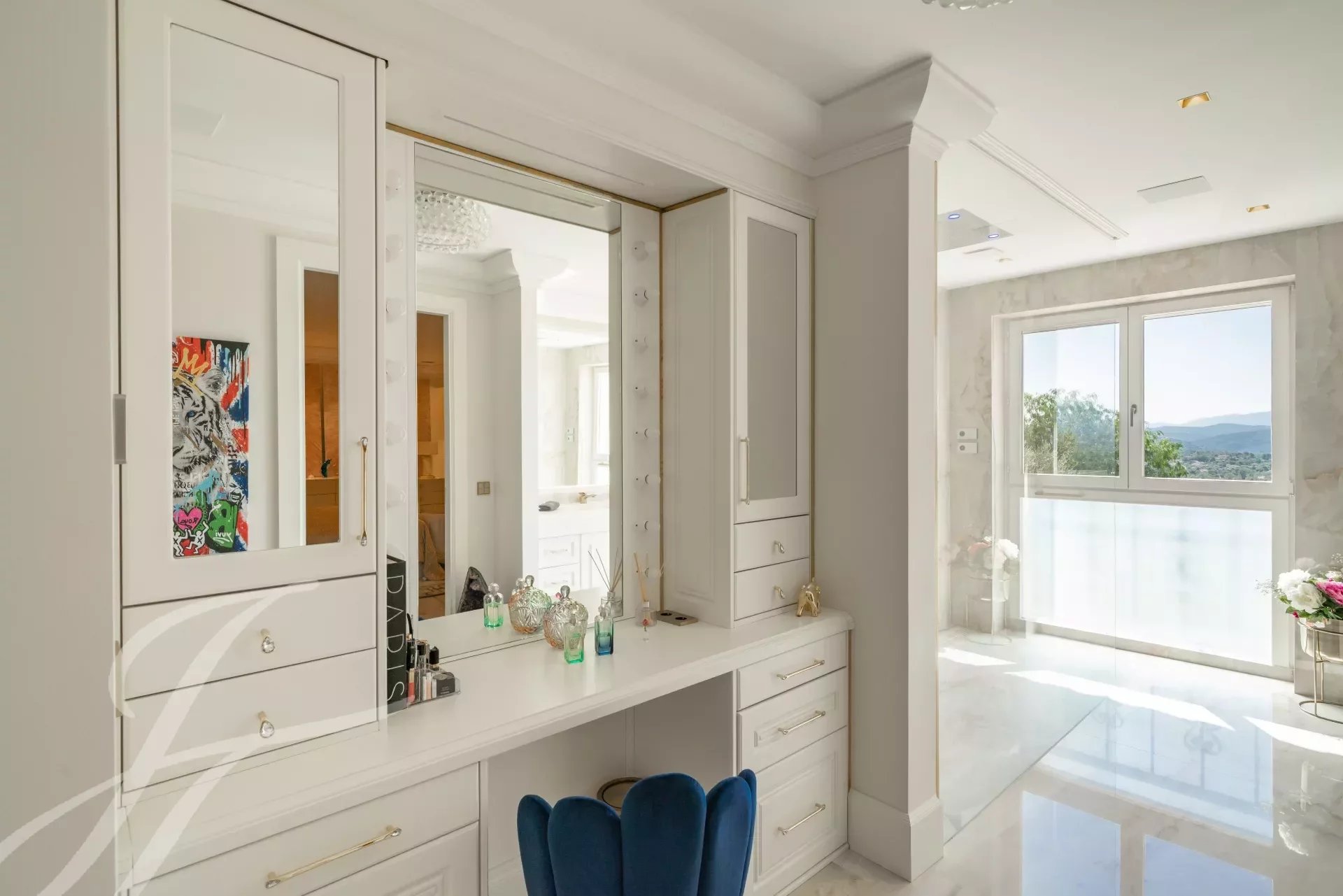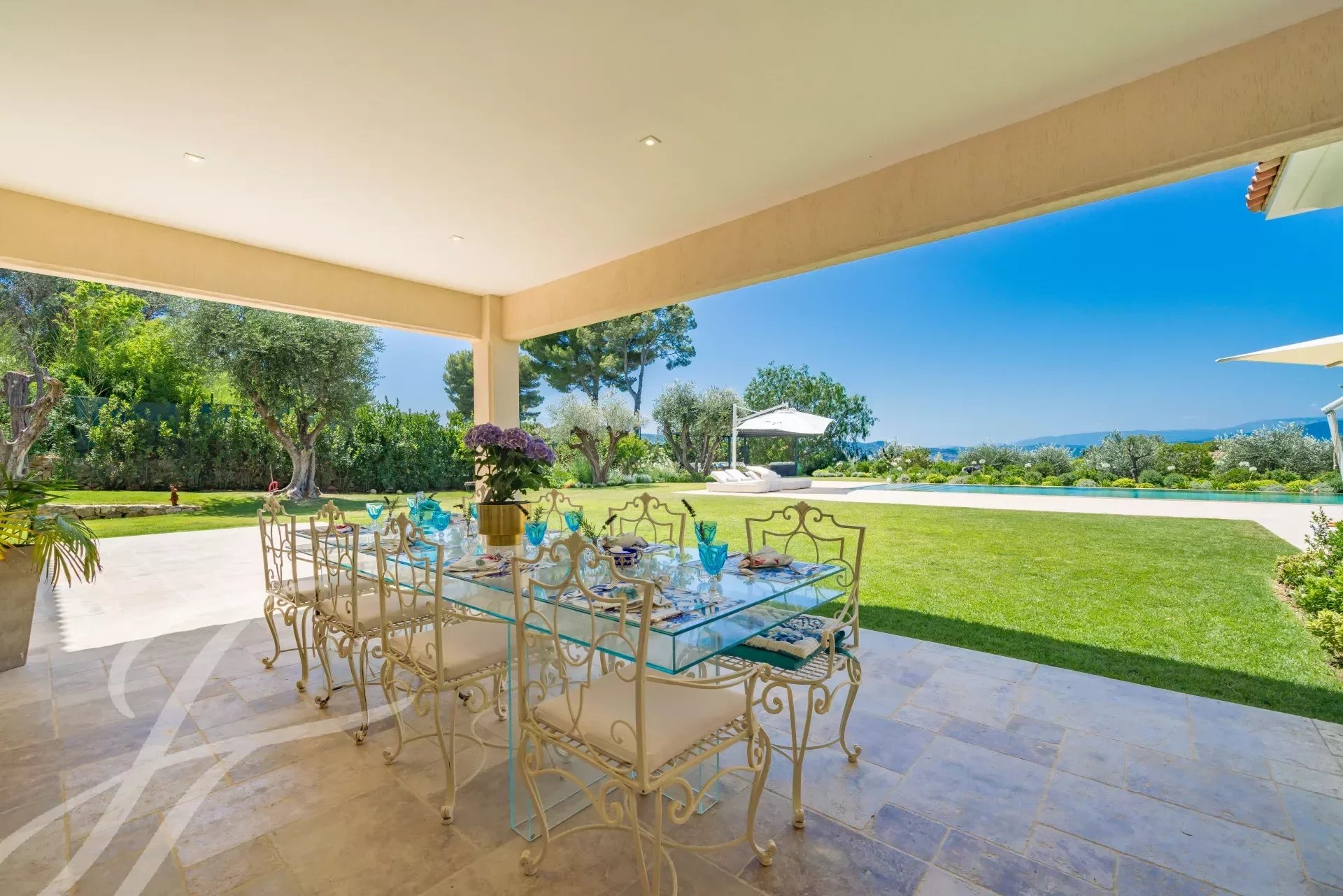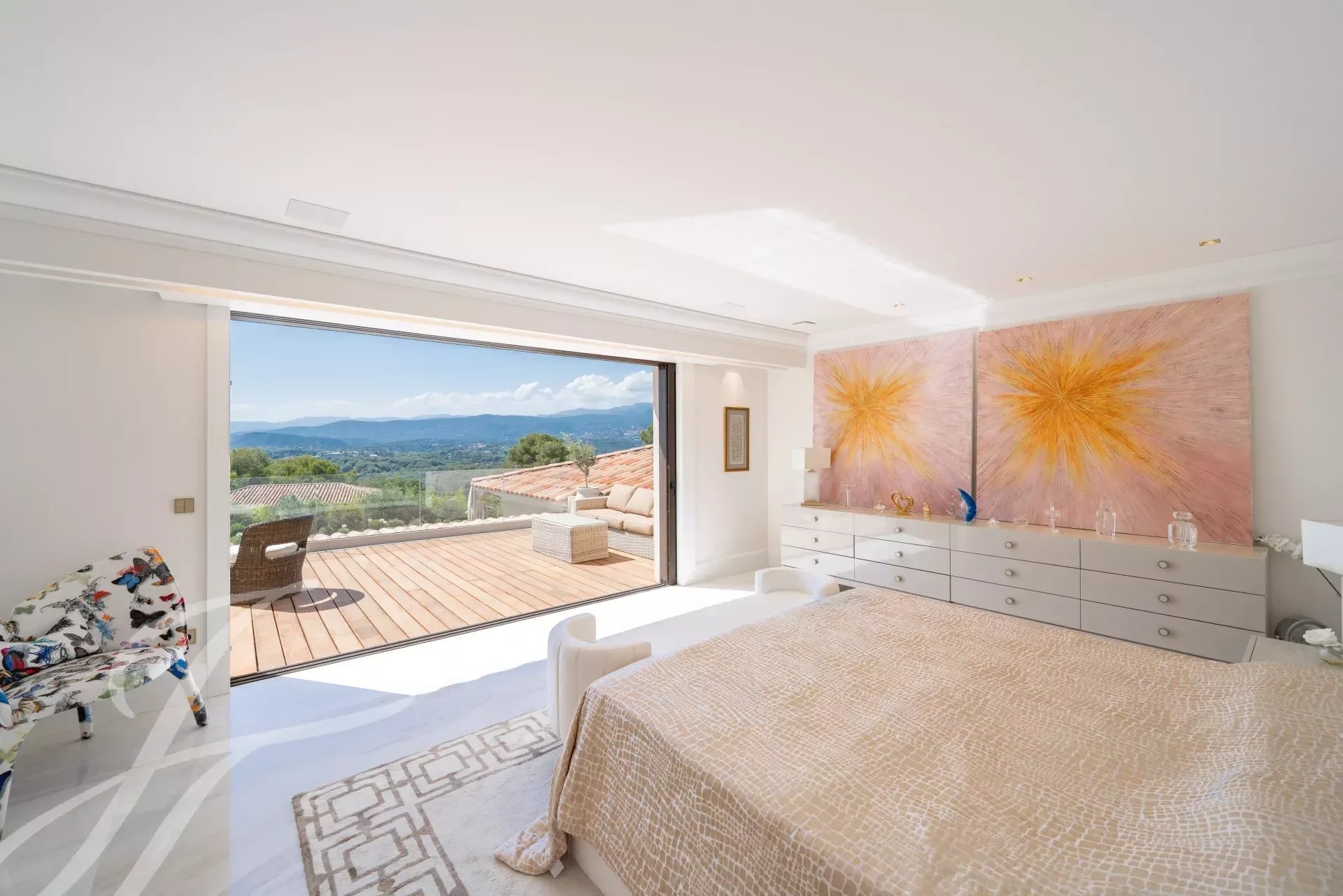 L'ingresso principale vanta porte doppie in rovere massiccio lavorate a mano che si aprono su un magnifico ingresso a doppia altezza, accentuato da una parete in marmo Calacatta alta 6 metri. L'ampio soggiorno e la sala da pranzo a pianta aperta di 108 m2 offrono una magnifica vista panoramica a 270 gradi, in direzione ovest, sulle colline e sulle montagne delle Alpi Marittime.