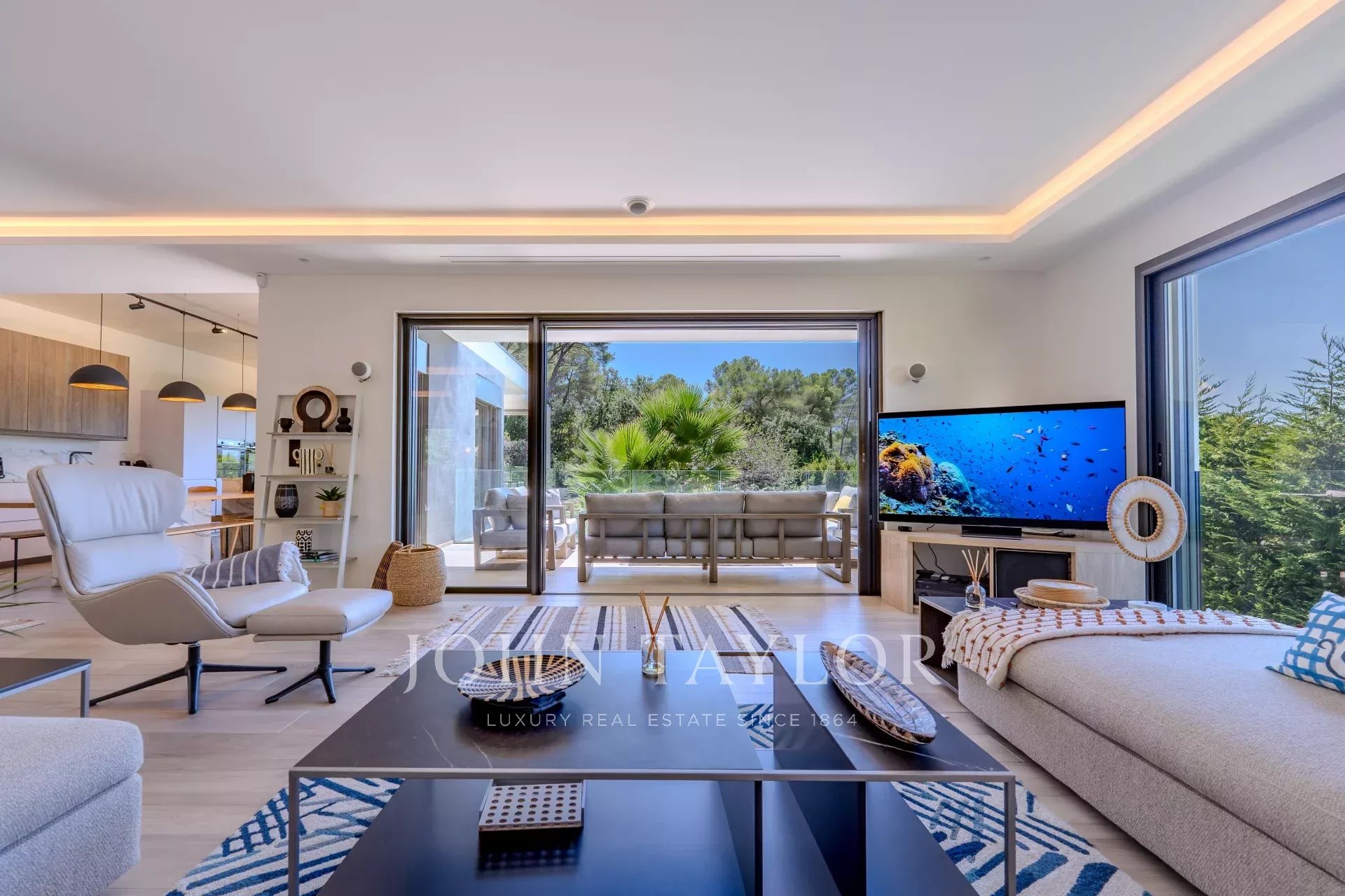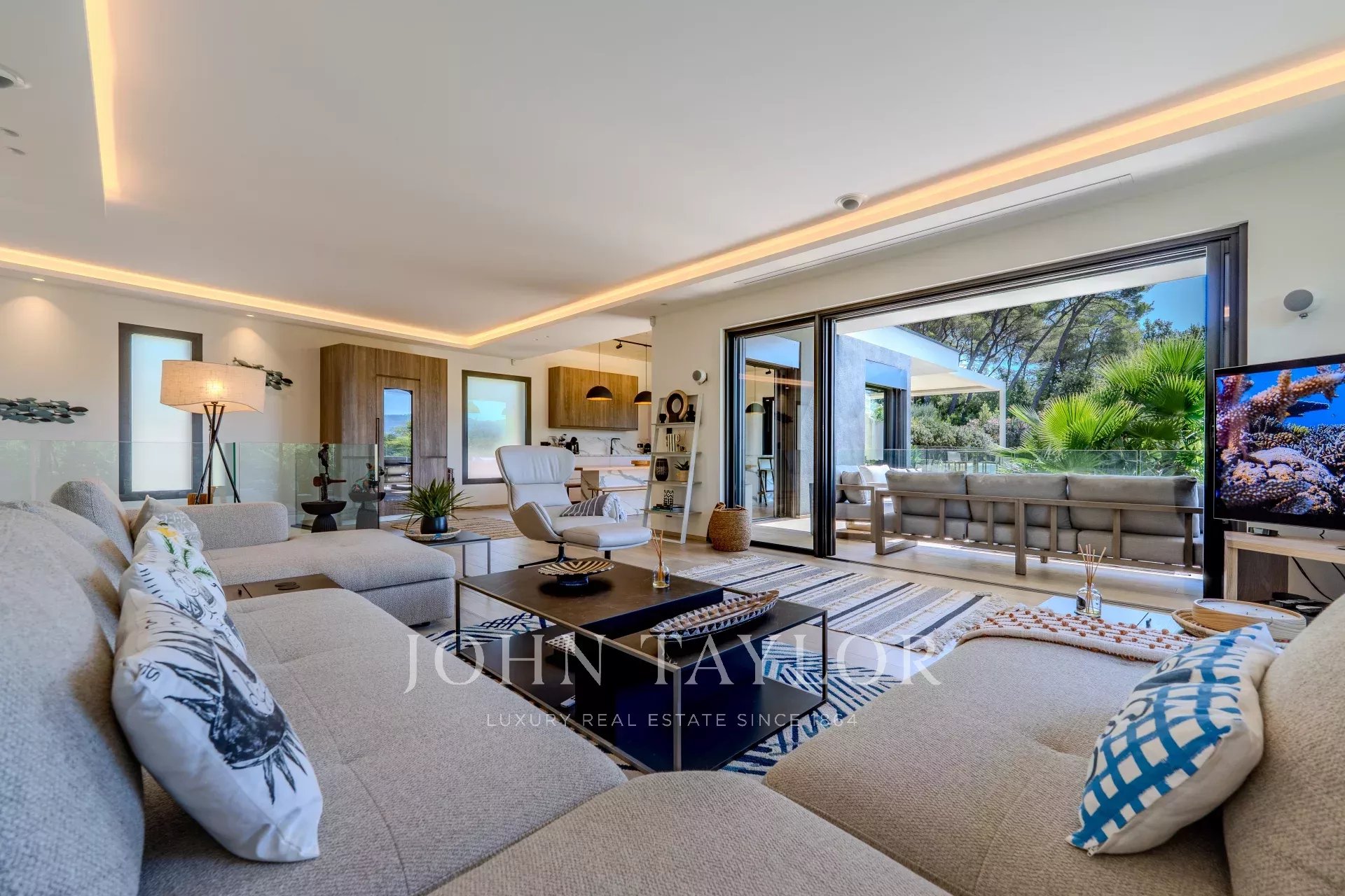 All'interno, la villa offre un superbo e luminoso soggiorno, aperto verso l'esterno grazie a grandi finestre a golfo che estendono naturalmente lo spazio sulla terrazza e sulla piscina.