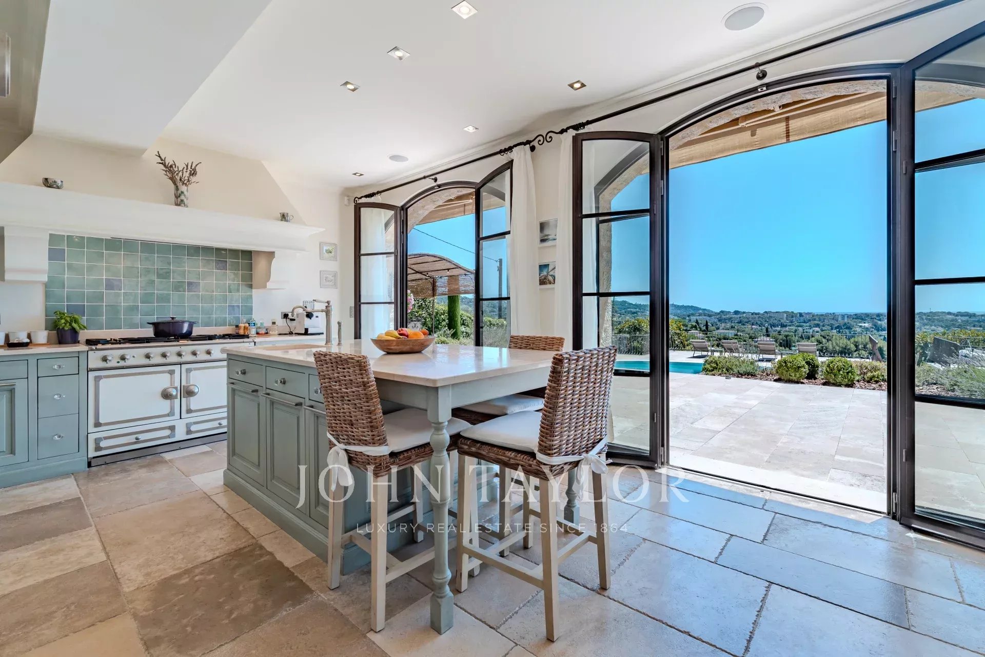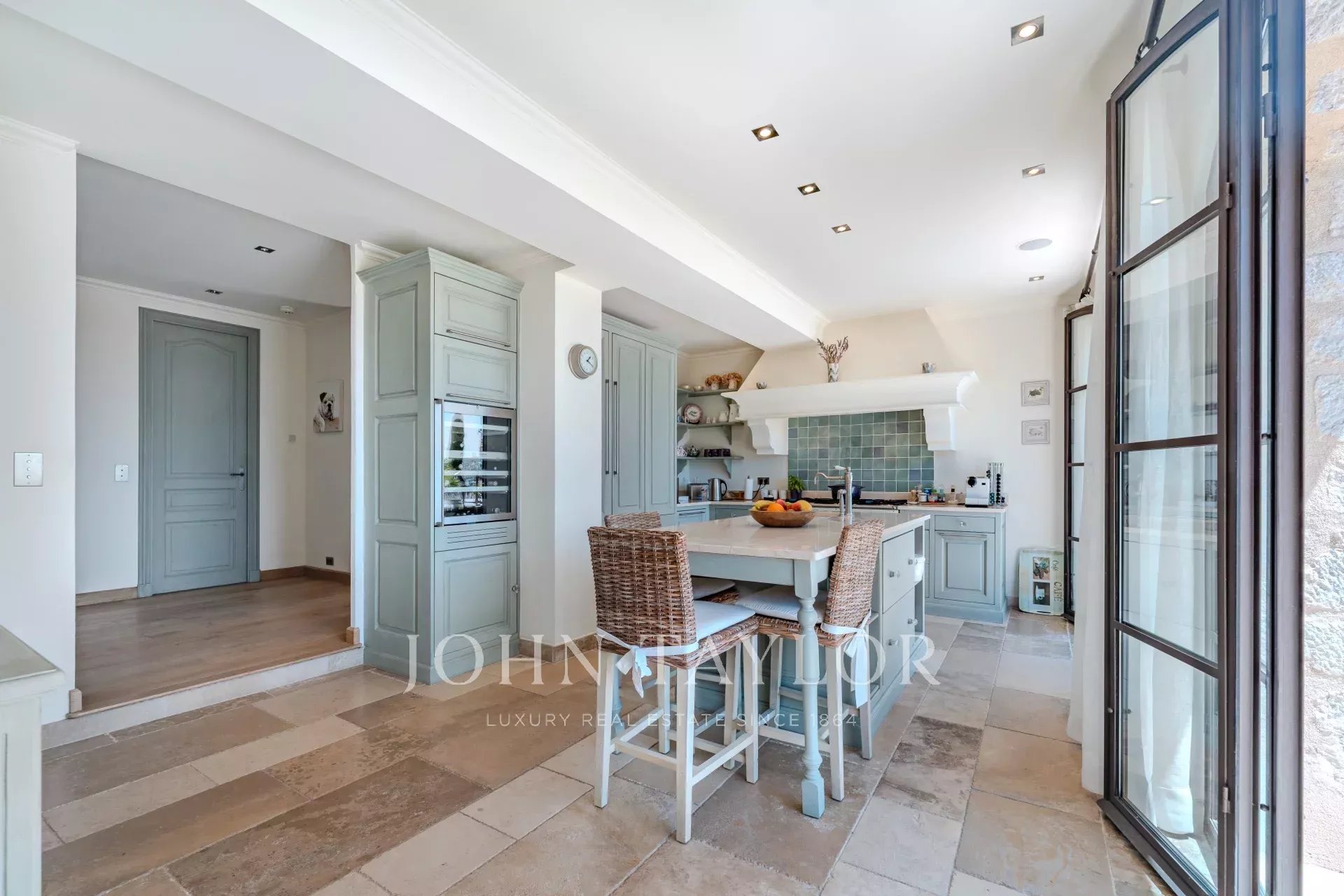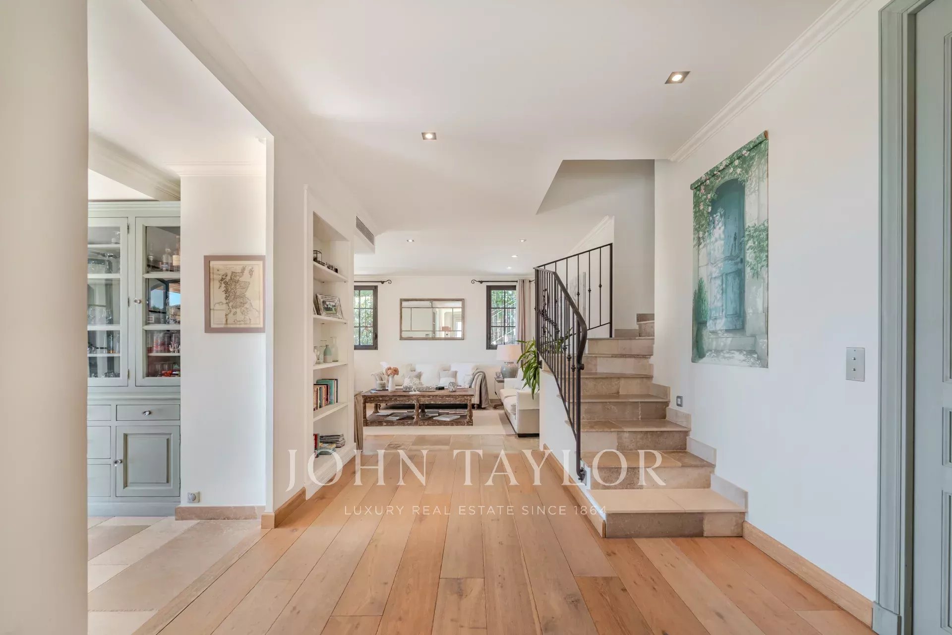 Fin dall'ingresso, il tono è chiaro: volumi generosi, luce naturale e finiture di alta gamma. Il soggiorno con zona pranzo forma uno spazio di vita conviviale, ampliato da una cucina straordinariamente ben attrezzata con un prestigioso piano La Cornue ed elettrodomestici Gaggenau. Una lavanderia e una cantina completano questo livello con discrezione e praticità.