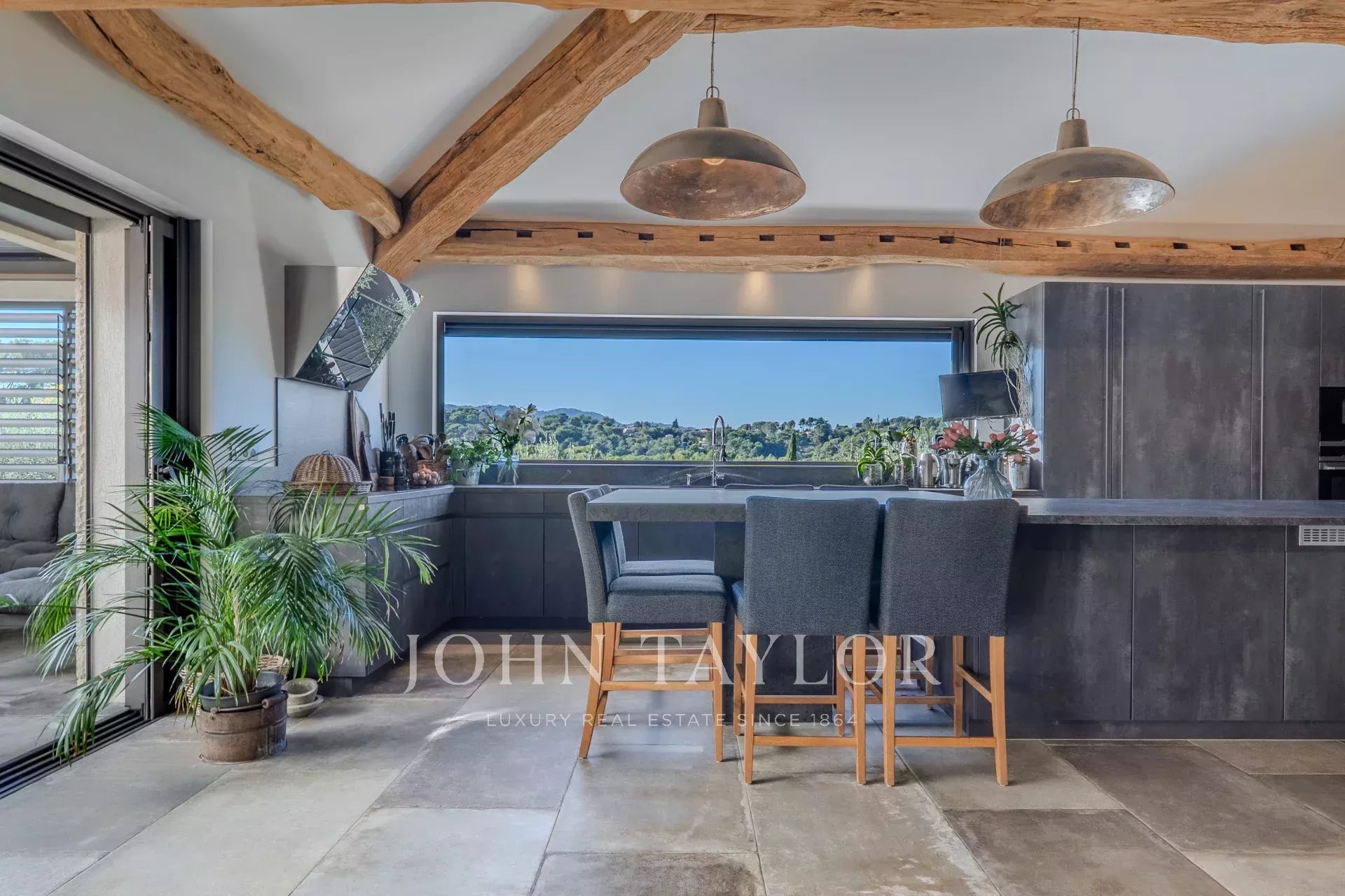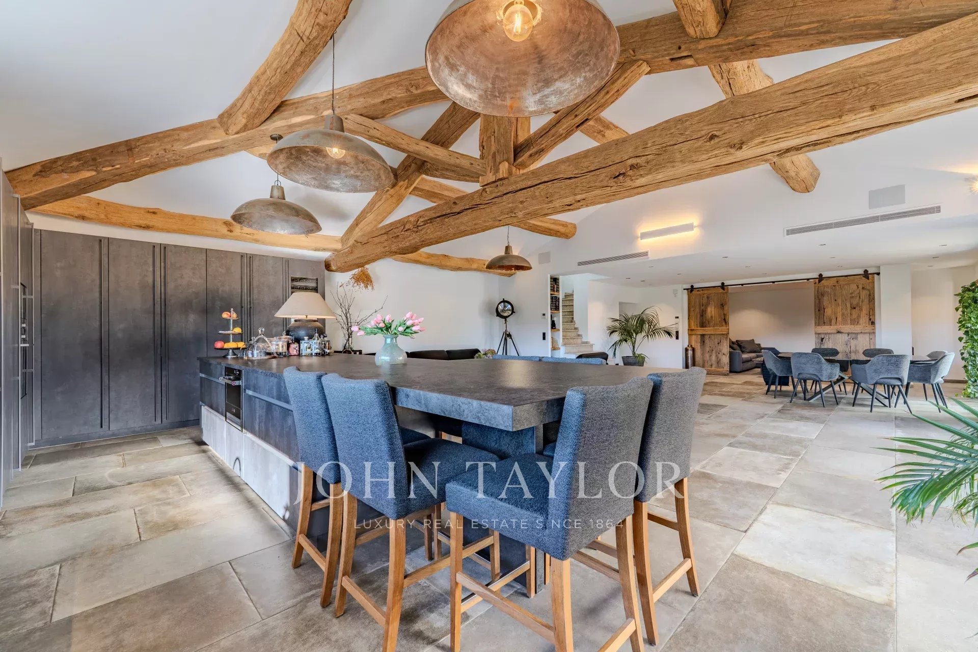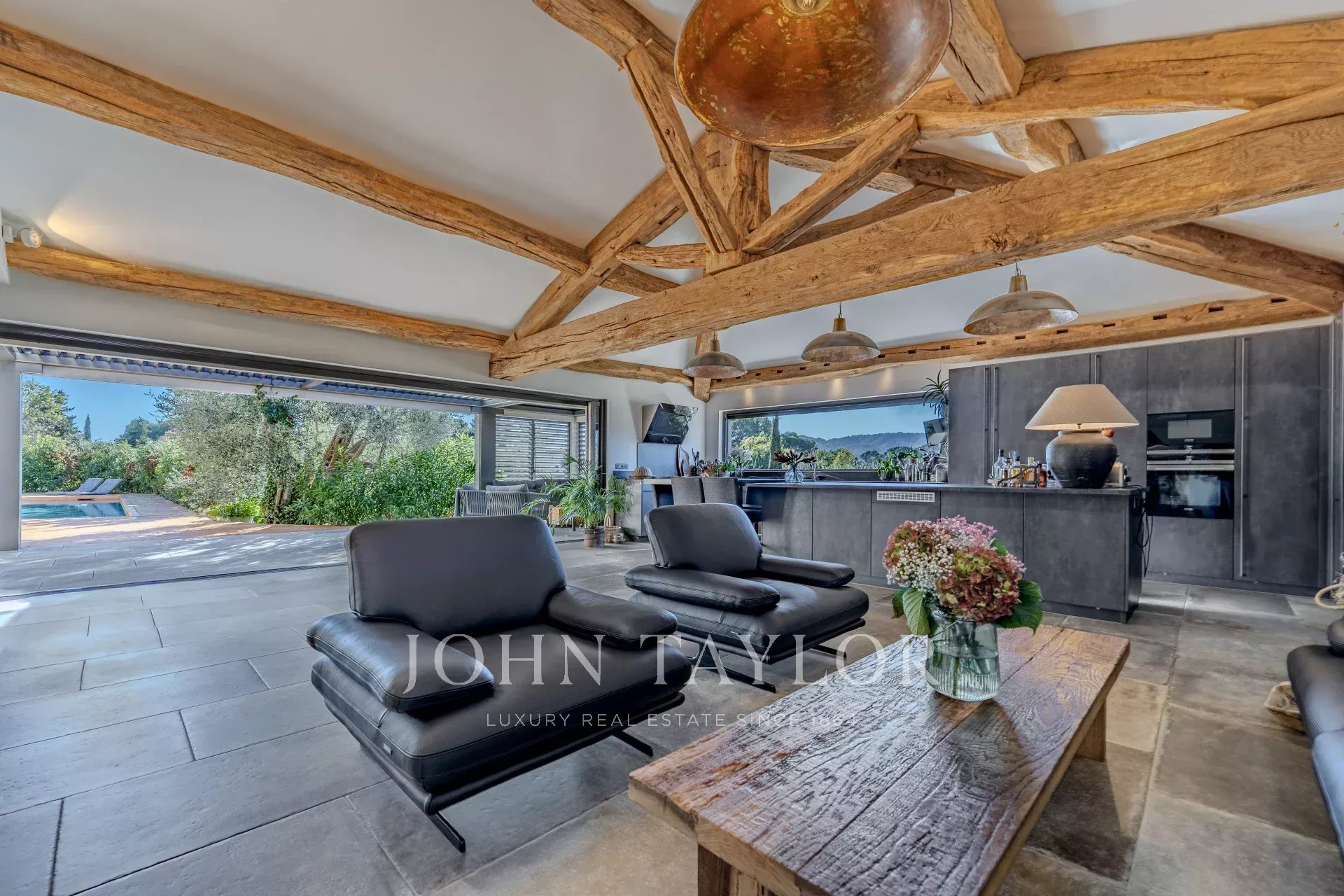 La vasta area di ricevimento comprende un soggiorno cattedrale, un'elegante sala da pranzo e una cucina di design open space di alta gamma, e si apre sulla terrazza ombreggiata da una pergola bioclimatica, offrendo una perfetta continuità tra interno ed esterno.