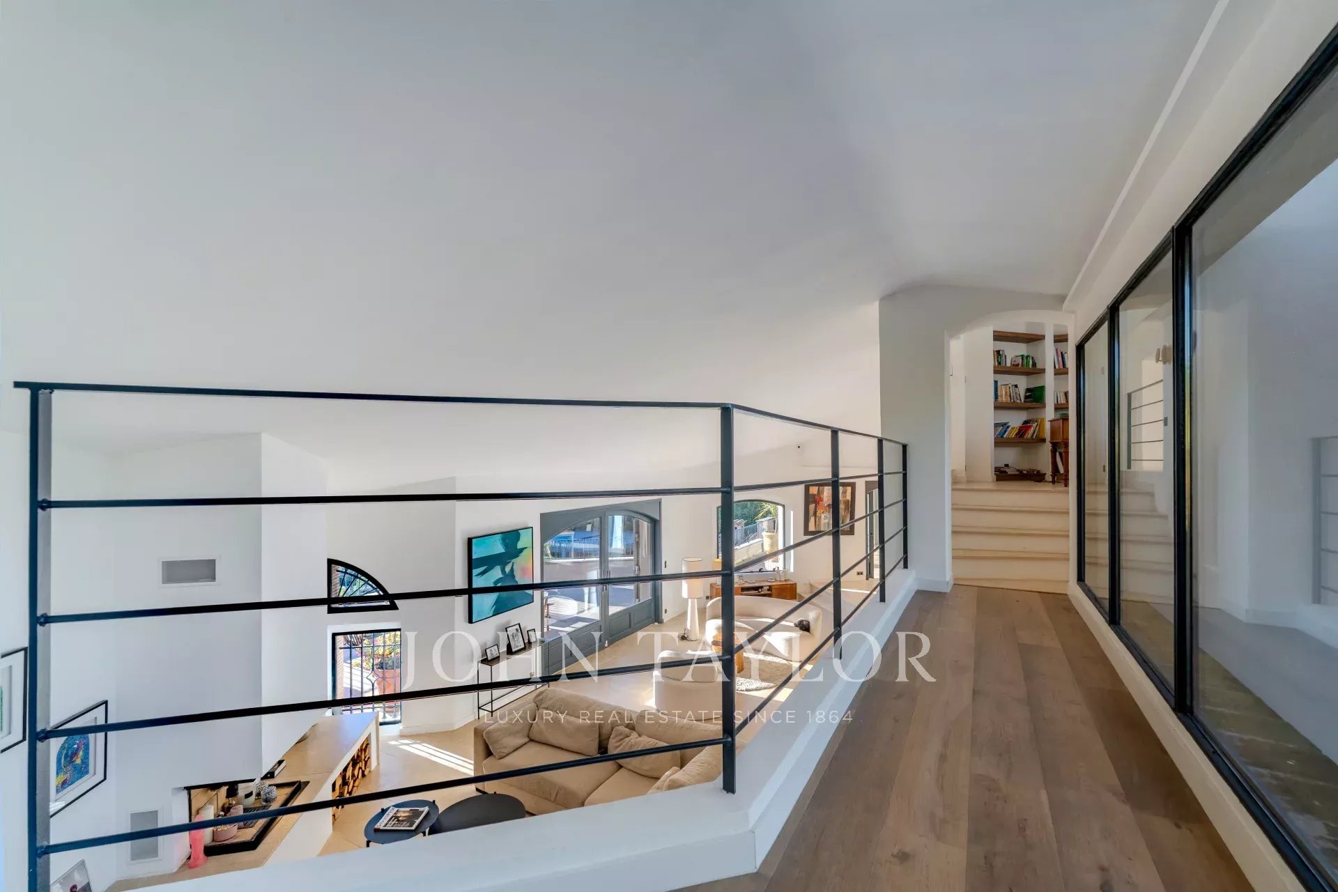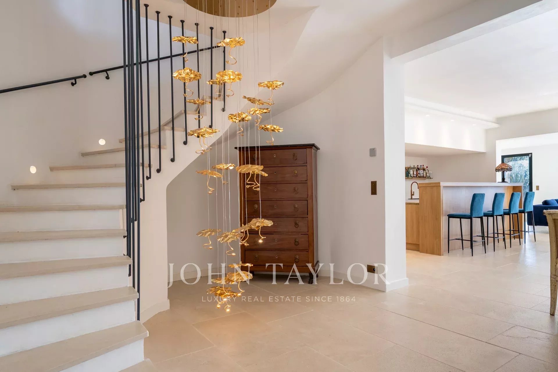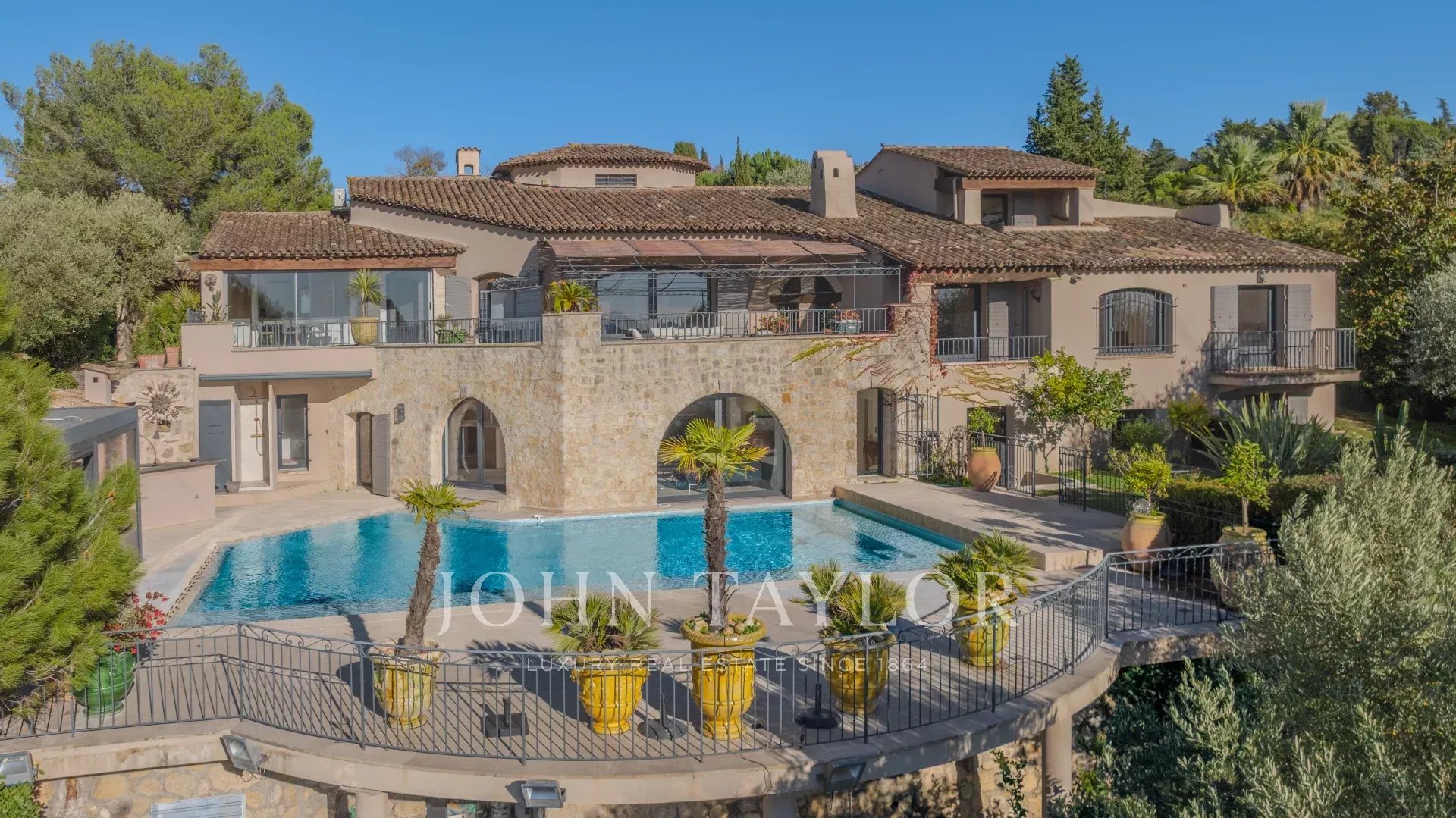 Eccezionale villa completamente ristrutturata in una delle zone più ricercate di Mougins, vicino all'Étang de Mougins, con vista ininterrotta sul mare e sul massiccio dell'Estérel. Costruita in pietra portoghese, questa sontuosa proprietà comprende un piano terra, un piano giardino e un primo piano.