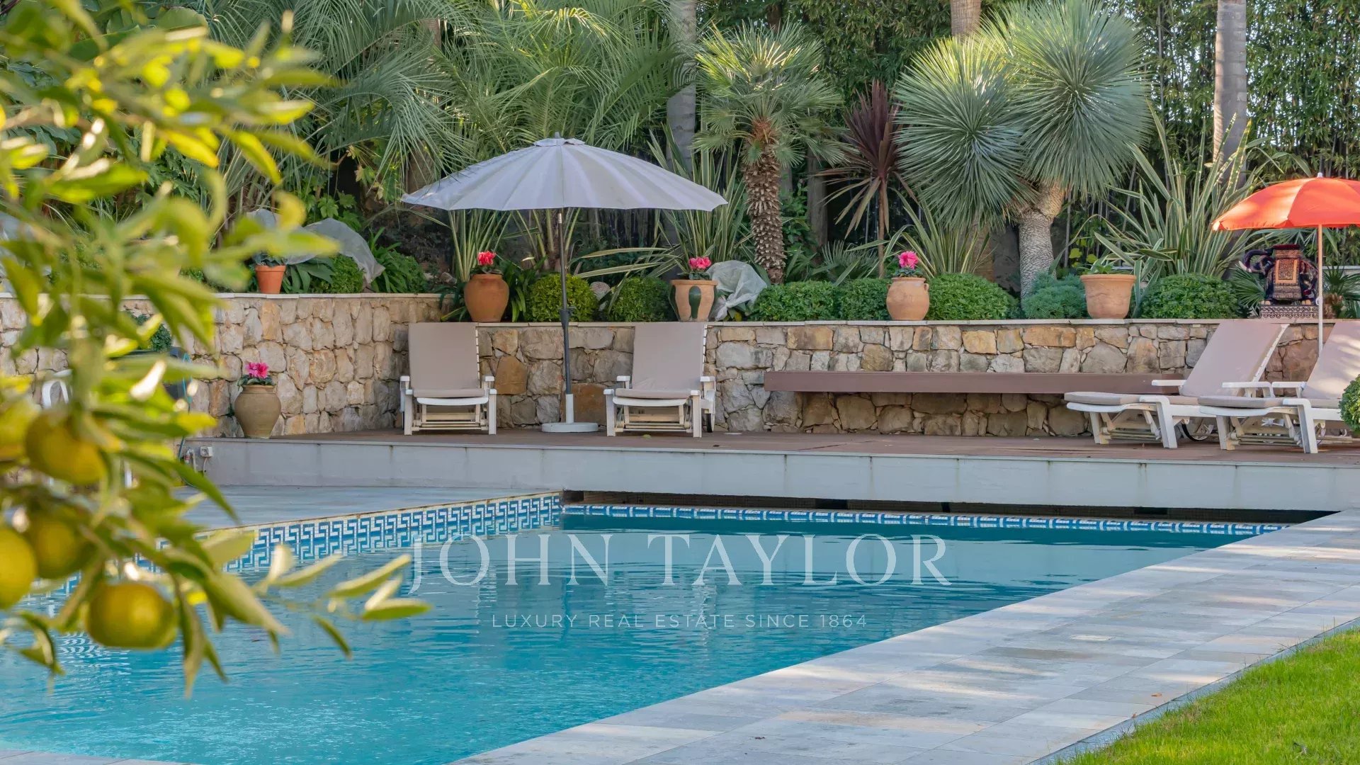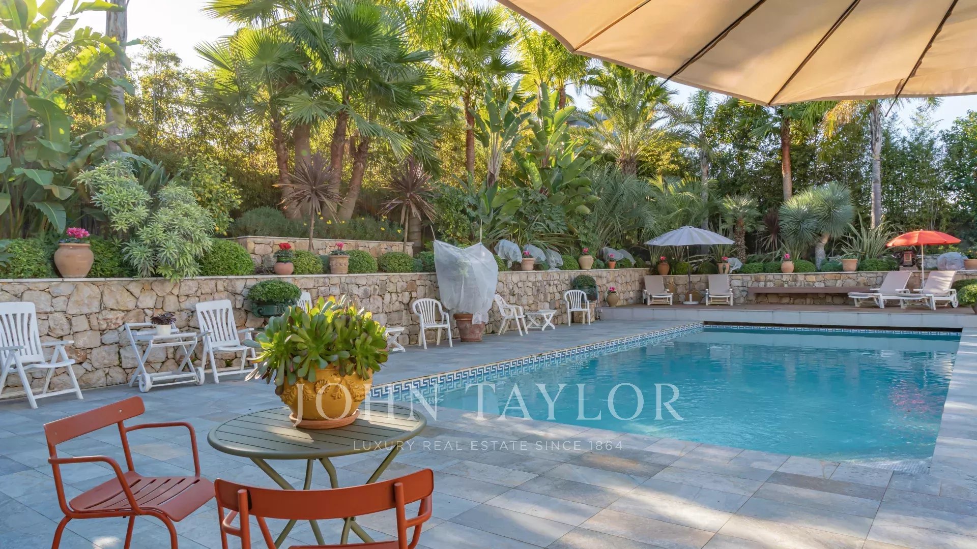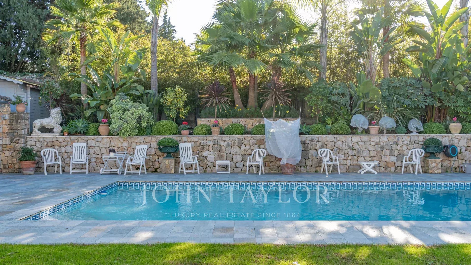 Il parco mediterraneo di 1.650 m² comprende una splendida piscina riscaldata di 11,5 x 5,5 m, con copertura elettrica per la massima sicurezza, e due capanni da giardino.