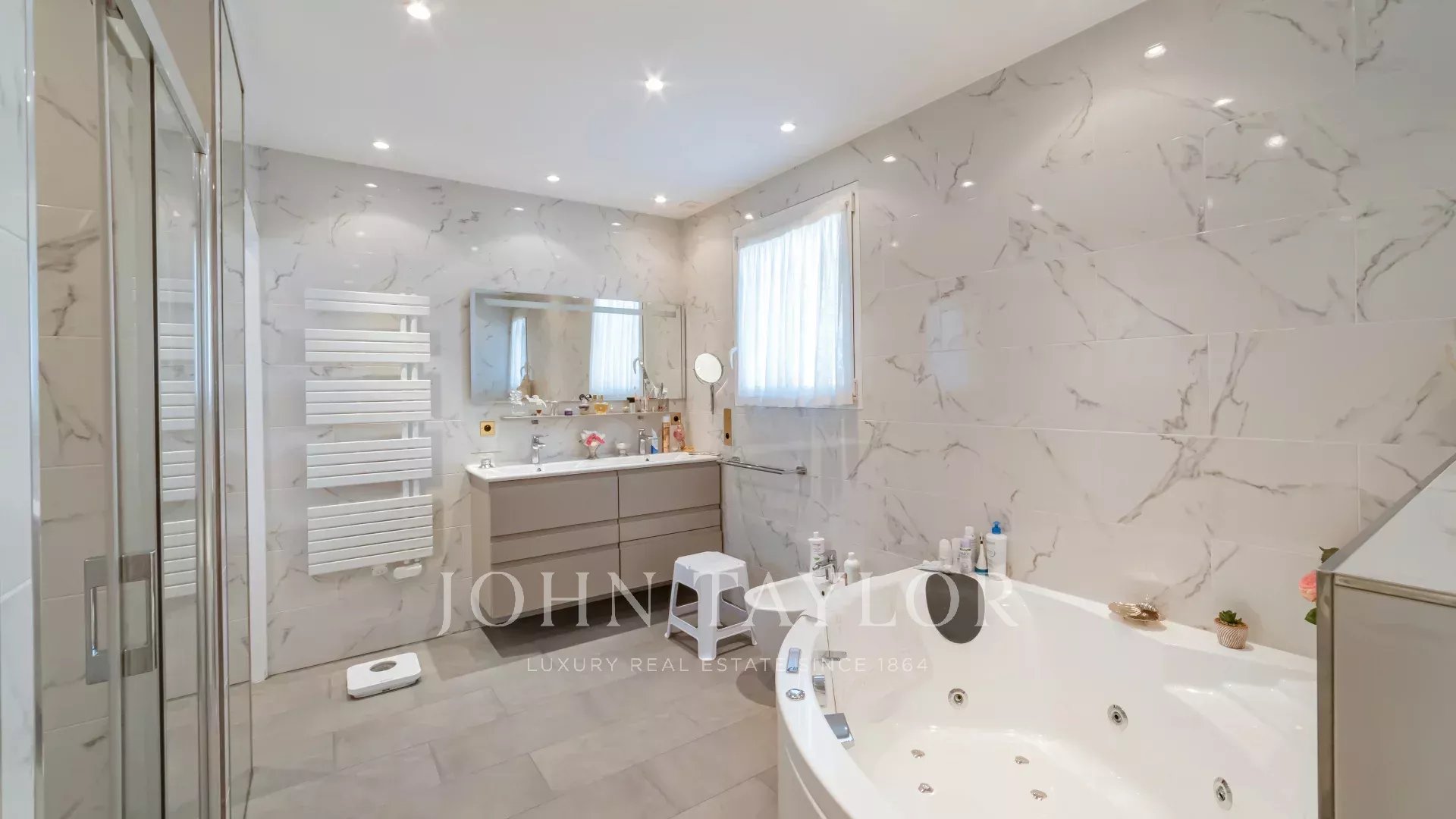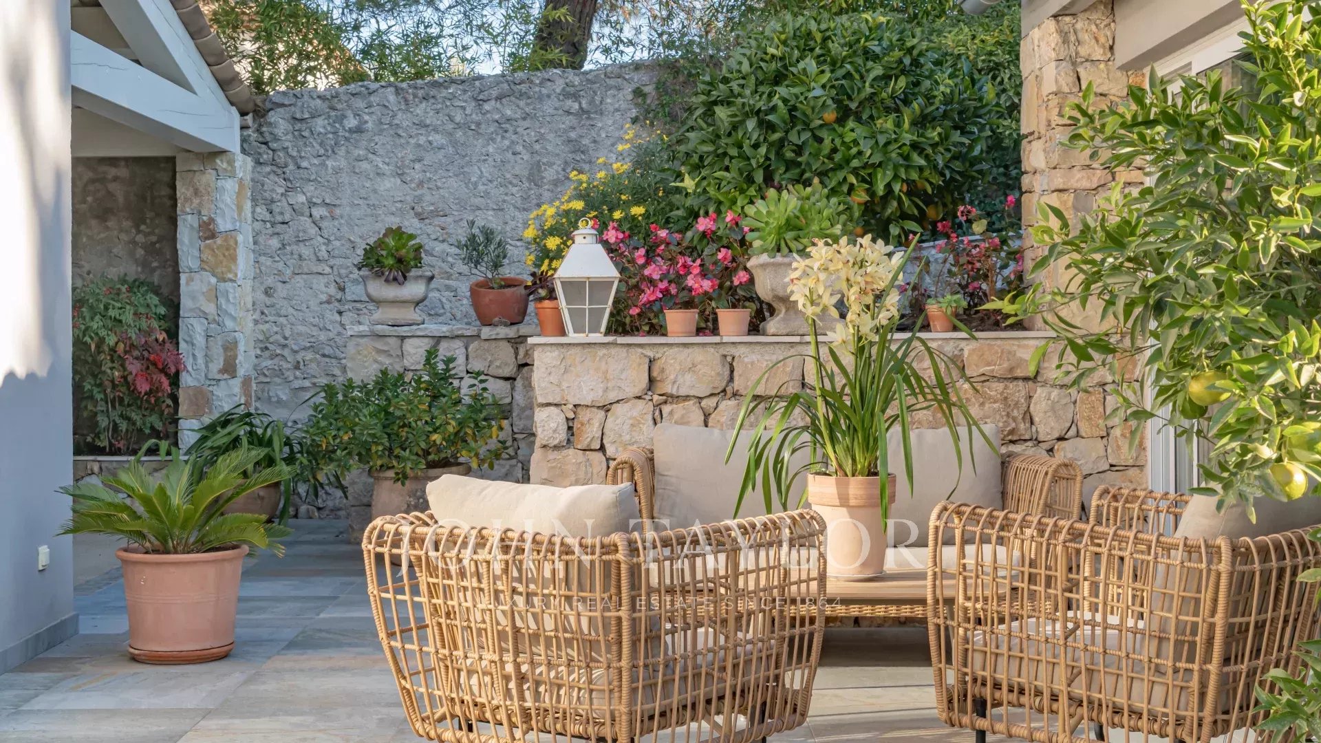 Al piano superiore, altre due suite e un grande spogliatoio offrono accesso diretto a una terrazza molto ampia con vista sul giardino.