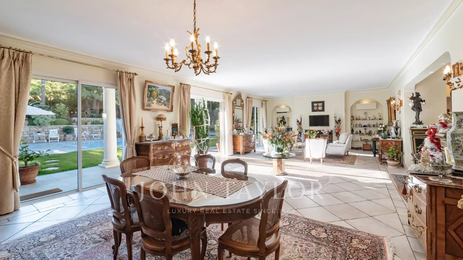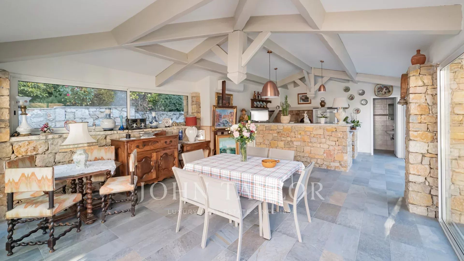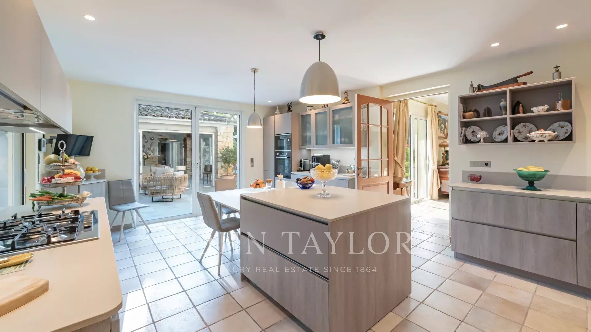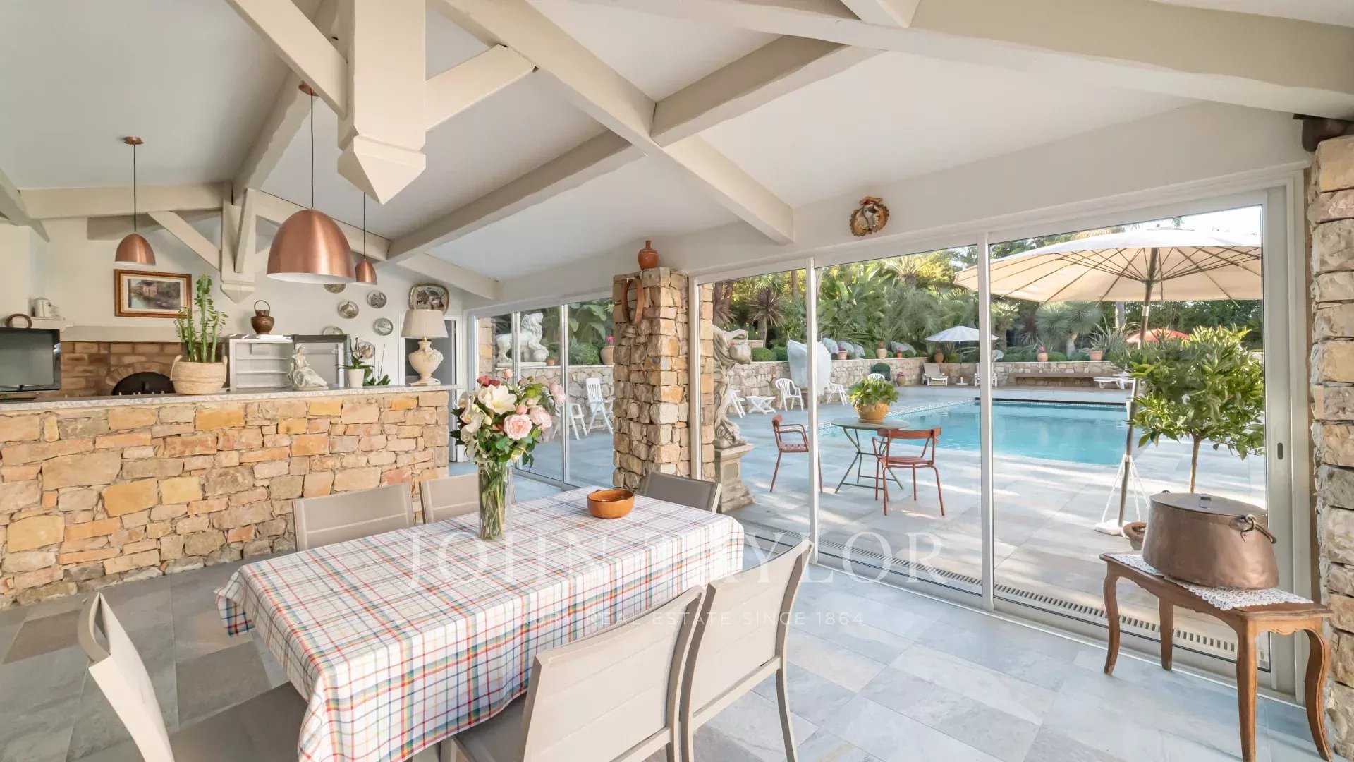 Il salone e la sala da pranzo, con il loro accogliente camino, si aprono su una moderna cucina completamente attrezzata con un funzionale ripostiglio. Tutti questi spazi abitativi si aprono su splendide terrazze, un sublime giardino con piscina e una pool house di 45 m², che può essere chiusa e riscaldata in inverno.
