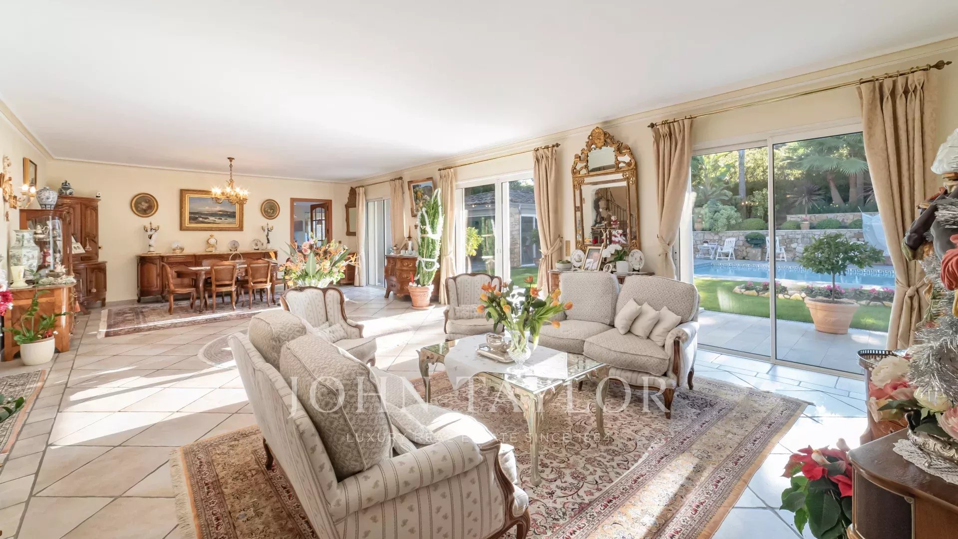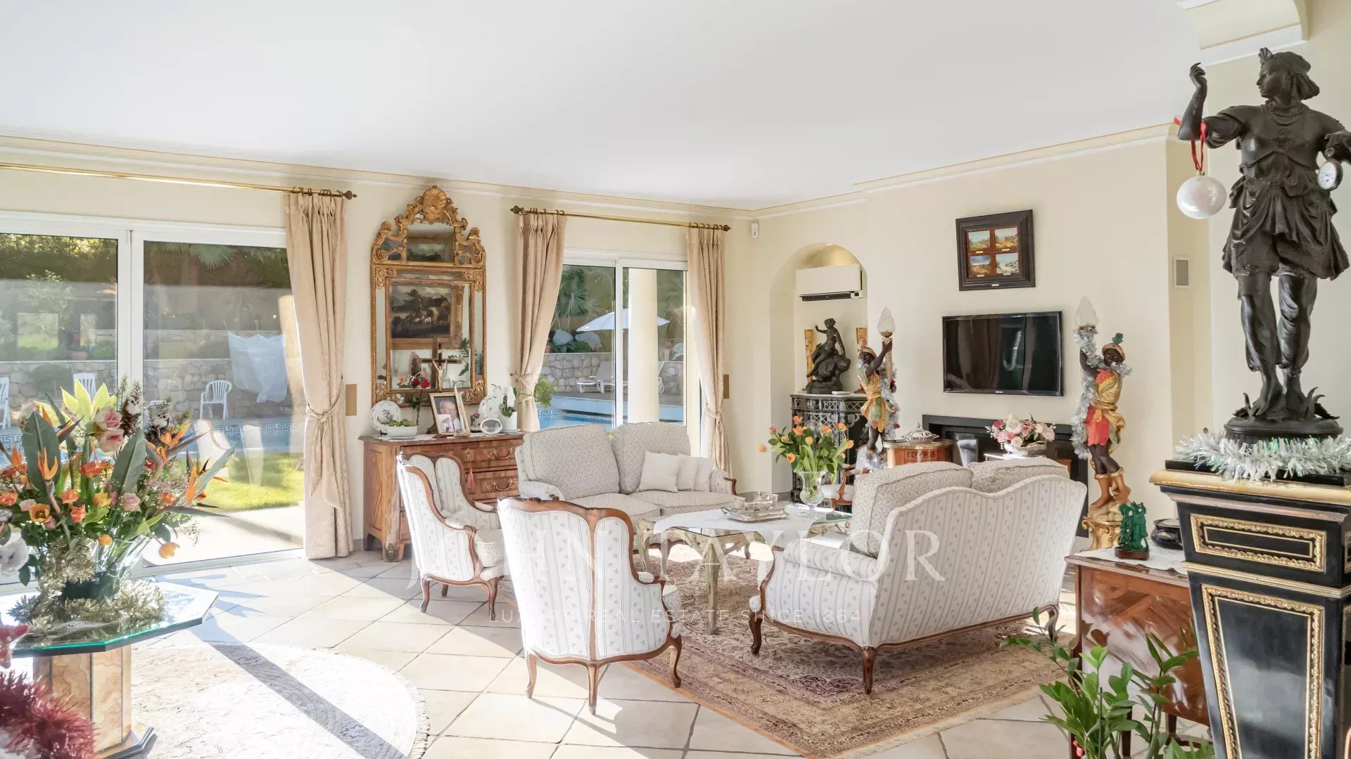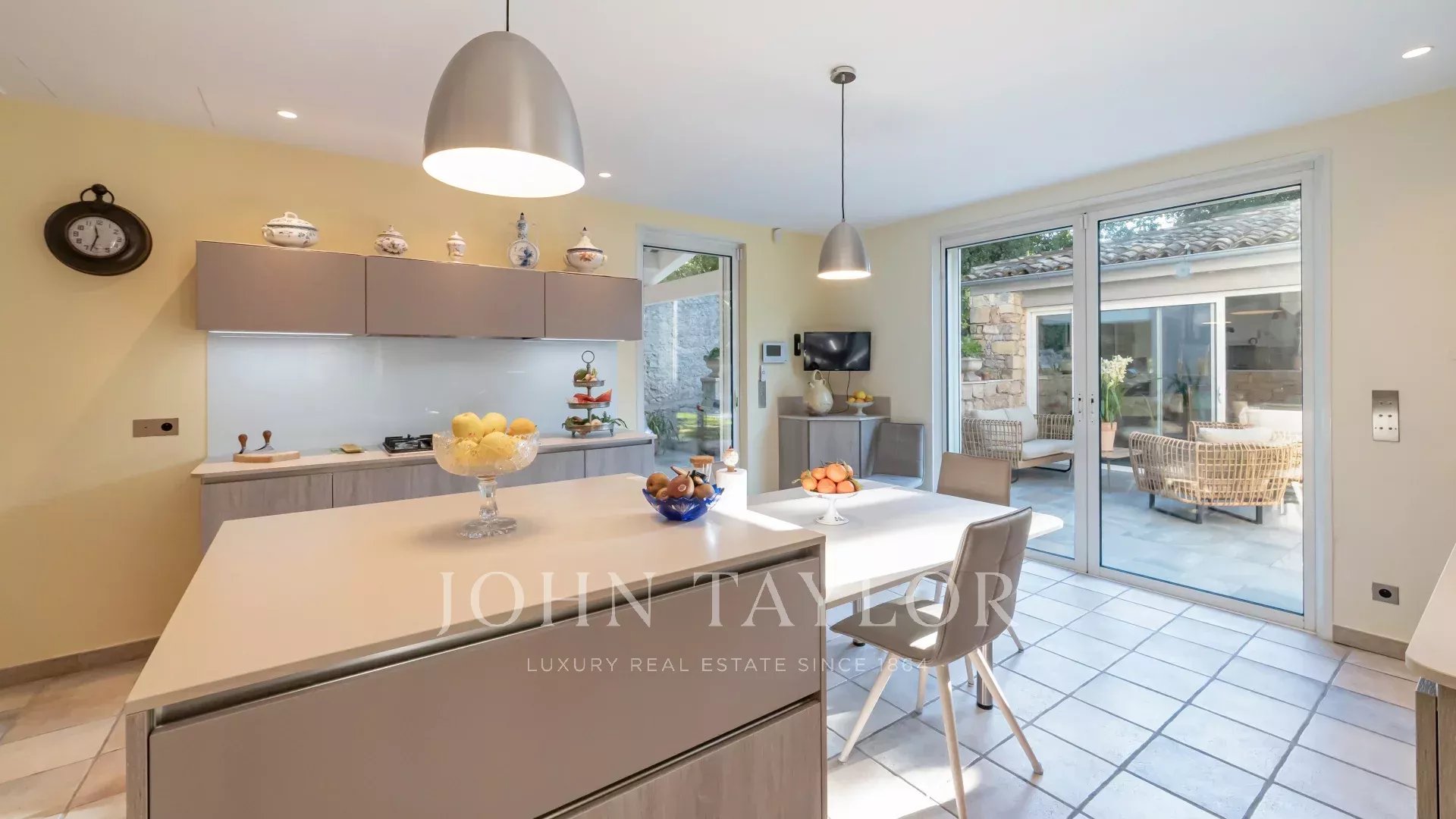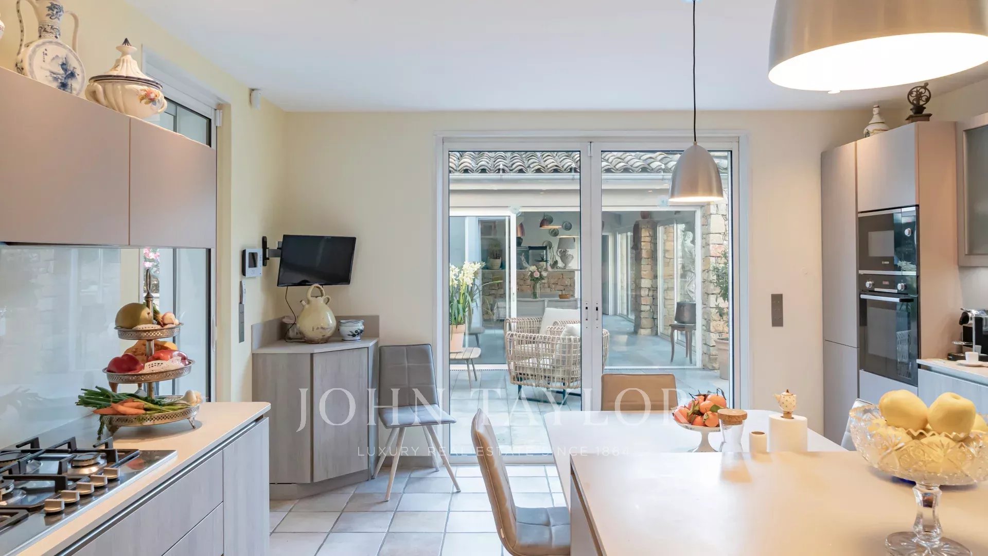 Il salone e la sala da pranzo, con il loro accogliente camino, si aprono su una moderna cucina completamente attrezzata con un funzionale ripostiglio. Tutti questi spazi abitativi si aprono su splendide terrazze, un sublime giardino con piscina e una pool house di 45 m², che può essere chiusa e riscaldata in inverno.